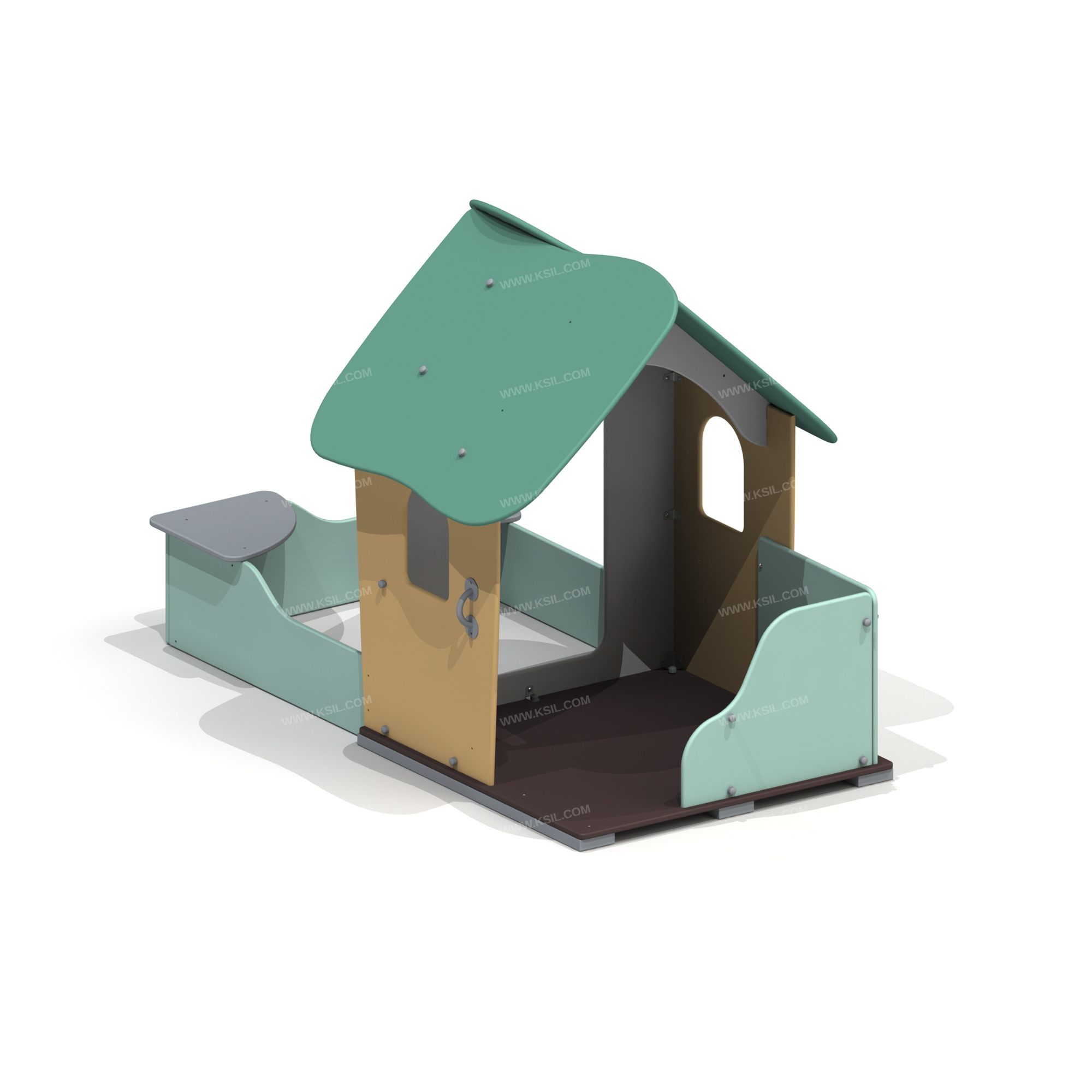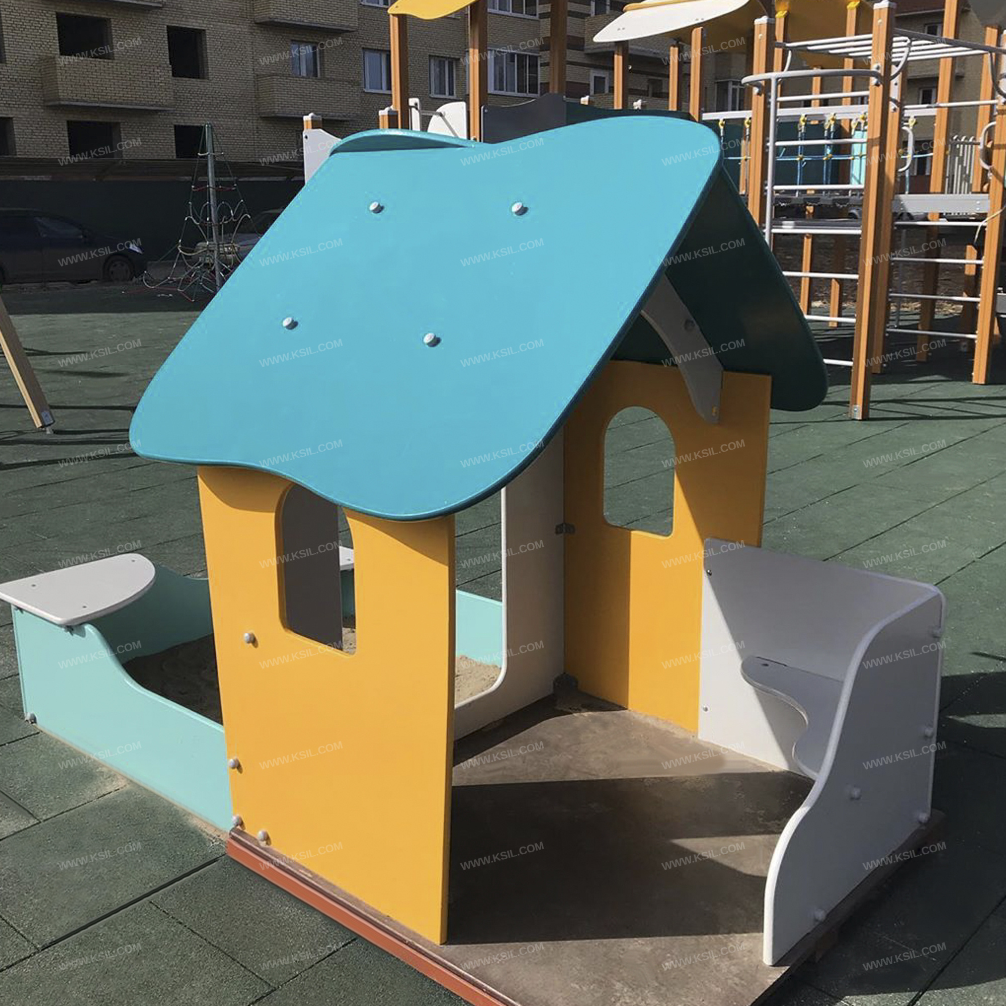Домик – беседка должен представлять собой устойчивую модульную конструкцию, обеспечивающую ребенку комфортные условия для игры на открытом воздухе.Конструкция должна состоять из домика с палисадником и песочницы.Домик должен иметь двухскатную крышу с волнообразной нижней гранью, стенку с входом, стенки с окошками в форме полукруглой арки, поручень. Палисадник должен иметь угловое ограждение, к которому крепится сиденье.Песочница должна состоять из бортов и угловых сидений. Пол домика и палисадника должен быть выполнен из влагостойкой противоскользящей фанеры толщиной не менее 21 мм. Стенки домика, скаты и фронтоны крыши, ограждения палисадника, борт песочницы, сидения, должны быть изготовлены из влагостойкой фанеры толщиной не менее 21 мм.