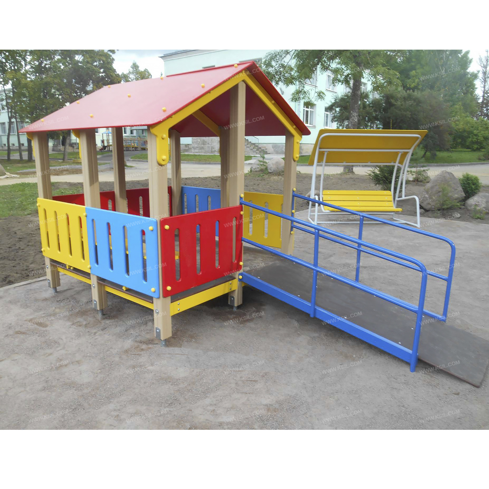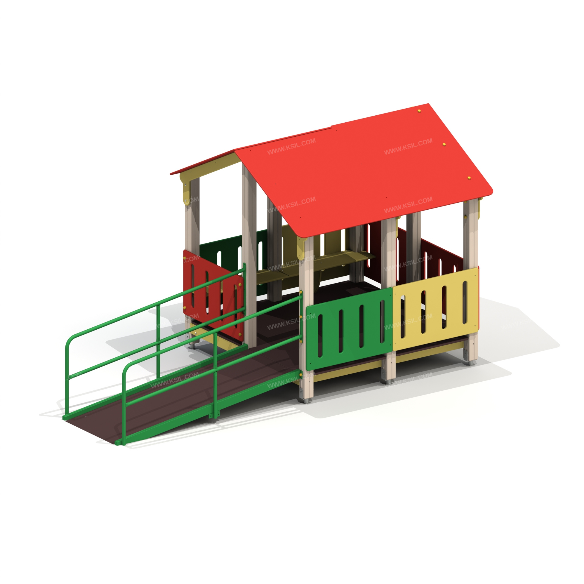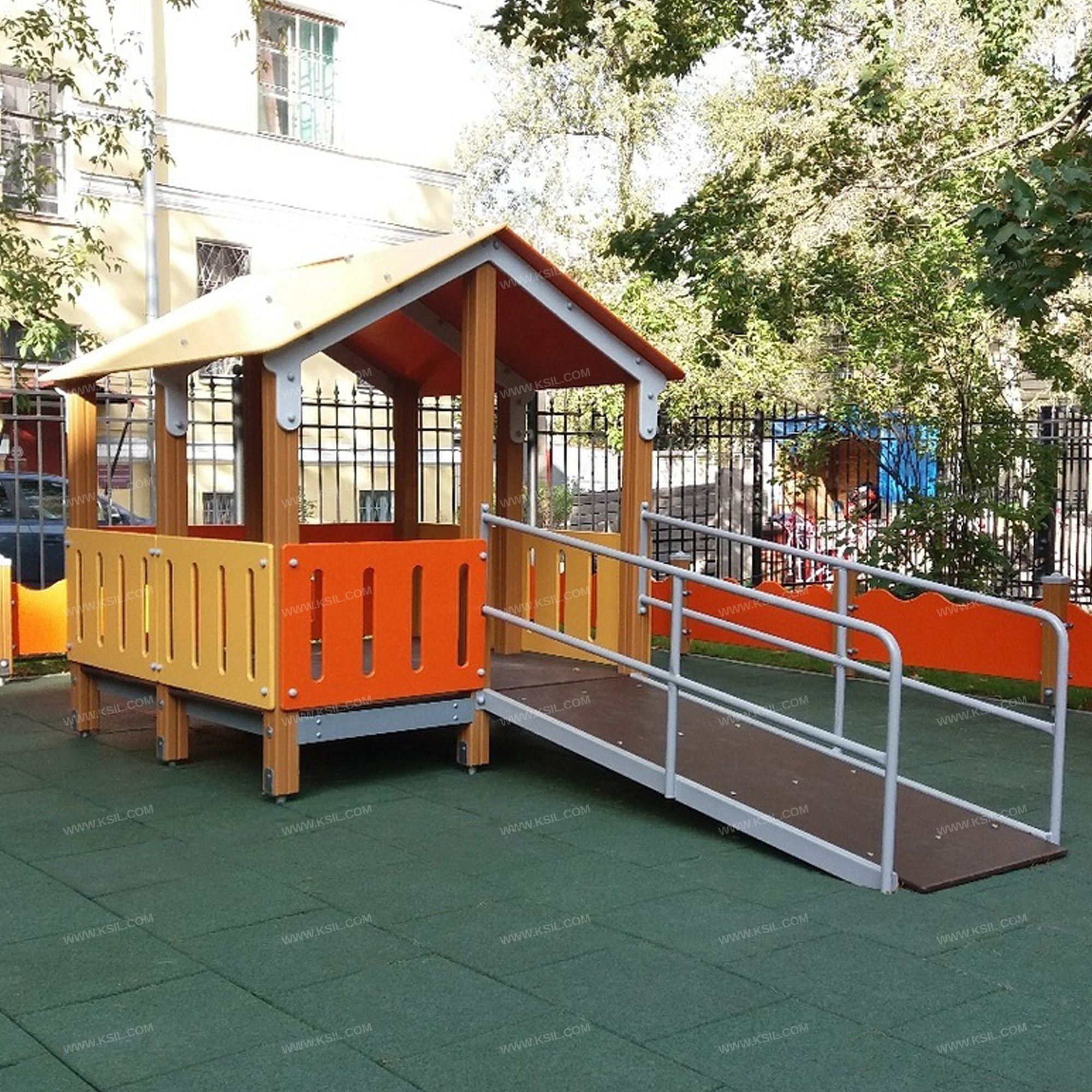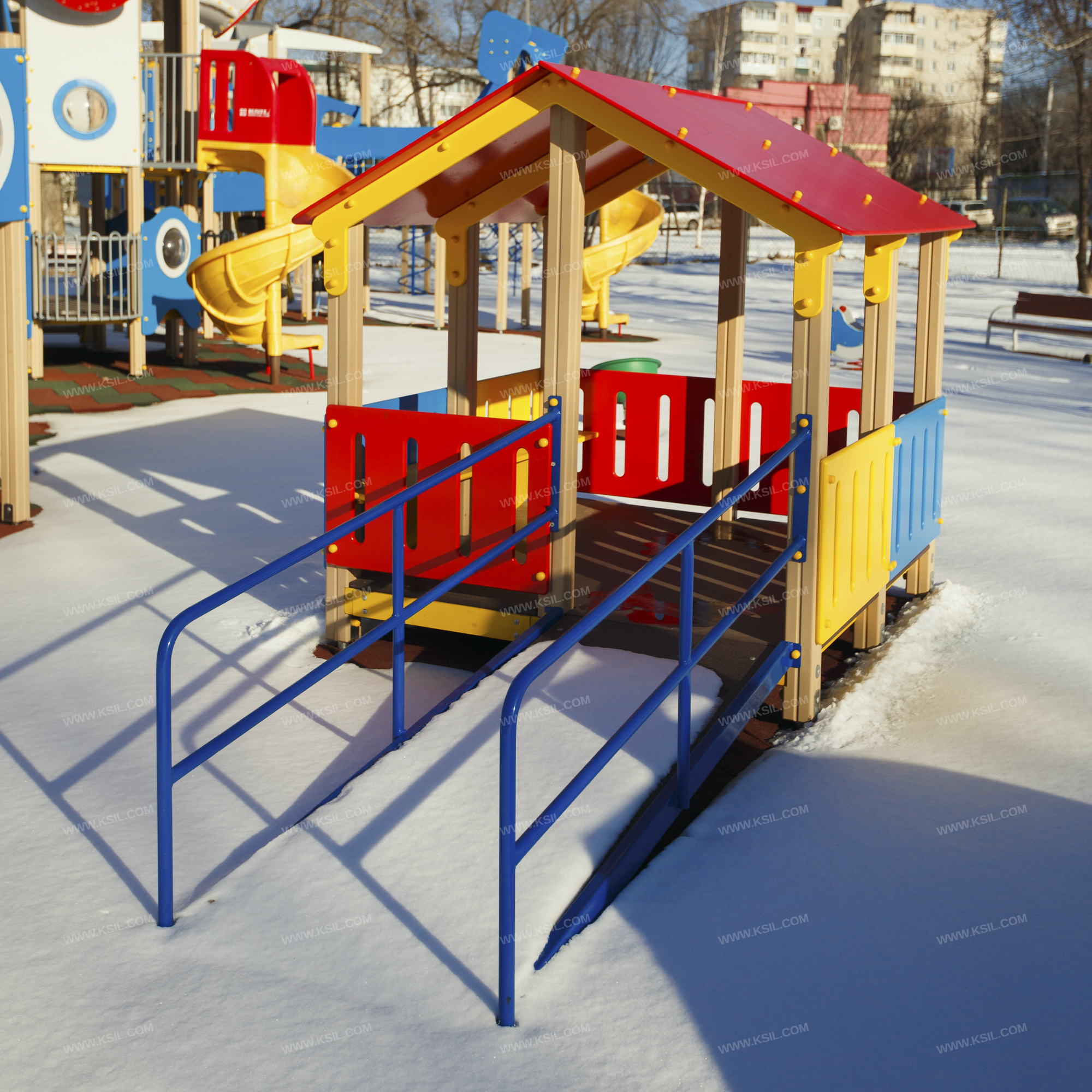 Манеж должен быть предназначен для детей с ограниченными физическими возможностями и представлять собой устойчивую, модульную конструкцию, обеспечивающую ребенку комфортные условия для игры на открытом воздухе.Манеж с крышей должен иметь площадку с 7-ю ограждениями. С одной стороны манежа к ограждению должна крепиться скамейка. Манеж должен иметь вход, оборудованный наклонным пандусом. Несущие столбы должны быть выполнены из клееного деревянного бруса сечением не менее 100х100 мм и иметь скругленный профиль с канавкой посередине. Снизу столб должен заканчиваться металлическим оцинкованным подпятником диаметром не менее 42 мм, который бетонируется в землю.Пол площадки должен быть выполнен из влагостойкой противоскользящей фанеры толщиной не менее 21 мм. Ограждения с отверстиями, скамейка должны быть изготовлены из влагостойкой фанеры толщиной не менее 21 мм.Крыша двухскатная должна состоять из скатов, выполненных из влагостойкой фанеры толщиной не менее 15 мм и фронтонов из влагостойкой фанеры толщиной не менее 21 мм Наклонный пандус должен состоять из настила и перил. Настил должен быть выполнен из влагостойкой противоскользящей фанеры толщиной не менее 21 мм. Перила должны быть выполнены из металлической трубы диаметром не менее 33 мм.
