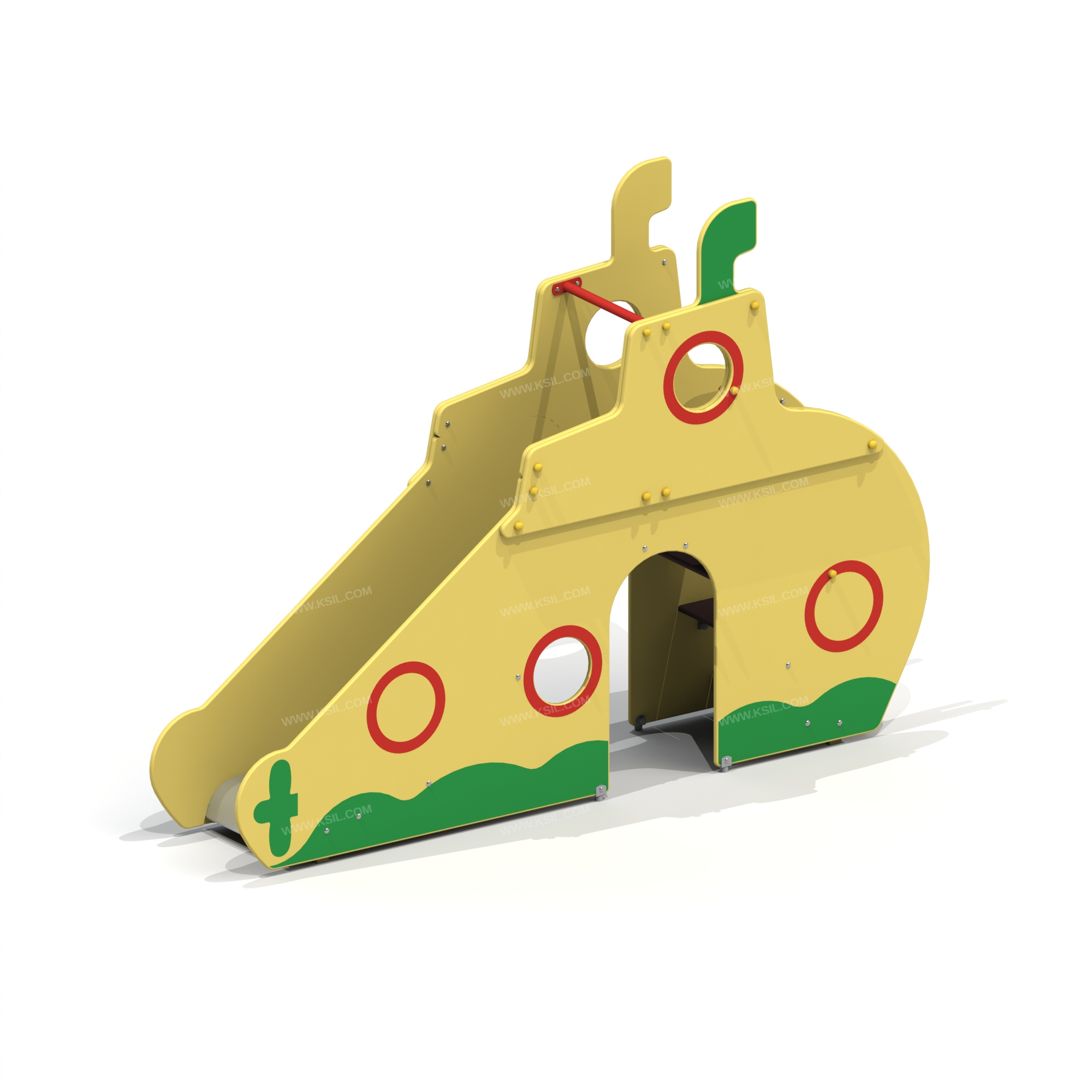 Горка должна быть стилизована под подводную лодку и представлять собой устойчивую конструкцию, обеспечивающую безопасное движение детей по наклонной поверхности скольжения под действием силы тяжести.Горка должна состоять из площадки, ската, бортиков, боковых стенок в виде подводной лодки с иллюминаторами и арками с художественной росписью, защитной перекладины и лестницы. Горка должна иметь стартовый участок высотой не менее 920 мм, участок скольжения и конечный участок. Скат должен быть изготовлен из единого листа нержавеющей стали толщиной 1,5 мм, утопленный в паз бортиков горки. Защитная перекладина должна быть выполнена из металлической трубы диаметром не менее 33 мм, побуждающая ребенка присесть и установлена на высоте не менее 600 мм от уровня поверхности стартового участка горки. Боковые стенки должны выполнять функцию защитной секции, бортиков горки и выполнены из влагостойкой фанеры толщиной не менее 21 мм. Бортики горки, выполненные из влагостойкой фанеры толщиной не менее 21 мм, должны быть высотой не менее 100 мм. Поручень лестницы должен быть выполнен из металлической трубы диаметром не менее 26 мм и крепиться к боковой стенке с внутренней стороны. Ступени лестницы должны быть выполнены из ламинированной противоскользящей влагостойкой фанеры толщиной не менее 21 мм. Расстояние между ступенями должно быть одинаковым.Пол площадки стартового участка горки должен быть выполнен из влагостойкой противоскользящей фанеры толщиной не менее 21 мм.