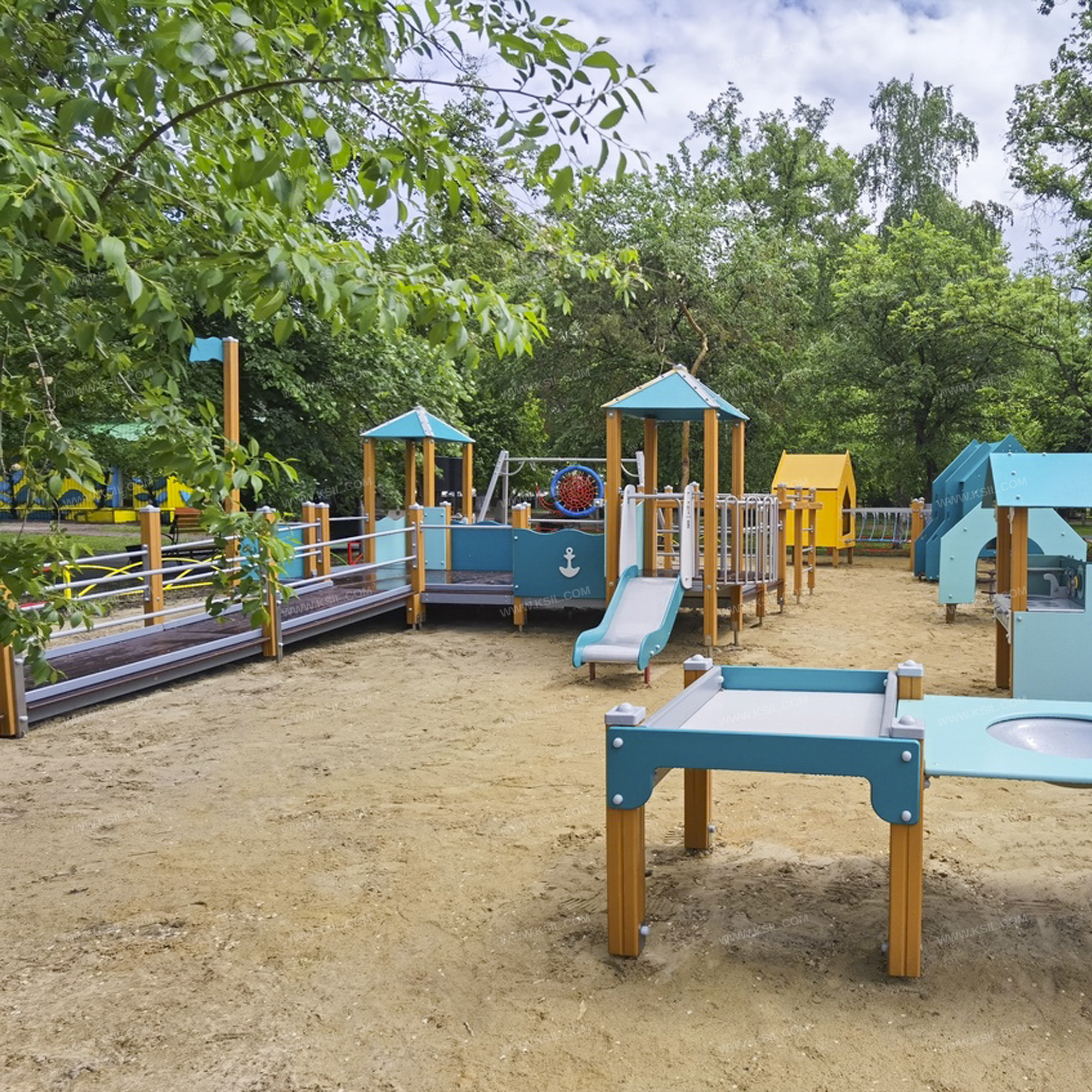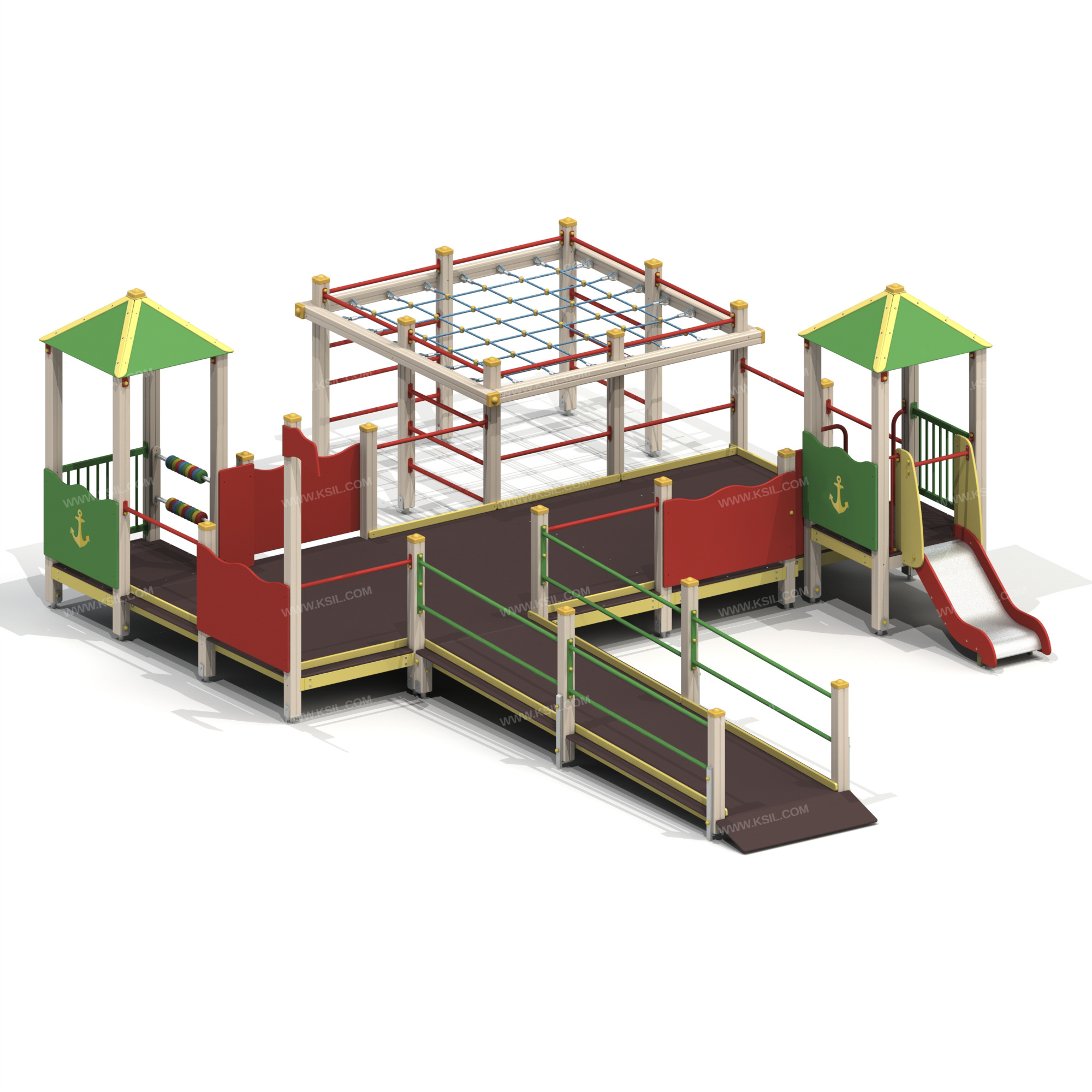 Детский игровой комплекс должен быть предназначен для детей с ограниченными возможностями и представлять собой модульную сборно-разборную конструкцию, состоящую из 2-х башен с крышами и единой площадки с вынесенным гимнастическим комплексом. К единой площадке должен быть пристроен подъем в виде пандуса К башне 1 с крышей, с высотой площадки не менее 650 мм должны быть пристроены: горка, ограждение в виде перекладин, металлическое ограждение.К башне 2 с крышей, с высотой площадки не менее 650 мм должны быть пристроены: фанерное ограждение, металлическое ограждение, счеты.К единой площадке должны быть пристроены ограждения в виде перекладин и фанерные ограждения, декоративный флаг, крепящийся к несущему столбу.Вынесенный гимнастический комплекс должен представлять собой конструкцию, состоящую из несущих столбов, установленных в три ряда, параллельно друг другу. В крайних рядах должно быть по три несущих столбов, расположенных на равном расстоянии друг от друга, в среднем ряду по два столба. В каждом ряду несущие стойки в верхней части должны быть соединены балками и горизонтальными столбами. В верхней части должна быть расположена полипропиленовая сетка, проемы гимнастического комплекса должны быть оснащены: шведскими стенками.Несущие столбы комплекса должны быть выполнены из клееного деревянного бруса сечением не менее 100х100 мм и иметь скругленный профиль с канавкой посередине. Сверху столб должен заканчиваться пластиковой заглушкой, снизу столб должен заканчиваться металлическим оцинкованным подпятником диаметром не менее 42 мм, который бетонируется в землю.Крыша башен должна состоять из 4-х скатов и 4-х наличников, выполненных из влагостойкой фанеры толщиной не менее 9 мм и соединенных между собой в верхней части колпаком.Ограждения должны быть выполнены из влагостойкой фанеры толщиной не менее 21 мм. Полы единой площадки и башни должны быть выполнены из влагостойкой противоскользящей фанеры толщиной не менее 21 мм. Горка должна состоять из ската, бортиков, защитной секции и защитной перекладины. Горка должна иметь стартовый участок высотой не менее 650 мм, участок скольжения и конечный участок. Скат должен быть изготовлен из единого листа нержавеющей стали толщиной 1,5 мм, утопленный в паз бортиков горки. Бортики горки должны быть высотой не менее 100 мм. Защитная перекладина должна быть выполнена из металлической трубы диаметром не менее 33 мм, побуждающая ребенка присесть и установлена на высоте не менее 600 мм от уровня поверхности стартового участка горки. Защитная секция горки должна быть выполнена из влагостойкой фанеры толщиной не менее 21 мм. Ограждение металлическое должно состоять из горизонтальных труб сечением не менее 50х25 мм и вертикальных труб диаметром не менее 21,3 мм, к горизонтальным трубам привариваются фланцы, выполненные из листового металла толщиной не менее 4мм. Ограждение в виде перекладин, перекладины шведской стенки, балки гимнастического комплекса должны быть выполнены из металлической трубы диаметром не менее 33 мм. Наклонный пандус должен состоять из настила и перил. Настил должен быть выполнен из влагостойкой противоскользящей фанеры толщиной не менее 21 мм. Перила должны быть выполнены из металлической трубы диаметром не менее 33 мм.