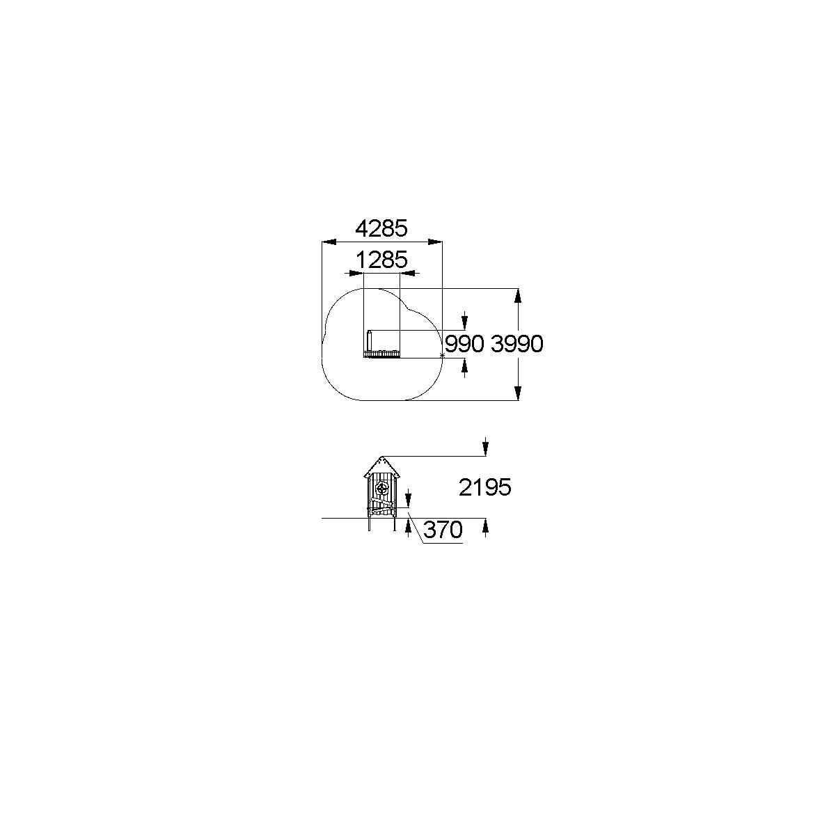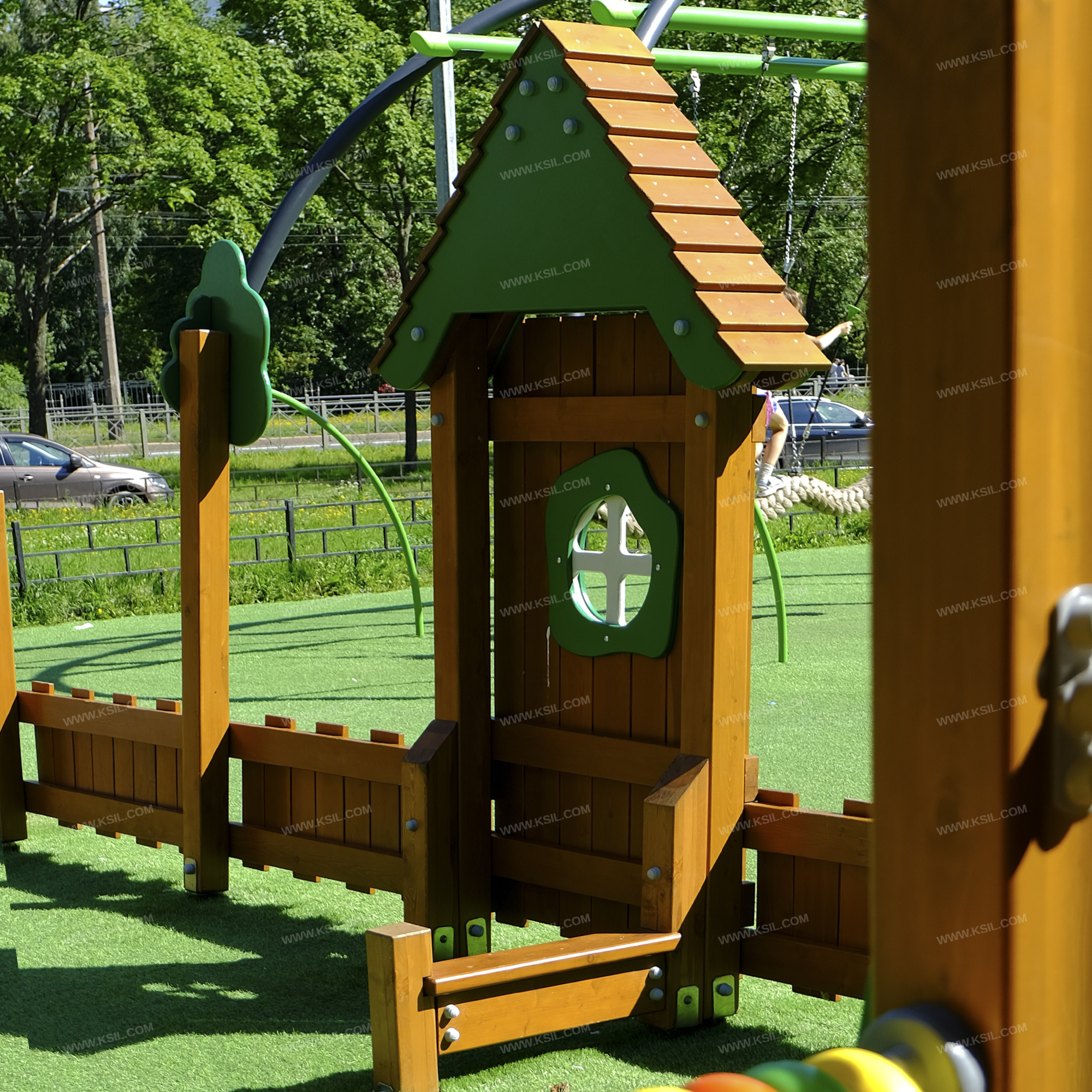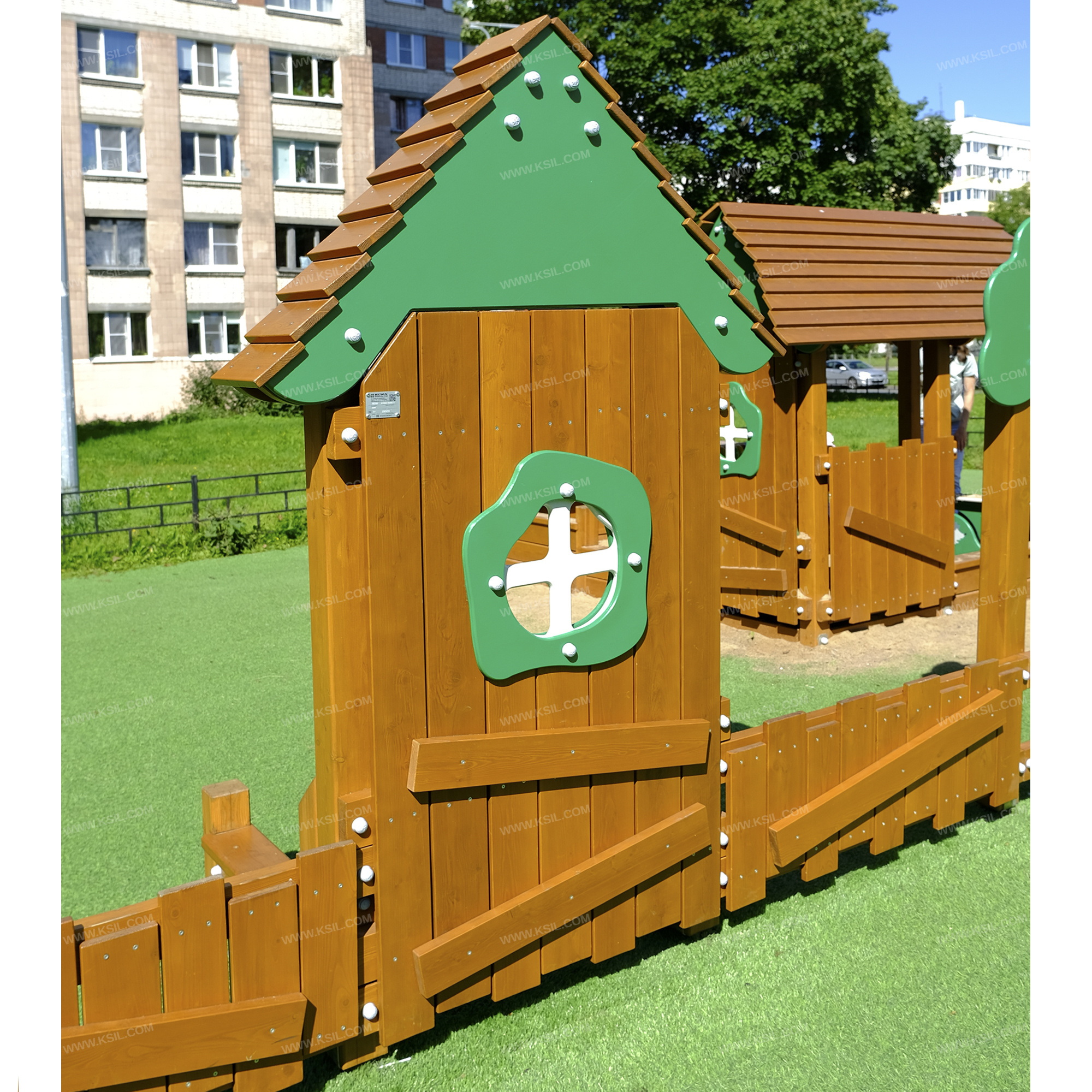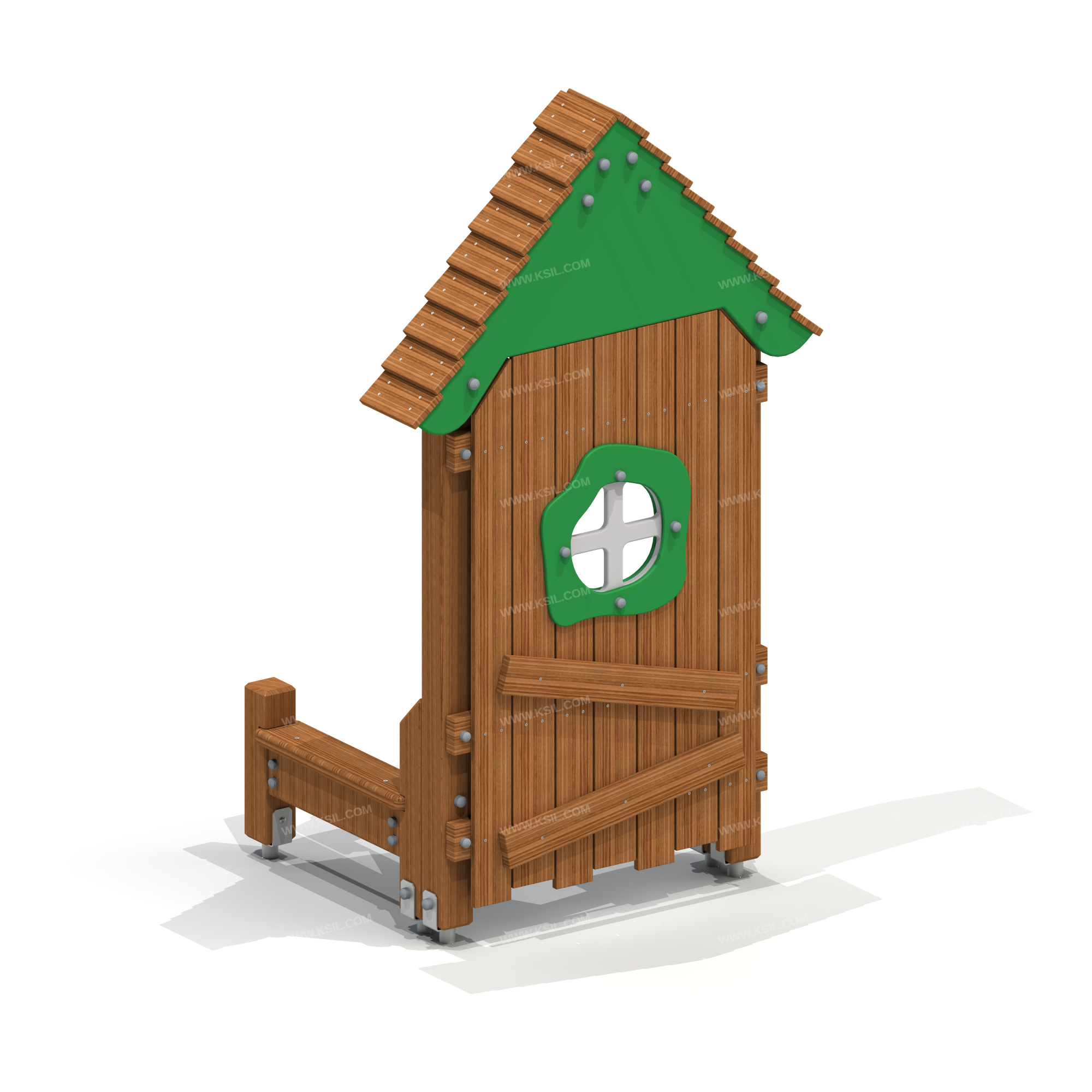 Игровая панель “Домик” является составной частью ограждения площадки в стиле Larix в природной тематике. Игровая панель должна состоять из несущих стоек, скамейки и игровой панели с окном и крышей в виде домика.Несущие столбы должны быть выполнены из клееного деревянного бруса лиственницы сечением не менее 100х100 мм и иметь скругленный профиль. Несущие столбы снизу крепятся на металлический оцинкованный подпятник с диаметром трубы не менее 42 мм, который бетонируется в землю.Игровая панель, имитирующая домик, должна быть выполнена в виде наборного ограждения с окном и крышей.Ограждение наборное с окном состоит из направляющих досок лиственницы сечением 40х100мм, на которые крепятся вертикальные доски лиственницы сечением 115х20 мм и 130х20 мм, окно из влагостойкой фанеры толщиной не менее 21 мм и наличники с двух сторон из влагостойкой фанеры толщиной не менее 15 мм.Крыша состоит из двух скатов, которые выполнены из деревянных досок лиственницы сечением не менее 115х20, деревянных стропил из досок лиственницы сечением не менее 140х40 и декоративных накладок, выполненных из влагостойкой фанеры толщиной не менее 21 мм. Стропила крыши соединяются между собой с помощью пластины, выполненной из листового металла толщиной не менее 4 мм. К одному столбу закреплена скамейка, выполненная из доски лиственницы сечением не менее 140х40 мм.