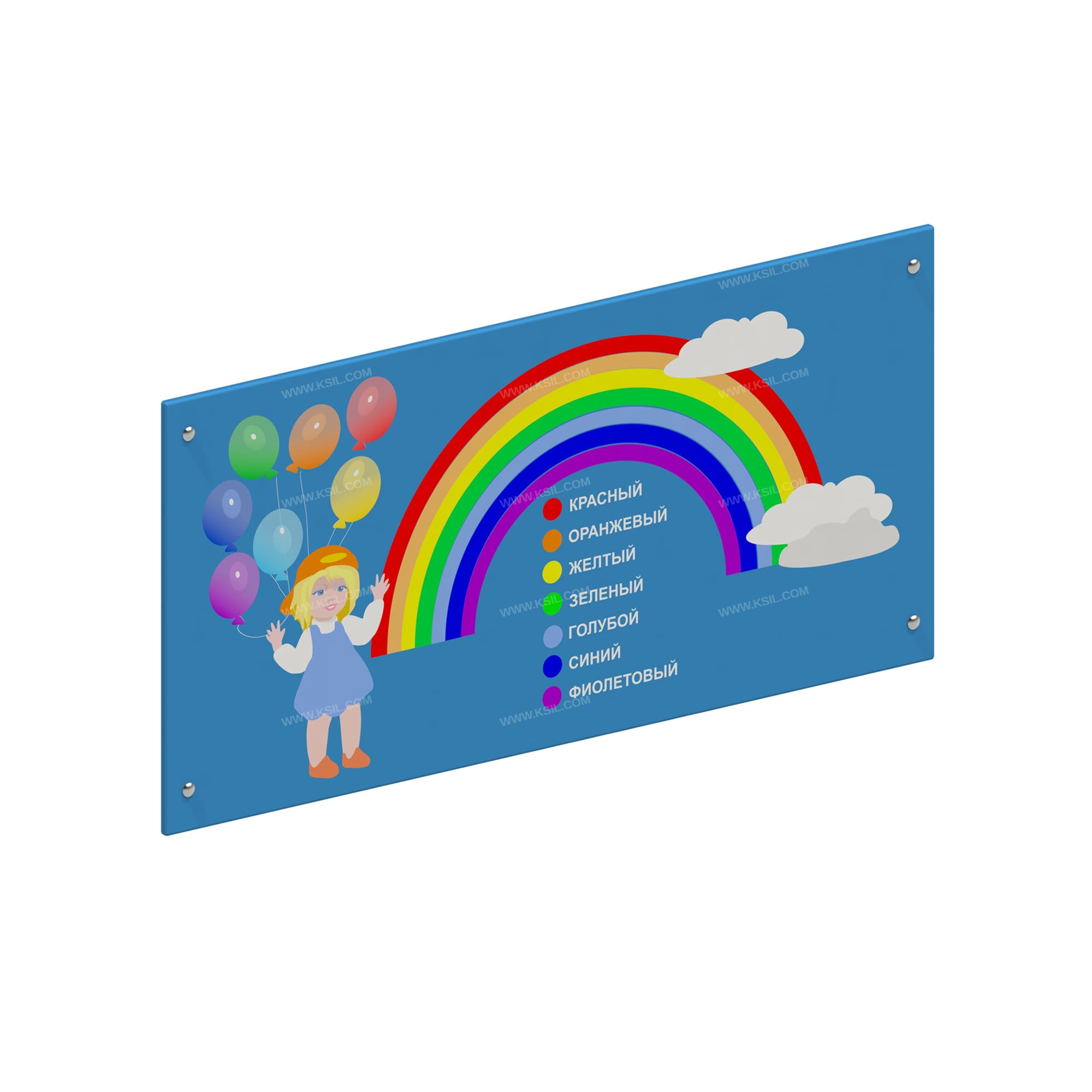 Игровая панель должна быть выполнена из влагостойкой фанеры толщиной не менее 15 мм с художественной росписью радуги с облаками и надписью цветов, девочки с разноцветными шариками.
