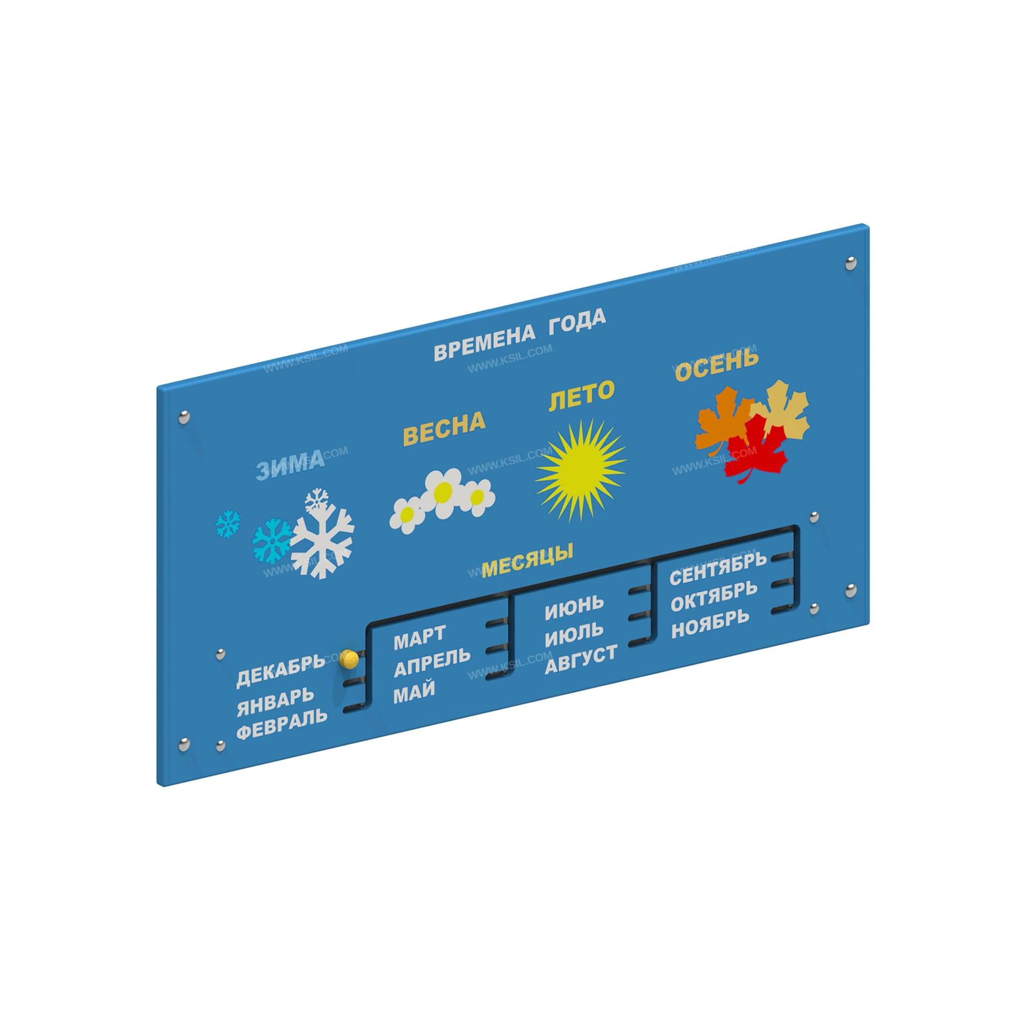 Игровая панель должна быть выполнена из влагостойкой фанеры толщиной не менее 21 мм с художественной росписью времена года: зима, весна, лето и осень с указанием месяцев.