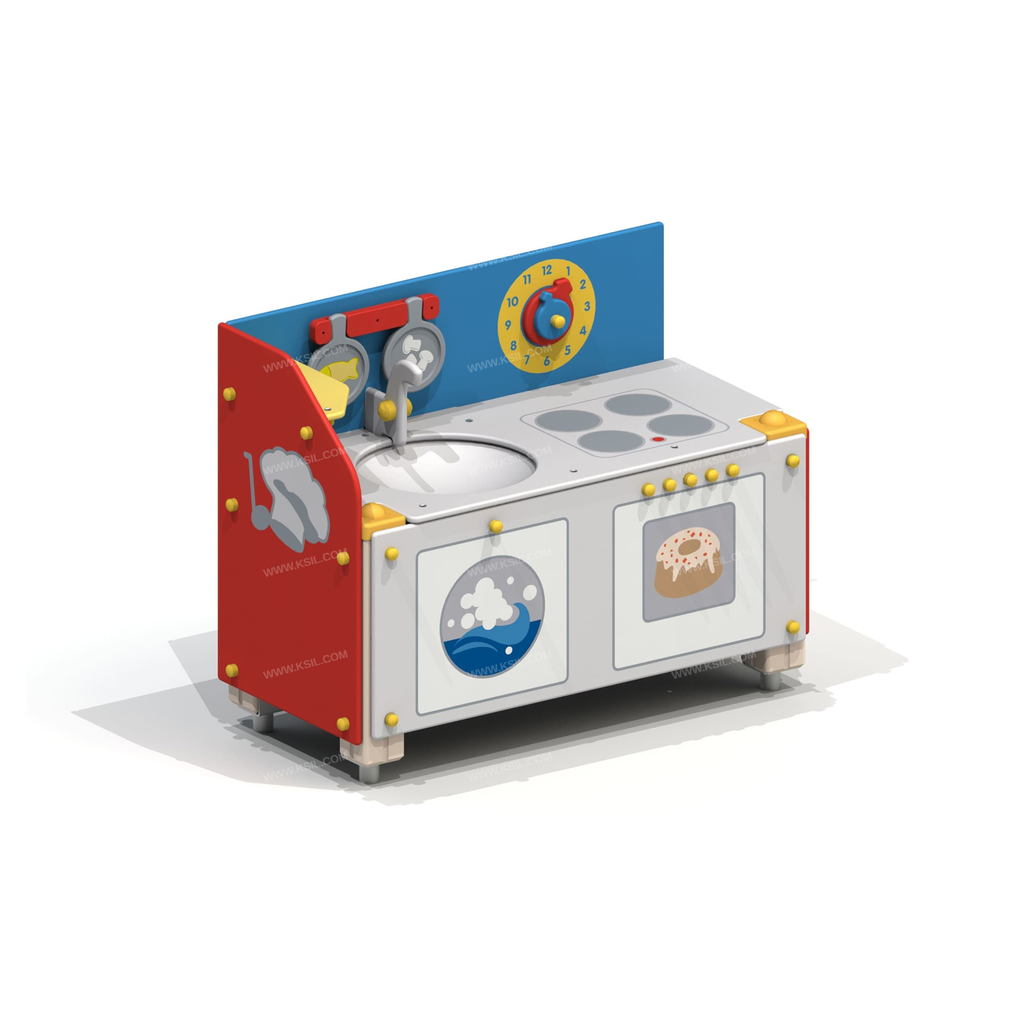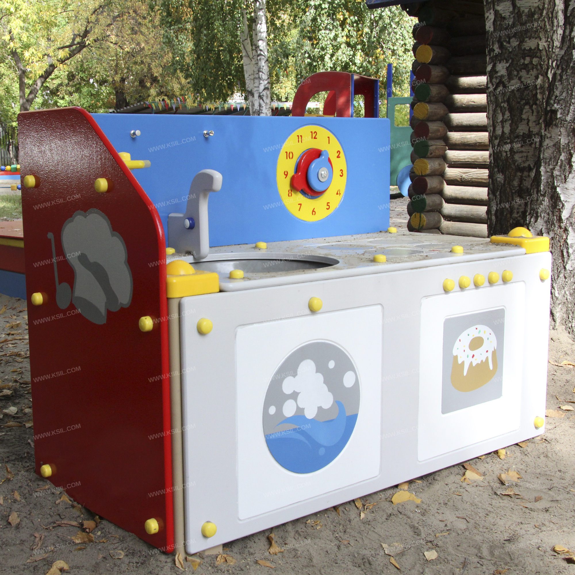 Кухня должна представлять собой устойчивую, модульную конструкцию и состоять из игровых и развивающих элементов, обеспечивающие ребенку комфортные условия для игры на открытом воздухе. Конструкция должна состоять из рабочей поверхности со столешницей, боковых и задней стенок с художественным оформлением на заданную тематику. Кухня должна включать в себя: пластиковую мойку выпуклой формы с краном, плиту с конфорками, духовку, посудомойку, часы, сковородки, полку.Несущие столбы должны быть выполнены из клееного деревянного бруса сечением не менее 100х100 мм и иметь скругленный профиль с канавкой посередине. Снизу столб должен заканчиваться металлическим оцинкованным подпятником диаметром не менее 42 мм, который бетонируется в землю.Стенки, столешница, полка должны быть выполнены из влагостойкой окрашенной фанеры толщиной не менее 15 мм. Декоративные элементы должны быть выполнены из влагостойкой фанеры толщиной не менее 15 мм.