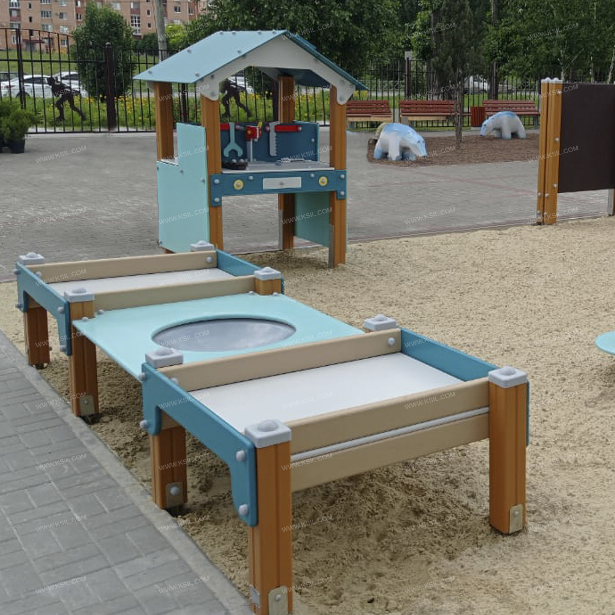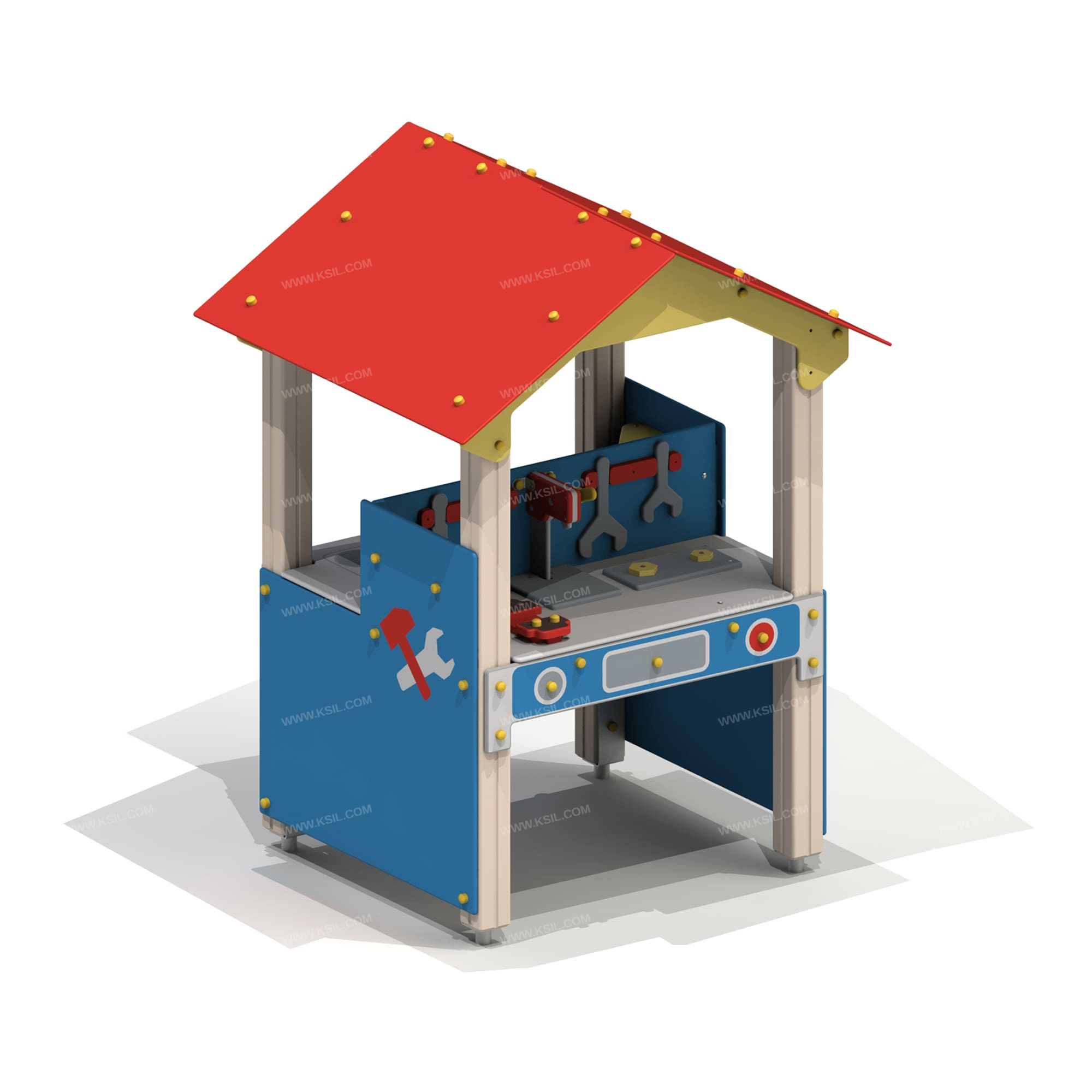 Мастерская-кухня должна представлять собой устойчивую, модульную конструкцию для детей с ограниченными физическими возможностями и состоять из игровых и развивающих элементов, обеспечивающие ребенку комфортные условия для игры на открытом воздухе. Конструкция должна состоять из башни с крышей.К башне должны быть пристроены: столешница, перегородка, боковые стенки с художественным оформлением на заданную тематику, кухня и мастерская.Кухня должна включать в себя: пластиковую мойку выпуклой формы с краном, плиту с конфорками, часы, сковородки, полку. Мастерская должна включать в себя: полку, рабочий станок, гаечные ключи, зубила, ножовку, гайки, тиски.Несущие столбы должны быть выполнены из клееного деревянного бруса сечением не менее 100х100 мм и иметь скругленный профиль с канавкой посередине. Снизу столб должен заканчиваться металлическим оцинкованным подпятником диаметром не менее 42 мм, который бетонируется в землю.Боковые стенки, столешница, полки, перегородки должны быть выполнены из влагостойкой окрашенной фанеры толщиной не менее 15 мм. Декоративные элементы должны быть выполнены из влагостойкой фанеры толщиной не менее 15 мм. Крыша двухскатная должна состоять из скатов, выполненных из влагостойкой фанеры толщиной не менее 9 мм и фронтонов из влагостойкой фанеры толщиной не менее 15 мм.
