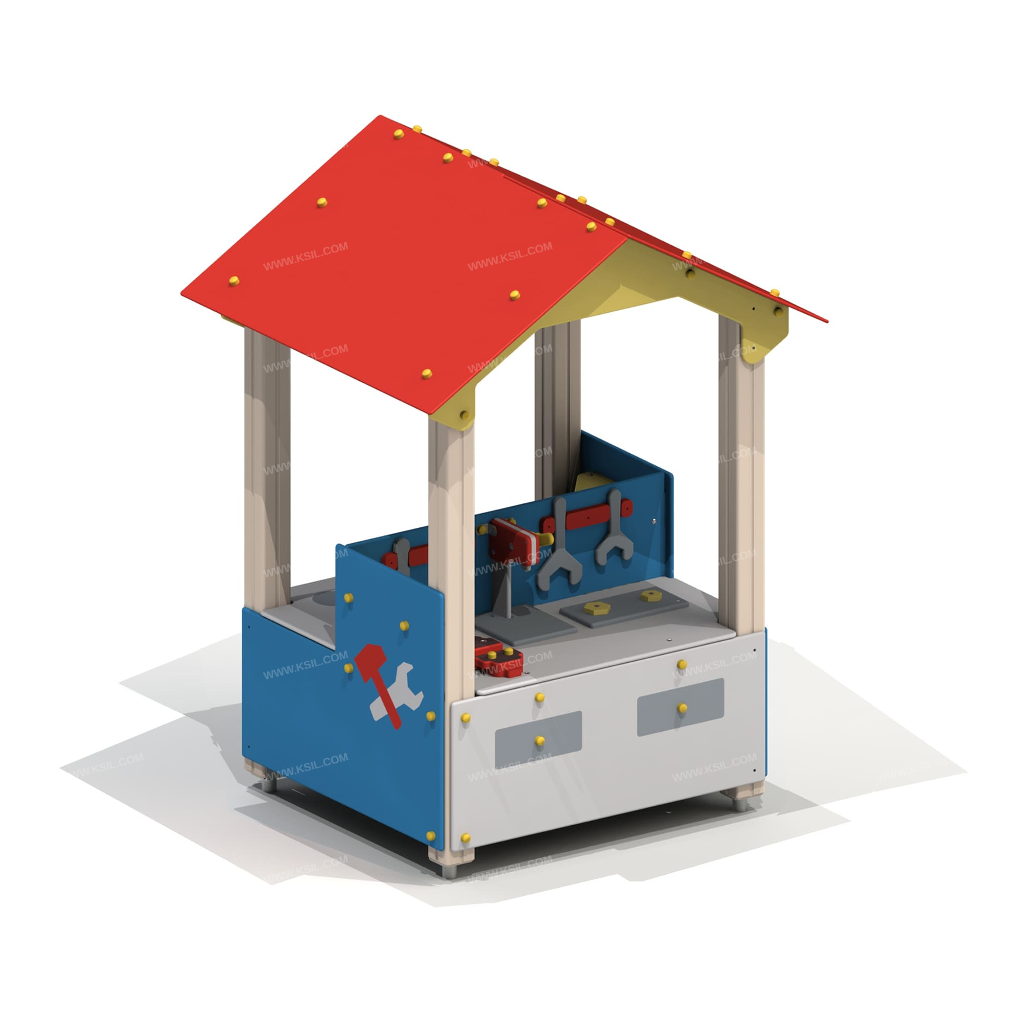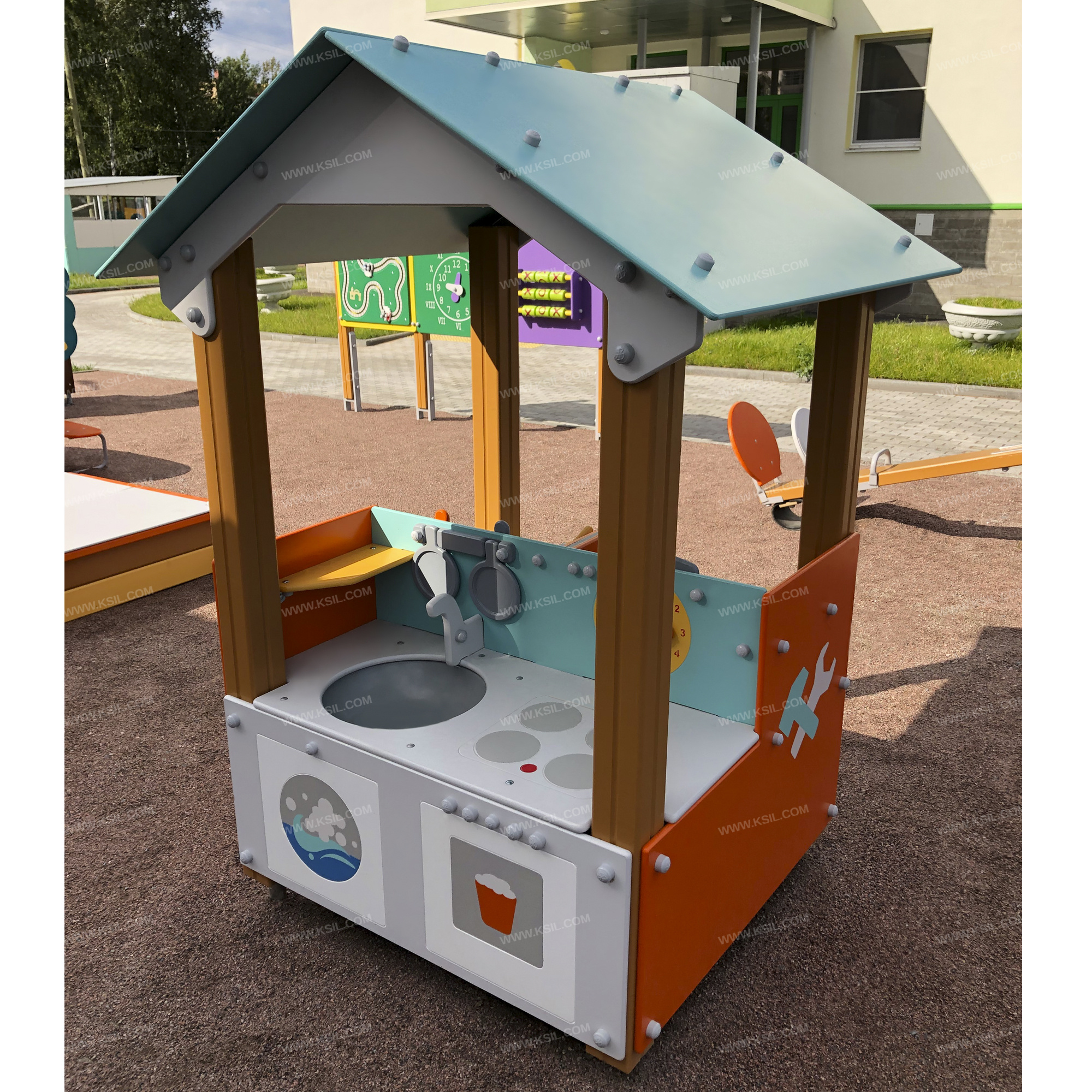 Мастерская-кухня должна представлять собой устойчивую, модульную конструкцию и состоять из игровых и развивающих элементов, обеспечивающие ребенку комфортные условия для игры на открытом воздухе. Конструкция должна состоять из башни с крышей.К башне должны быть пристроены: столешница, перегородка, боковые стенки с художественным оформлением на заданную тематику, кухня и мастерская.Кухня должна включать в себя: пластиковую мойку выпуклой формы с краном, плиту с конфорками, духовку, посудомойку, часы, сковородки, полку. Мастерская должна включать в себя: полку, рабочий станок, гаечные ключи, зубила, ножовку, гайки, тиски.Несущие столбы должны быть выполнены из клееного деревянного бруса сечением не менее 100х100 мм и иметь скругленный профиль с канавкой посередине. Снизу столб должен заканчиваться металлическим оцинкованным подпятником диаметром не менее 42 мм, который бетонируется в землю.Боковые стенки, столешница, полки, перегородки должны быть выполнены из влагостойкой окрашенной фанеры толщиной не менее 15 мм. Декоративные элементы должны быть выполнены из влагостойкой фанеры толщиной не менее 15 мм. Крыша двухскатная должна состоять из скатов, выполненных из влагостойкой фанеры толщиной не менее 9 мм и фронтонов из влагостойкой фанеры толщиной не менее 15 мм.