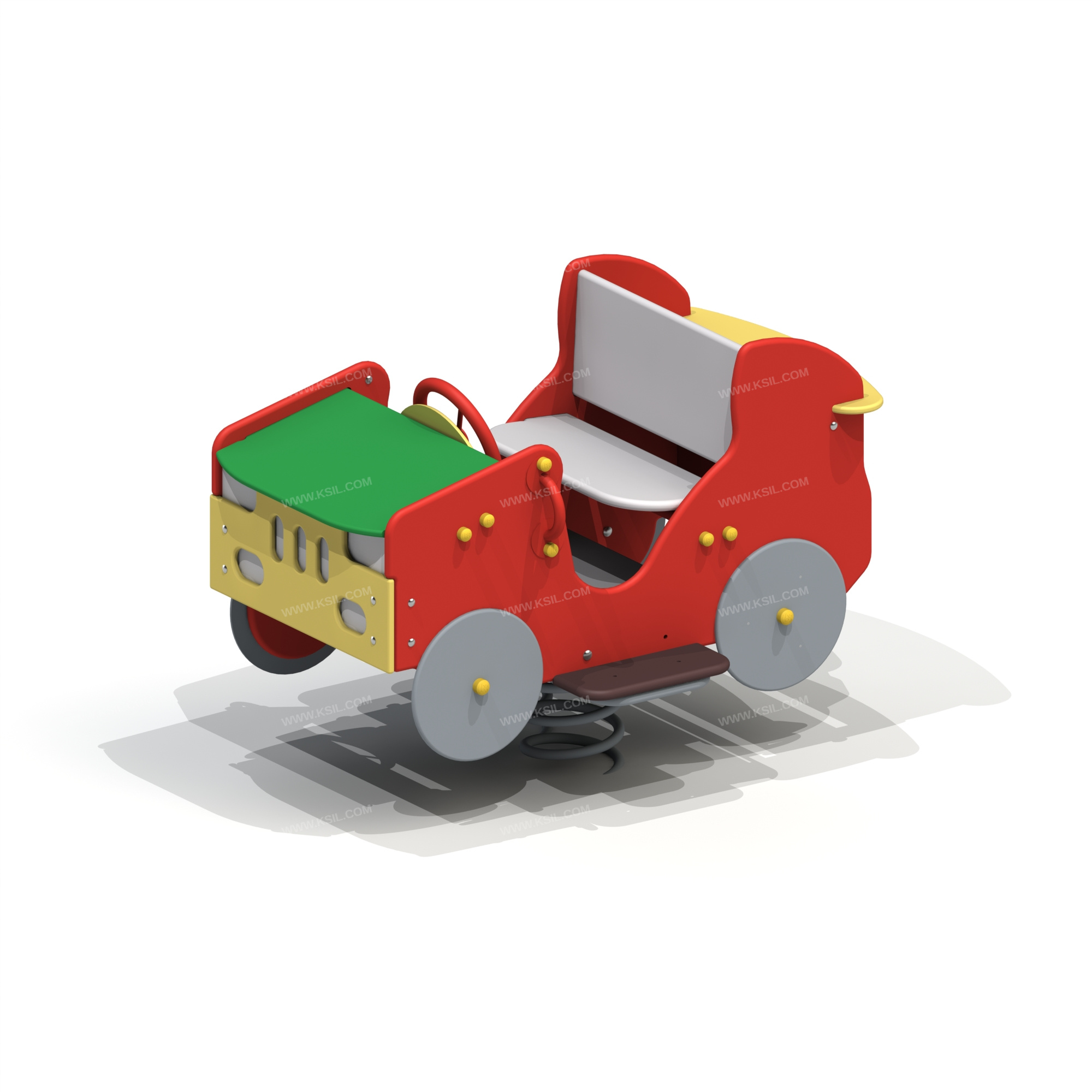 Качалка на пружине должна состоять из основания, на которое крепиться корпус качалки, опоры для крепления пружины в нижней части, 6-ти раскосов, соединяющих опору с опорной плитой, корпуса (боковые стенки, передний и задний бампер, панель с решеткой радиатора и фарами, колеса), пола, декоративных элементов, сиденья со спинкой, руля, 2-х поручней, 2-х опор для ног и 2-х перекладин жесткости.