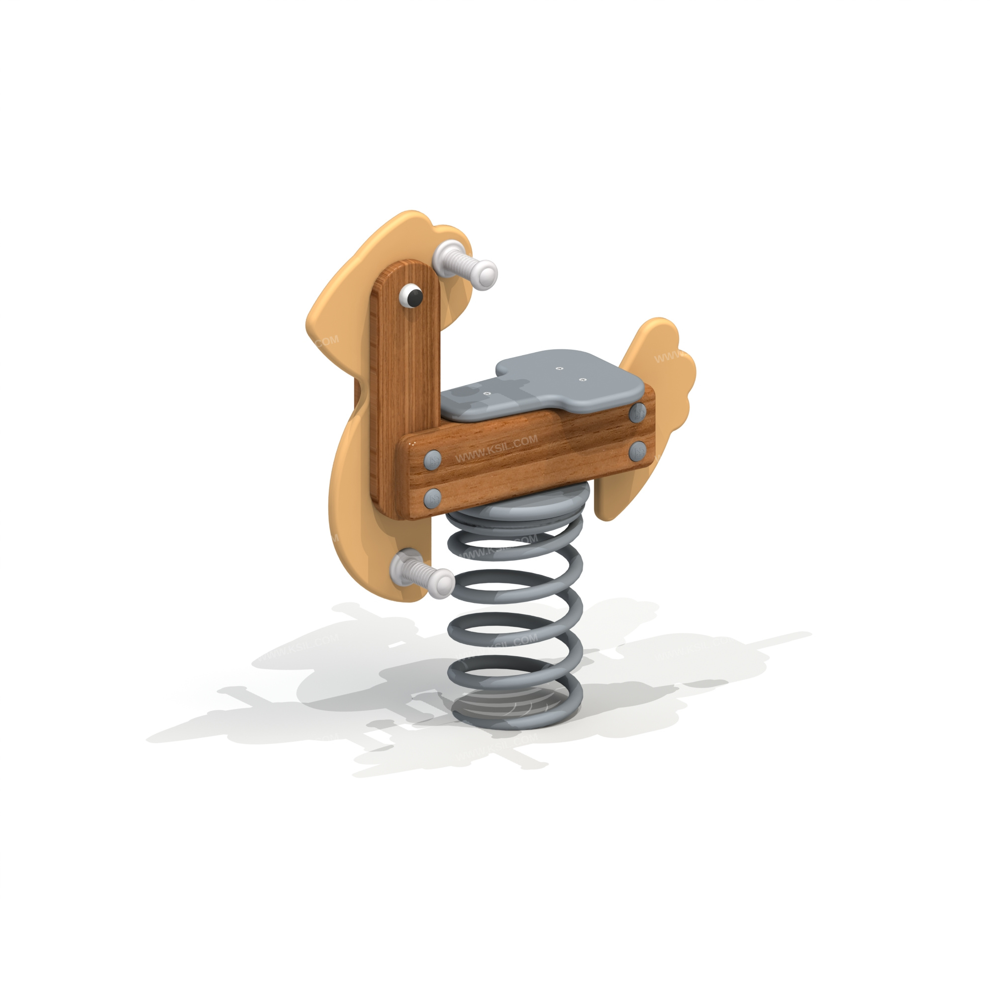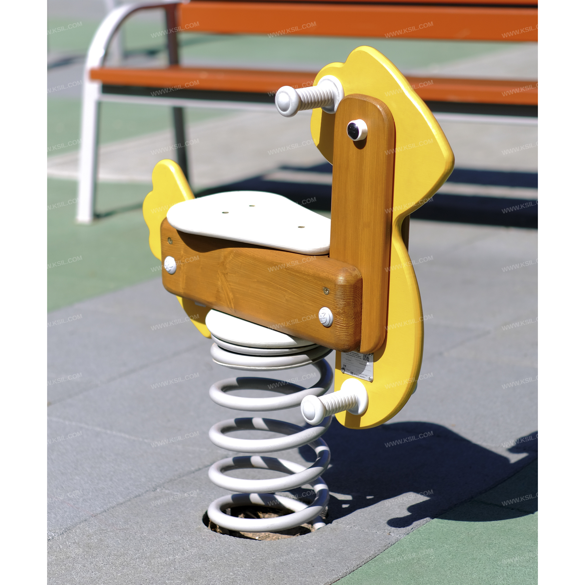 Качалка на пружине должна быть стилизована под «птичку» и представлять собой устойчивую конструкцию, обеспечивающую безопасное движение детей. Качалка на пружине должна состоять из основания, на которое крепится корпус качалки, опоры для крепления пружины в нижней части, 4-х раскосов, соединяющих опору с опорной плитой, корпуса, посадочного места, 2-х опор для ног, декоративных элементов и 2-х поручней из пластика. Основание выполнено из металлического листа толщиной δ =5 мм соединенного с пружиной при помощи соединительного металлического диска и болтового соединения.Опора выполнена из листа δ = 5 мм методом холодного прессования и соединена с пружиной в нижней её части при помощи металлического диска болтовым соединением.Пружина изготовлена из прутка Ø 22мм высотой 400мм и наружным Ø 202мм, число рабочих витков n= 6, окрашивается полимерными порошковыми красками.Раскосы выполнены из полосы толщиной 5 мм шириной 40 мм.Опорная плита выполнена из листа толщиной δ = 5 мм и выполняет роль фундамента. Опора и опорная плита соединены между собой при помощи раскосов на болтовых соединениях. Корпус выполнен из бруса лиственницы сечением 140х140мм, опоры для ног и рук должны быть выполнены из пластика Ø 33 мм. Сидение выполнено из влагостойкой фанеры δ = 21 мм.Контур «птички» выполнен из влагостойкой фанеры δ = 21 мм и деревянной доски из лиственницы сечением не менее 115х20 мм.