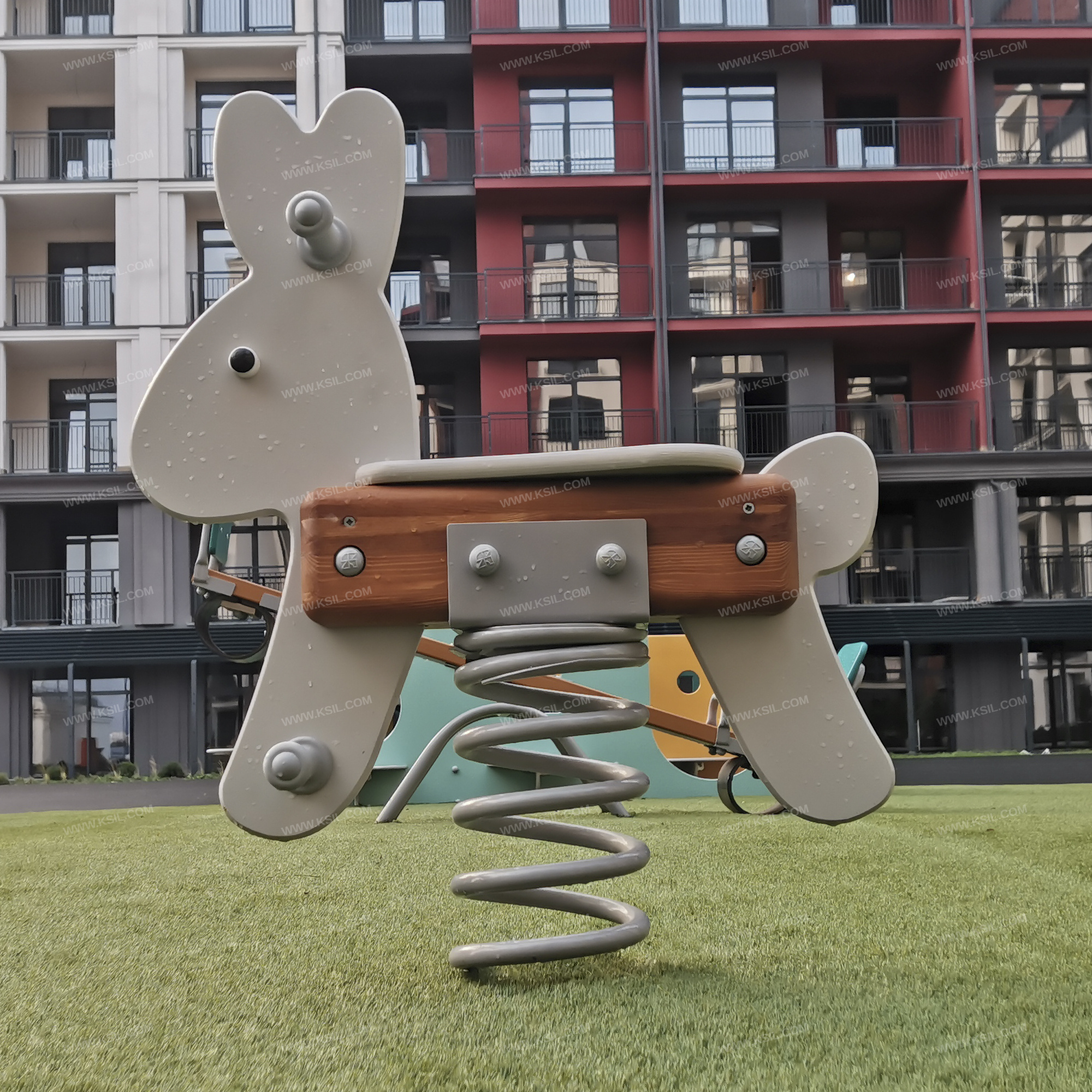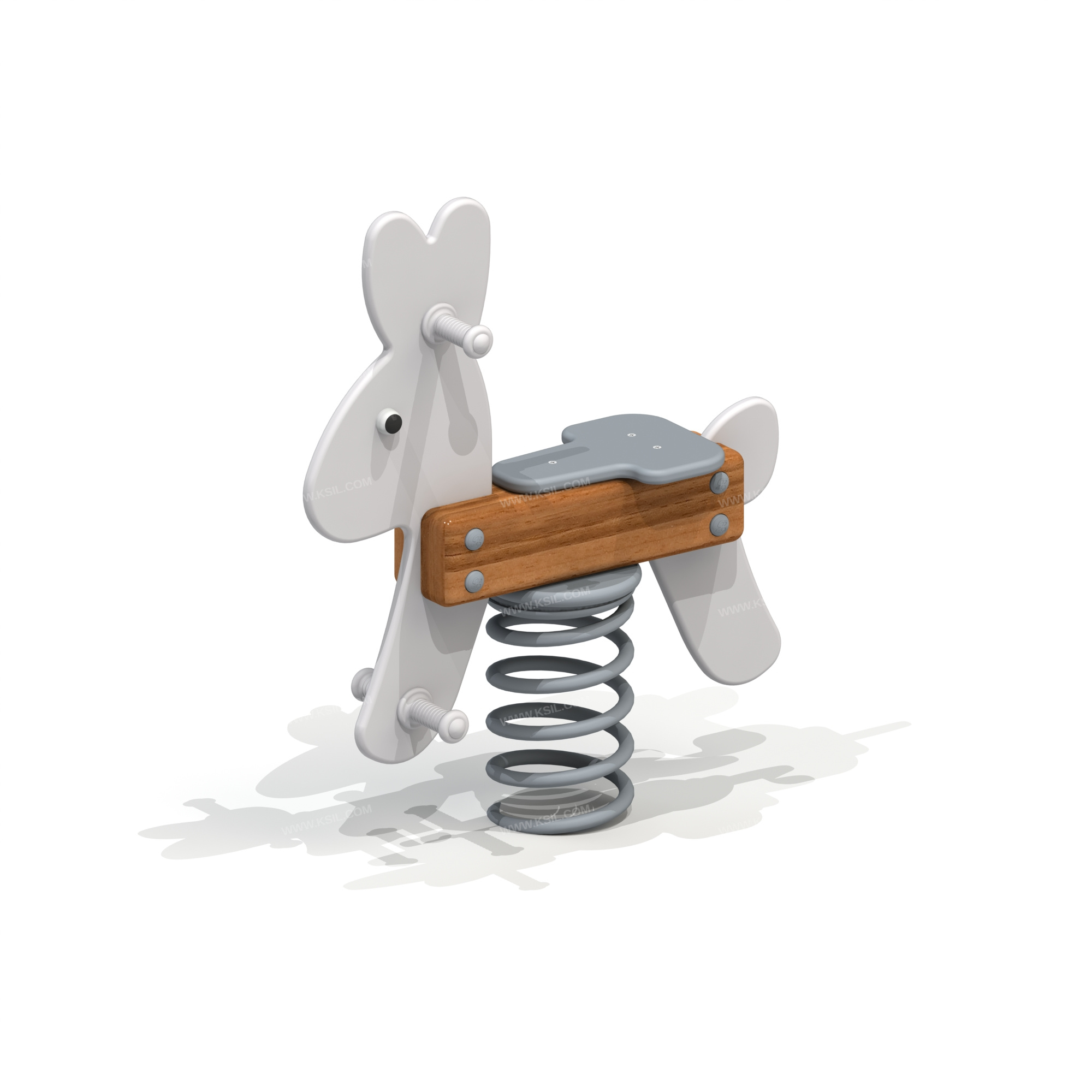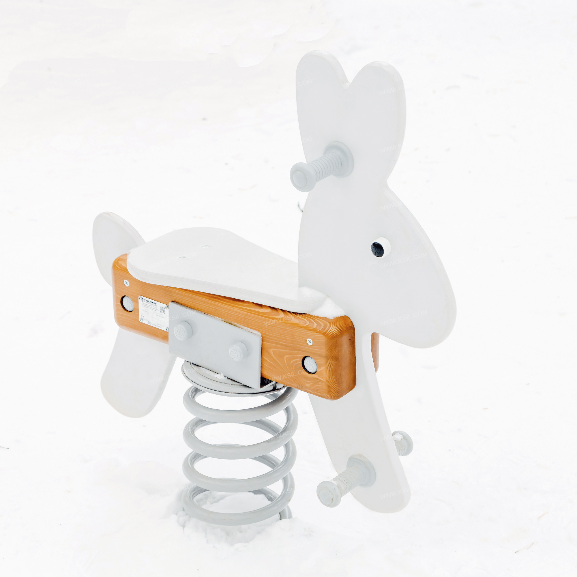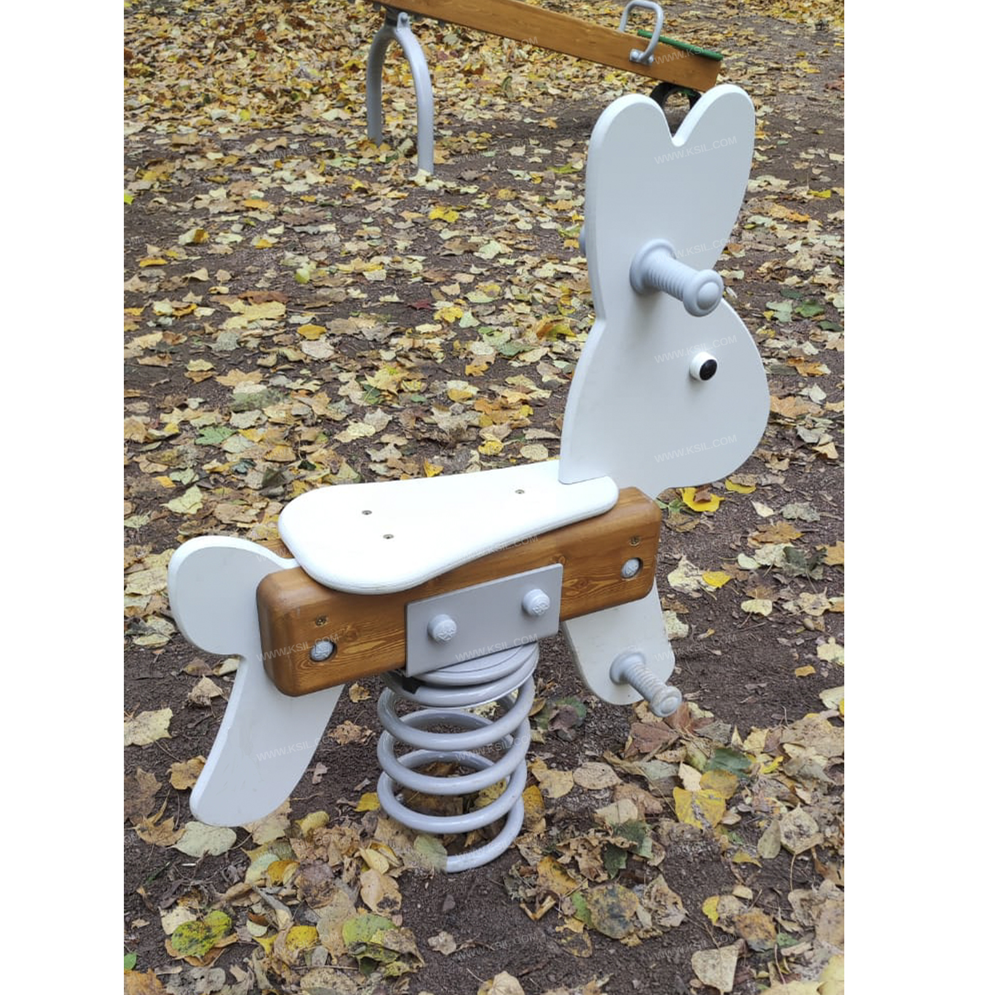 Качалка на пружине должна быть стилизована под «Зайчика» и представлять собой устойчивую конструкцию, обеспечивающую безопасное движение детей. Качалка на пружине должна состоять из основания, на которое крепиться корпус качалки, опоры для крепления пружины в нижней части, 4-х раскосов, соединяющих опору с опорной плитой, корпуса, посадочного места, 2-х опор для ног, декоративных элементов и 2-х поручней из пластика. Основание выполнено из металлического листа толщиной δ =5 мм соединенного с пружиной при помощи соединительного металлического диска и болтового соединения.Опора выполнена из листа δ = 5 мм методом холодного прессования и соединена с пружиной в нижней её части при помощи металлического диска болтовым соединением.Пружина изготовлена из прутка Ø 22мм высотой 400мм и наружным Ø 202мм, число рабочих витков n= 6, окрашивается полимерными порошковыми красками.Раскосы выполнены из полосы толщиной 5 мм шириной 40 мм.Опорная плита выполнена из листа толщиной δ = 5 мм и выполняет роль фундамента. Опора и опорная плита соединены между собой при помощи раскосов на болтовых соединениях. Корпус выполнен из бруса 140х140мм, опоры для ног и рук должны быть выполнены из пластика Ø 33 мм. Сидение и контур «Зайчика» выполнены из фанеры δ = 21 мм