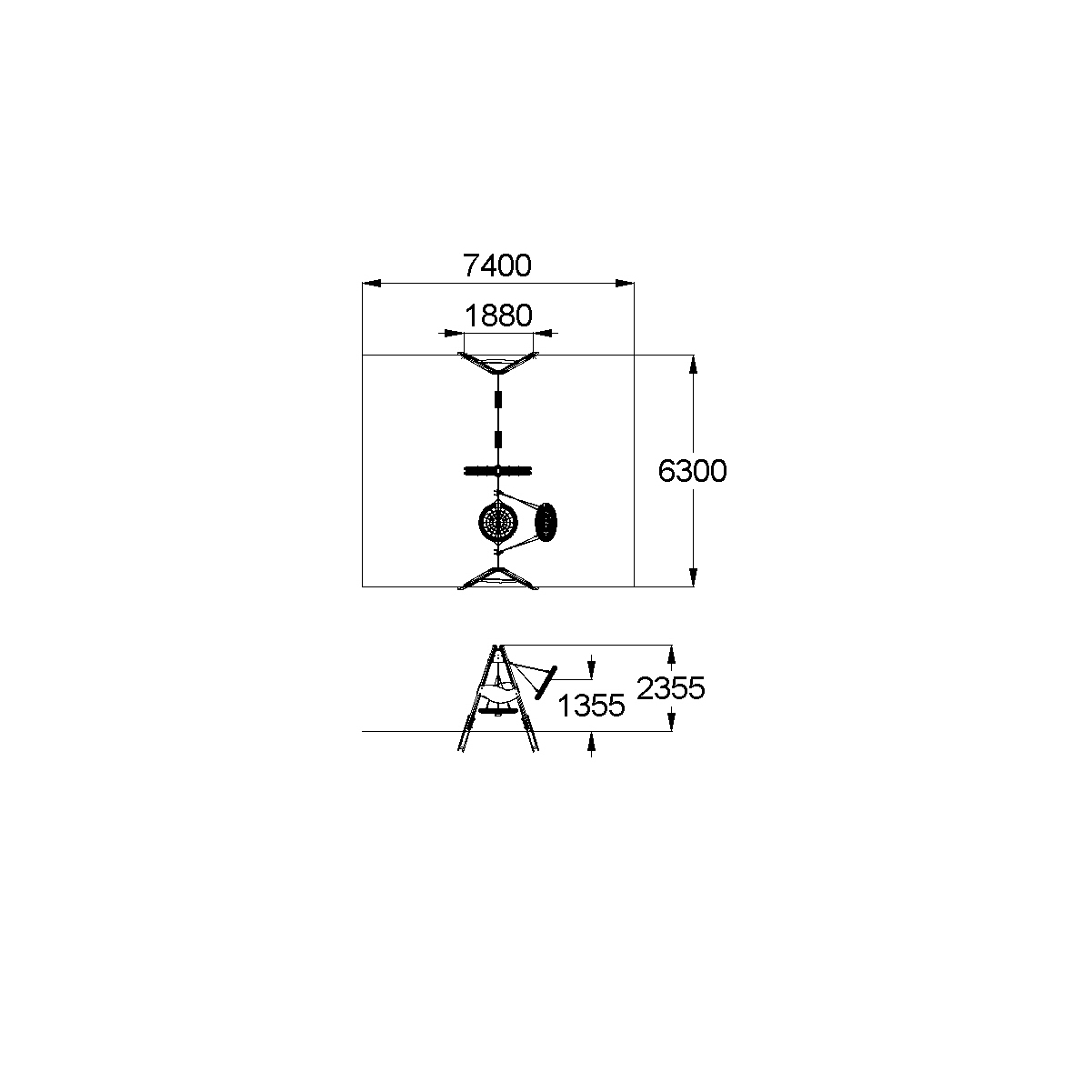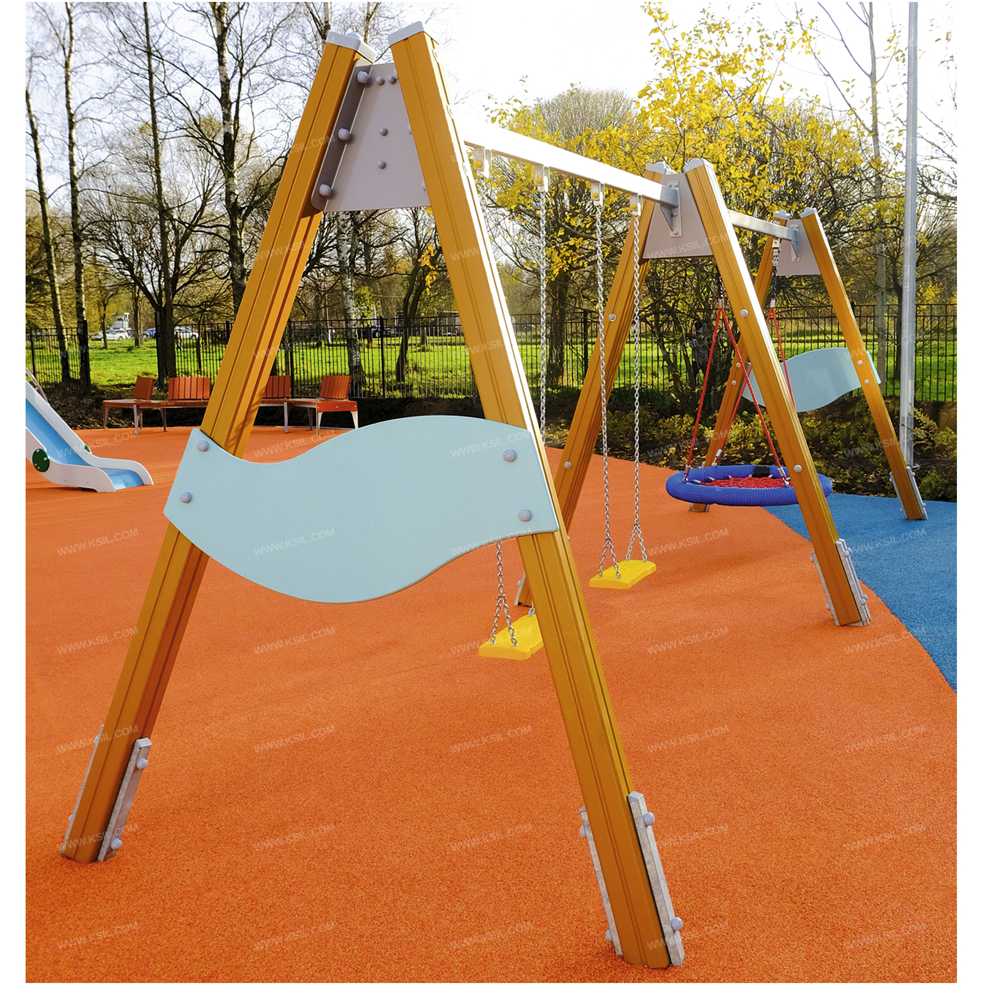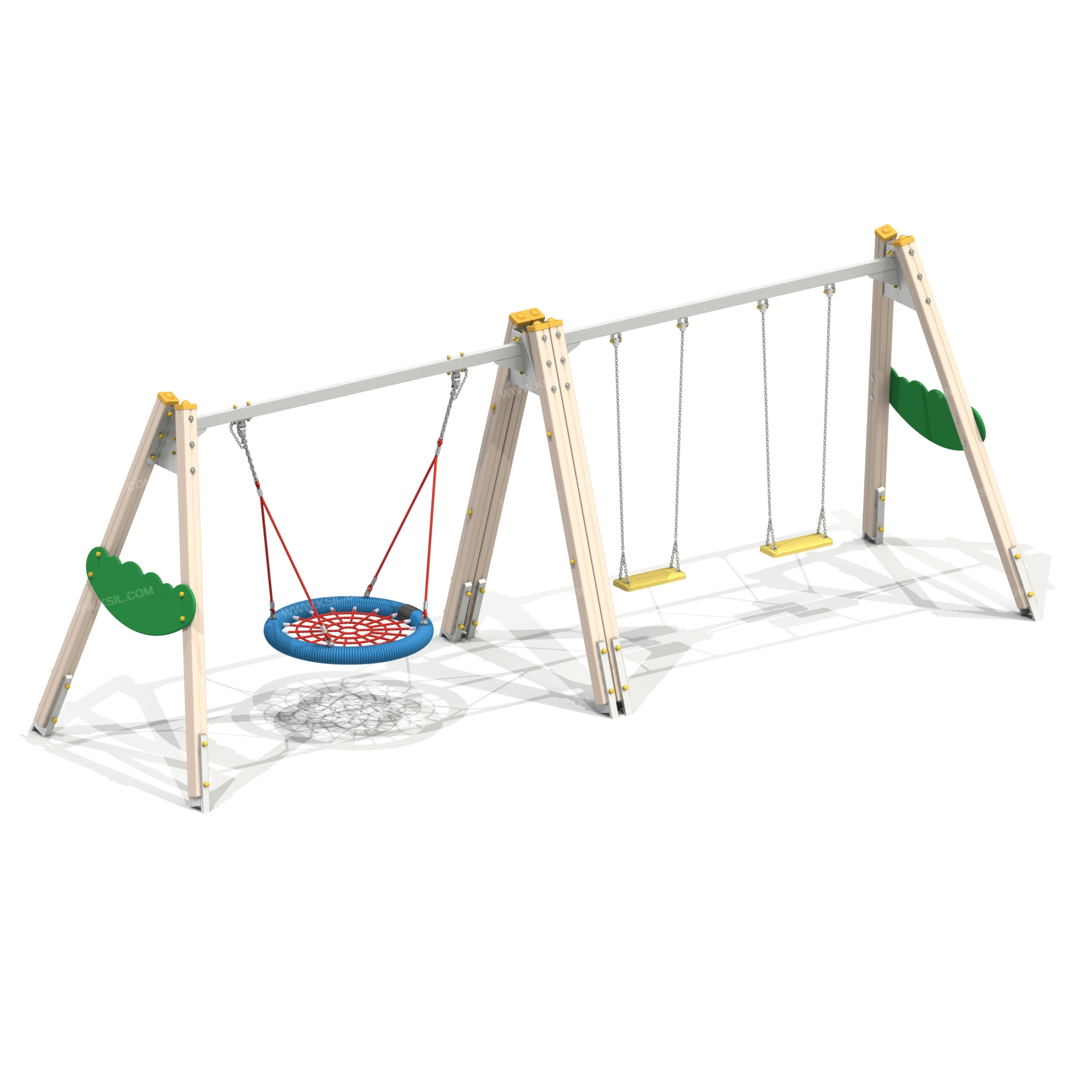 Качели должны представлять собой устойчивую конструкцию, состоящую из 8-и несущих столбов, 2-х балок, 4-х фитингов и 2-х фанерных накладок в виде "облака", подвесок качелей, подвески "Гнездо". Несущие столбы должны быть выполнены из клееного деревянного бруса сосны сечением не менее 100х100 мм и иметь скругленный профиль. Сверху столб должен заканчиваться пластиковой заглушкой, снизу столб должен заканчиваться металлическим оцинкованным подпятником из металлической профильной трубы сечением не менее 50х25 мм, который бетонируется в землю.Фитинги, оцинкованные трапециевидной формы выполнены из металлического листа толщиной не менее 5мм.Балка оцинкованная выполнена из металлической трубы 40х80 мм с приваренными к ней фланцами, косынками, выполненными из металлического листа толщиной не менее 5мм и скоб для крепления подвесов выполненными из металлического листа толщиной не менее 3мм.Балка оцинкованная выполнена из металлической трубы 40х80 мм с отверстиями в ней для крепления "Гнезда" и приваренными к ней фланцами, косынками, выполненными из металлического листа толщиной не менее 5мм.Накладки декоративные должны быть выполнены из влагостойкой фанеры толщиной не менее 21 мм. Сиденье "Гнездо" должно состоять из каркаса, «сетки-паутины». «Сетка-паутина», выполненная из высокотехнологичного полиамидного каната диаметром не менее 16 мм должна располагаться в пространстве, ограниченном каркасом диаметром не менее 950 мм. Канат сетки должен быть надежно закреплен специальными зажимами и креплениями из алюминиевого сплава, позволяющими удерживать конструкцию сетки под нагрузкой. Подвес в виде составных вант должен состоять из верхней части, выполненной из оцинкованной цепи длиной не менее 200 мм и нижней части, выполненной из каната диаметром не менее 16 мм и длиной не менее 1300 мм. Нижние части составных вант одной стороной должны крепиться к каркасу, а другой стороной, соединяясь попарно, крепиться к верхней части составных вант. Подвес качелей с сиденьем резиновым должен быть выполнен из оцинкованной стальной цепи, изготовленной методом контактной электросварки. На поверхности цепи не должно быть трещин, ситовидной пористости, плены и расслоения. К подвесу должно крепиться плоское сиденье, выполненное из обрезиненного металла. Длина подвеса должна быть не менее 1640 мм. Габаритные размеры сиденья должны быть не менее 450х180х35 мм. Крепление подвеса должно обеспечивать горизонтальное положение относительно плоскости площадки в состоянии покоя и исключать возможность обрыва цепи в месте подвески.