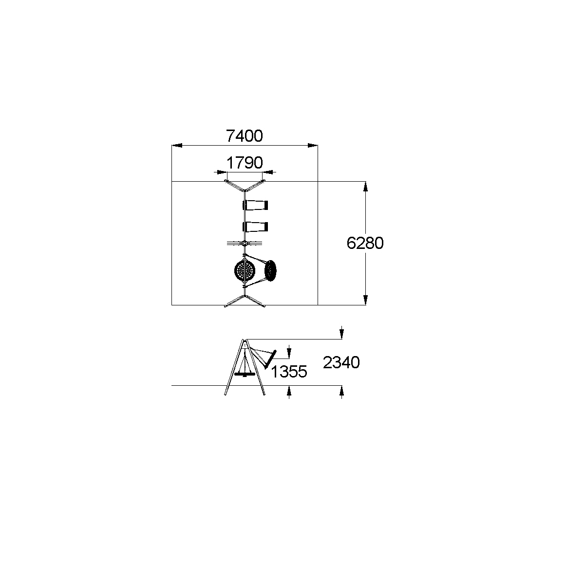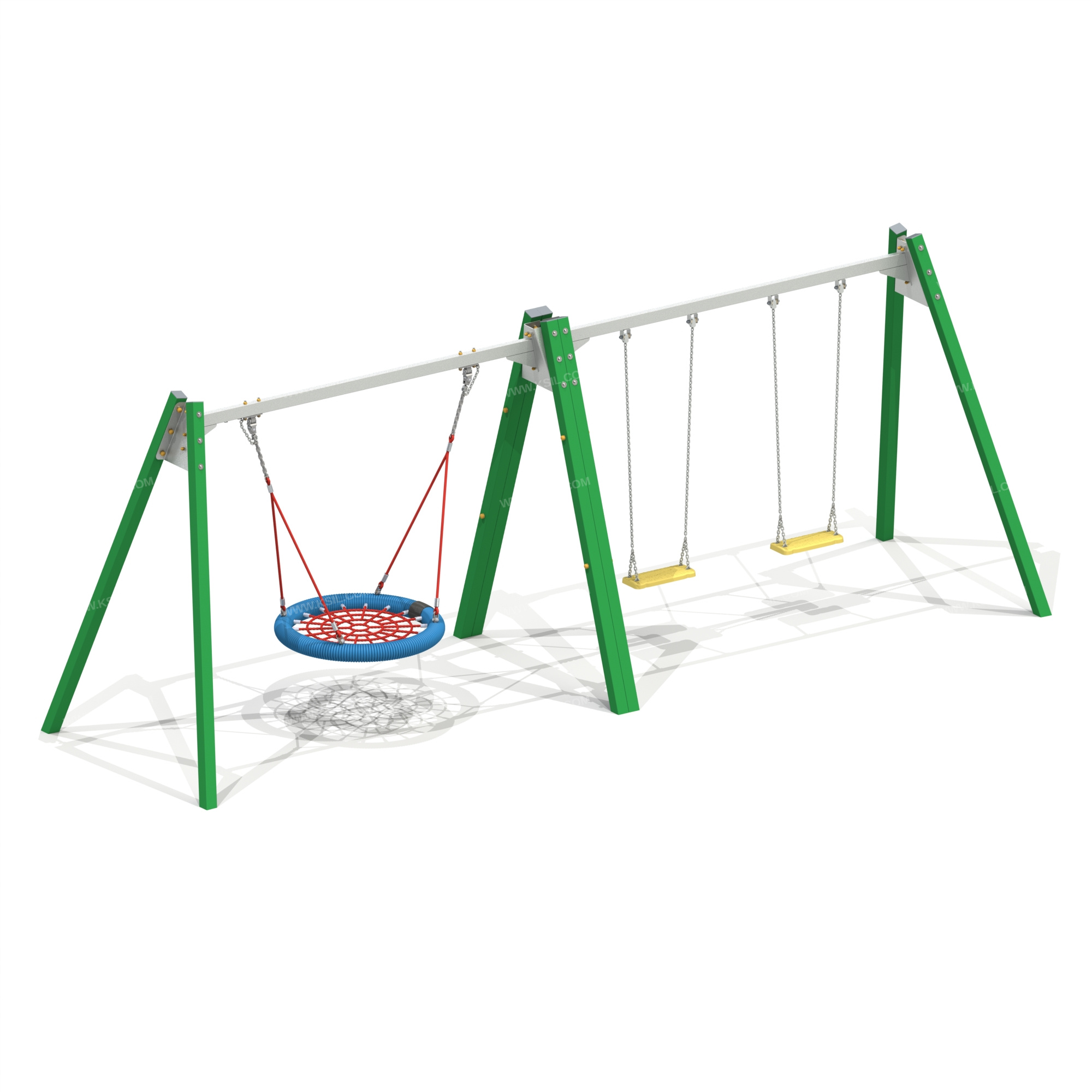 Качели должны представлять собой устойчивую конструкцию, состоящую из 8-и несущих стоек, 2-х балок, 4-х фитингов, подвесок качелей, подвески "Гнездо".Стойки должны быть выполнены из металлической профильной трубы сечением не менее 80х80 мм. Фитинги, оцинкованные трапециевидной формы выполнены из металлического листа толщиной не менее 5мм.Балка оцинкованная выполнена из металлической трубы 40х80 мм с приваренными к ней фланцами, косынками, выполненными из металлического листа толщиной не менее 5мм и скоб для крепления подвесов выполненными из металлического листа толщиной не менее 3мм.Балка оцинкованная выполнена из металлической трубы 40х80 мм с отверстиями в ней для крепления "Гнезда" и приваренными к ней фланцами, косынками, выполненными из металлического листа толщиной не менее 5мм.Сиденье "Гнездо" должно состоять из каркаса, «сетки-паутины». "Сетка-паутина", выполненная из высокотехнологичного полиамидного каната диаметром не менее 16 мм должна располагаться в пространстве, ограниченном каркасом диаметром не менее 950 мм. Канат сетки должен быть надежно закреплен специальными зажимами и креплениями из алюминиевого сплава, позволяющими удерживать конструкцию сетки под нагрузкой. Подвес в виде составных вант должен состоять из верхней части, выполненной из оцинкованной цепи длиной не менее 200 мм и нижней части, выполненной из каната диаметром не менее 16 мм и длиной не менее 1300 мм. Нижние части составных вант одной стороной должны крепиться к каркасу, а другой стороной, соединяясь попарно, крепиться к верхней части составных вант. Подвес качелей с сиденьем резиновым должен быть выполнен из оцинкованной стальной цепи, изготовленной методом контактной электросварки. На поверхности цепи не должно быть трещин, ситовидной пористости, плены и расслоения. К подвесу должно крепиться плоское сиденье, выполненное из обрезиненного металла. Длина подвеса должна быть не менее 1640 мм. Габаритные размеры сиденья должны быть не менее 450х180х35 мм. Крепление подвеса должно обеспечивать горизонтальное положение относительно плоскости площадки в состоянии покоя и исключать возможность обрыва цепи в месте подвески.