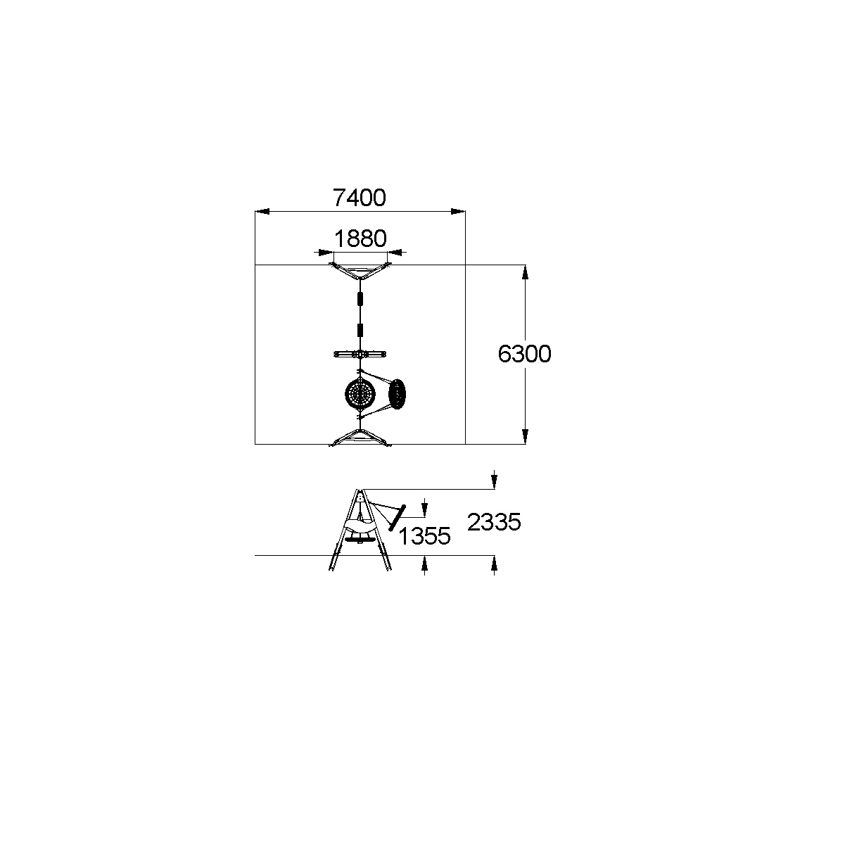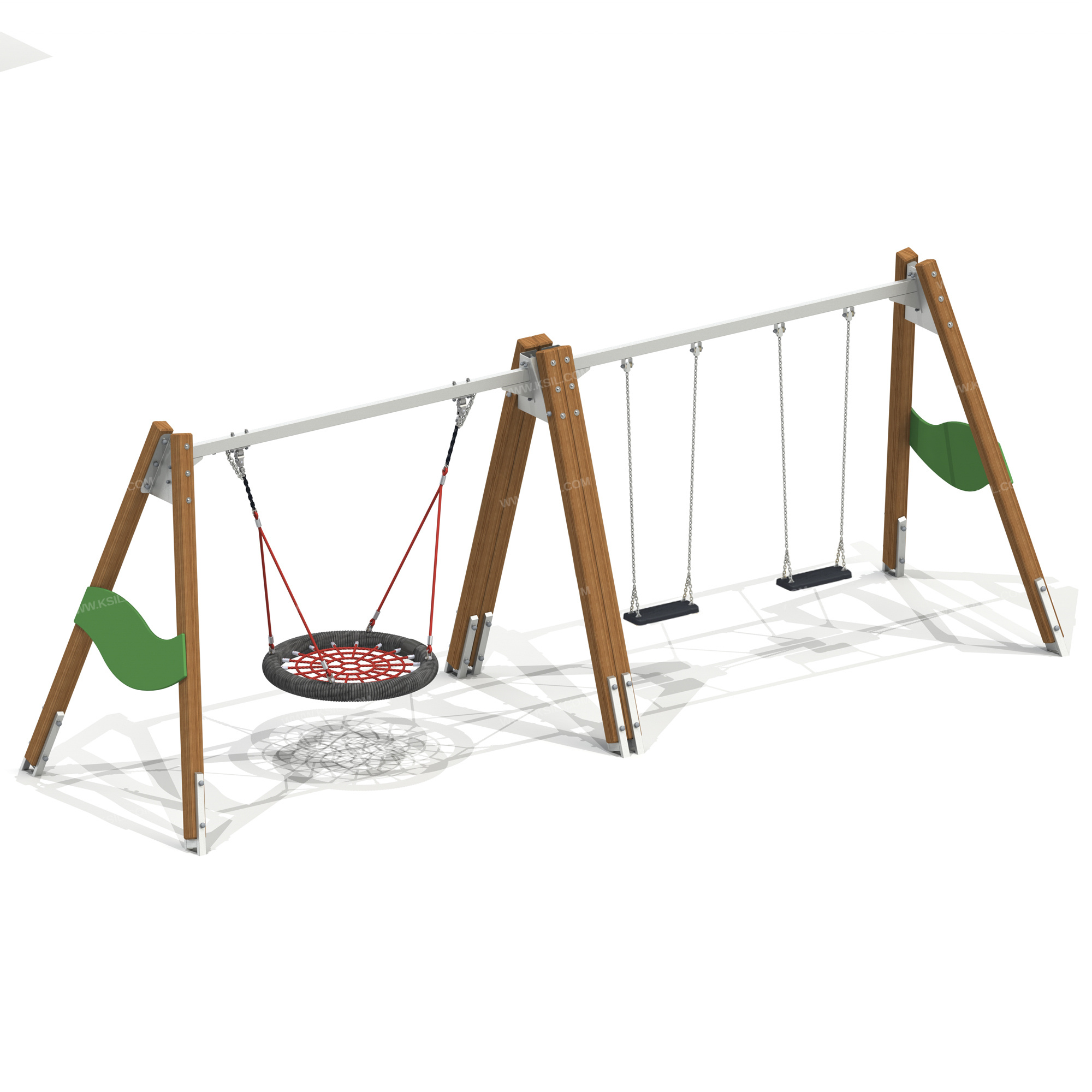 Качели должны представлять собой устойчивую конструкцию, состоящую из 8-и несущих столбов, 2-х балок, 4-х фитингов и 2-х фанерных накладок в виде "волны", подвесок качелей, подвески "Гнездо".Несущие столбы должны быть выполнены из клееного деревянного бруса лиственницы сечением не менее 100х100 мм и иметь скругленный профиль. Снизу столб должен заканчиваться металлическим оцинкованным подпятником из металлической профильной трубы сечением не менее 50х25 мм, который бетонируется в землю.Фитинги, оцинкованные трапециевидной формы выполнены из металлического листа толщиной не менее 5мм.Балка оцинкованная выполнена из металлической трубы 40х80 мм с приваренными к ней фланцами, косынками, выполненными из металлического листа толщиной не менее 5мм и скоб для крепления подвесов выполненными из металлического листа толщиной не менее 3мм.Балка оцинкованная выполнена из металлической трубы 40х80 мм с отверстиями в ней для крепления "Гнезда" и приваренными к ней фланцами, косынками, выполненными из металлического листа толщиной не менее 5мм.Накладки декоративные должны быть выполнены из влагостойкой фанеры толщиной не менее 21 мм. Сиденье "Гнездо" должно состоять из каркаса, «сетки-паутины». «Сетка-паутина», выполненная из высокотехнологичного полиамидного каната диаметром не менее 16 мм должна располагаться в пространстве, ограниченном каркасом диаметром не менее 950 мм. Канат сетки должен быть надежно закреплен специальными зажимами и креплениями из алюминиевого сплава, позволяющими удерживать конструкцию сетки под нагрузкой. Подвес в виде составных вант должен состоять из верхней части, выполненной из оцинкованной цепи длиной не менее 200 мм и нижней части, выполненной из каната диаметром не менее 16 мм и длиной не менее 1300 мм. Нижние части составных вант одной стороной должны крепиться к каркасу, а другой стороной, соединяясь попарно, крепиться к верхней части составных вант. Подвес качелей с сиденьем резиновым должен быть выполнен из оцинкованной стальной цепи, изготовленной методом контактной электросварки. На поверхности цепи не должно быть трещин, ситовидной пористости, плены и расслоения. К подвесу должно крепиться плоское сиденье, выполненное из обрезиненного металла. Длина подвеса должна быть не менее 1640 мм. Габаритные размеры сиденья должны быть не менее 450х180х35 мм. Крепление подвеса должно обеспечивать горизонтальное положение относительно плоскости площадки в состоянии покоя и исключать возможность обрыва цепи в месте подвески.