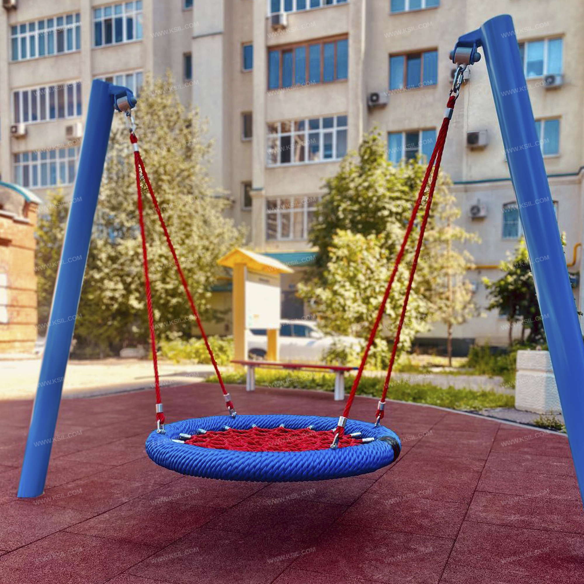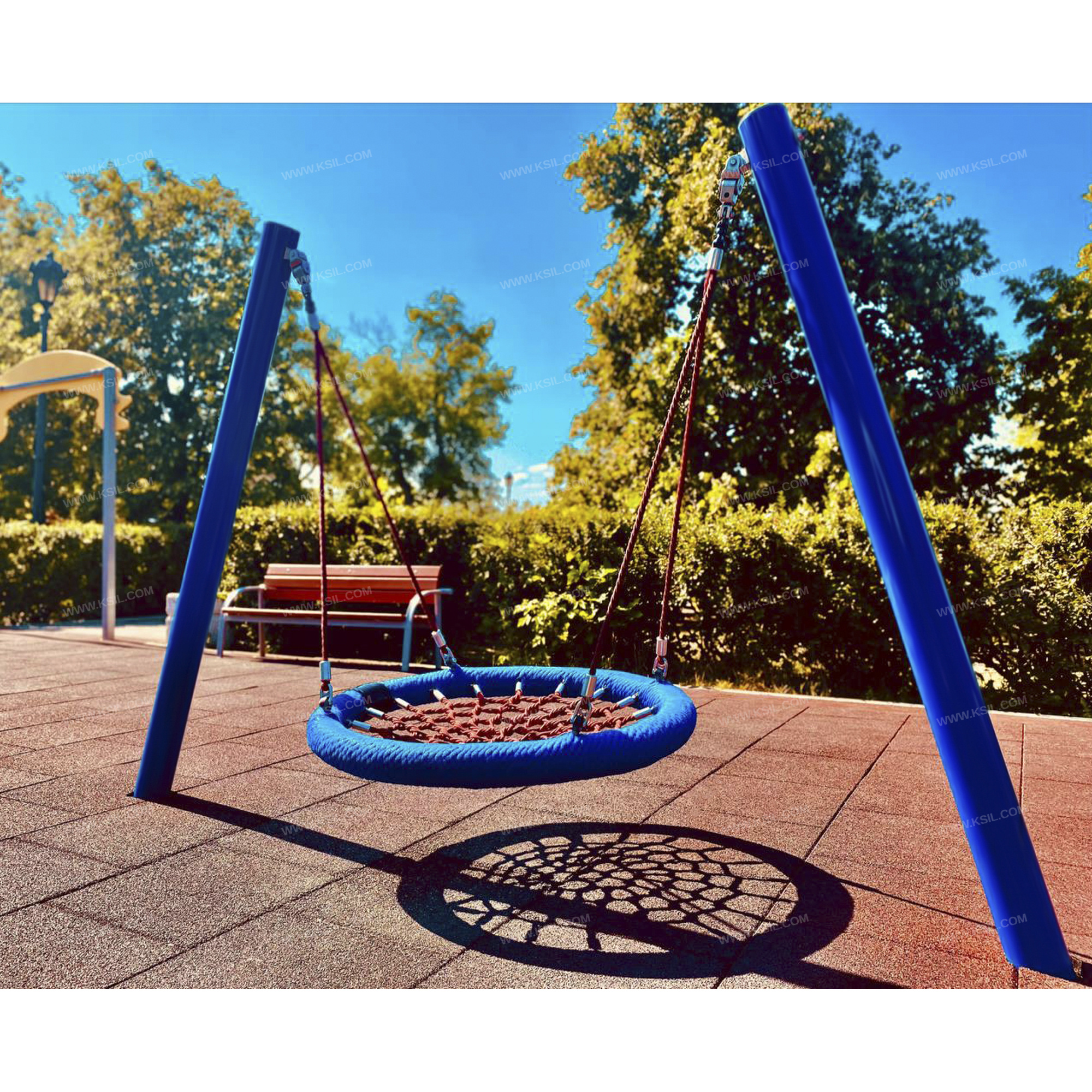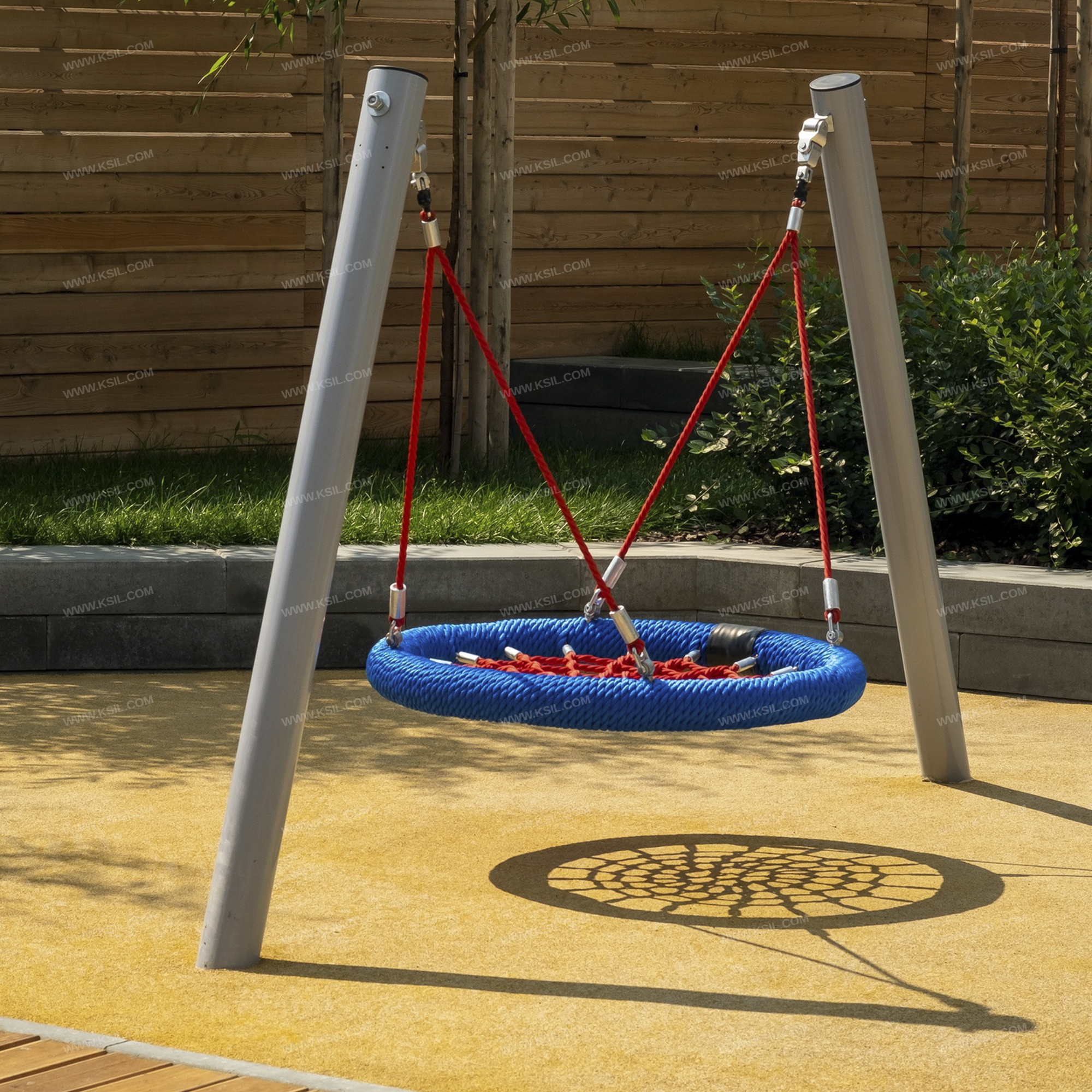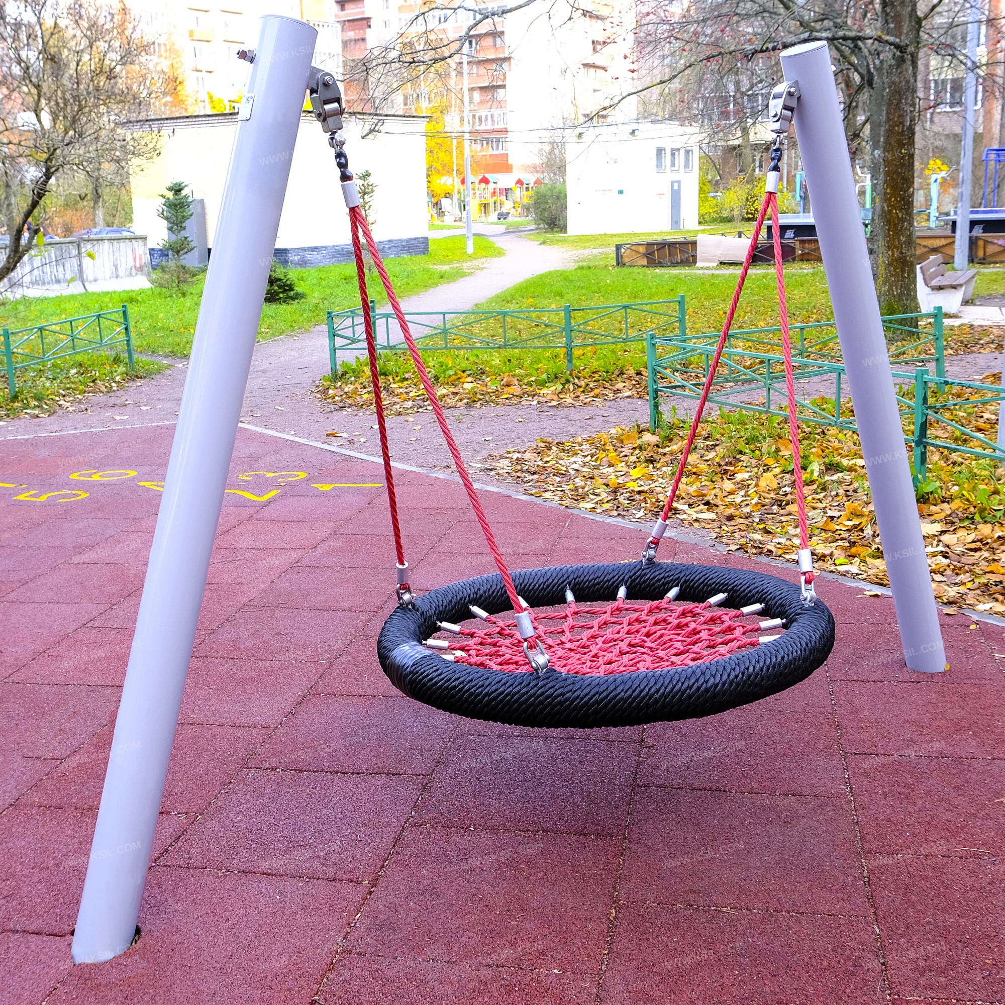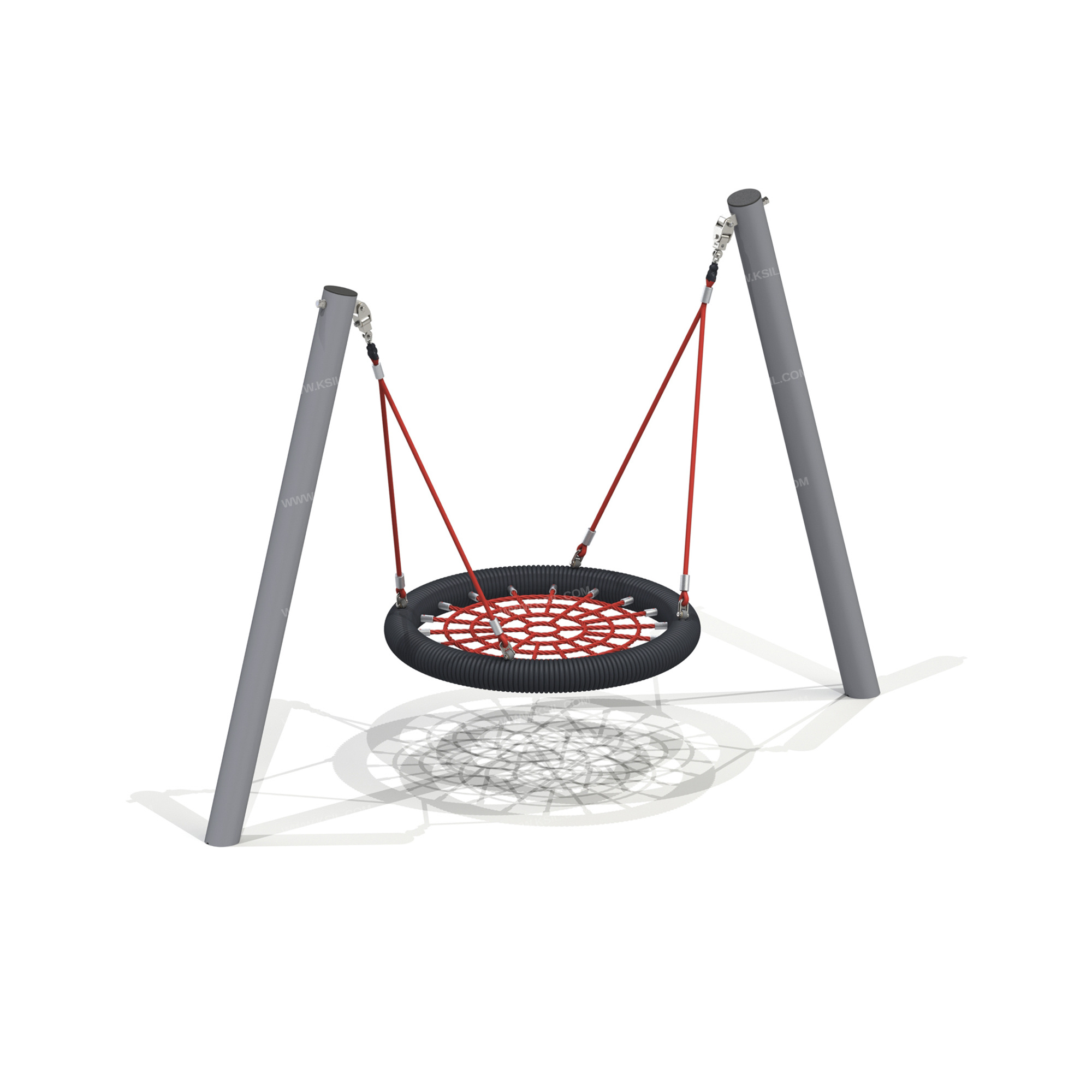 Качели односекционные должны представлять собой устойчивую конструкцию, обеспечивающую безопасное движение сиденья на подвесе. Качели должны состоять из боковых стоек, состоящих из двух металлических наклонных труб, гибкого подвеса «Гнездо».Боковые стойки должны быть выполнены из металлической трубы диаметром не менее 114 мм. Сиденье «Гнездо» должно состоять из каркаса, «сетки-паутины». «Сетка-паутина», выполненная из высокотехнологичного полиамидного каната диаметром не менее 16 мм должна располагаться в пространстве, ограниченном каркасом диаметром не менее 950 мм. Канат сетки должен быть надежно закреплен специальными зажимами и креплениями из алюминиевого сплава, позволяющими удерживать конструкцию сетки под нагрузкой.Подвес в виде составных вант должен состоять из верхней части, выполненной из оцинкованной цепи длиной не менее 60 мм и нижней части, выполненной из каната диаметром не менее 16 мм и длиной не менее 1160 мм. Нижние части составных вант одной стороной должны крепиться к каркасу, а другой стороной, соединяясь попарно, крепиться к верхней части составных вант.