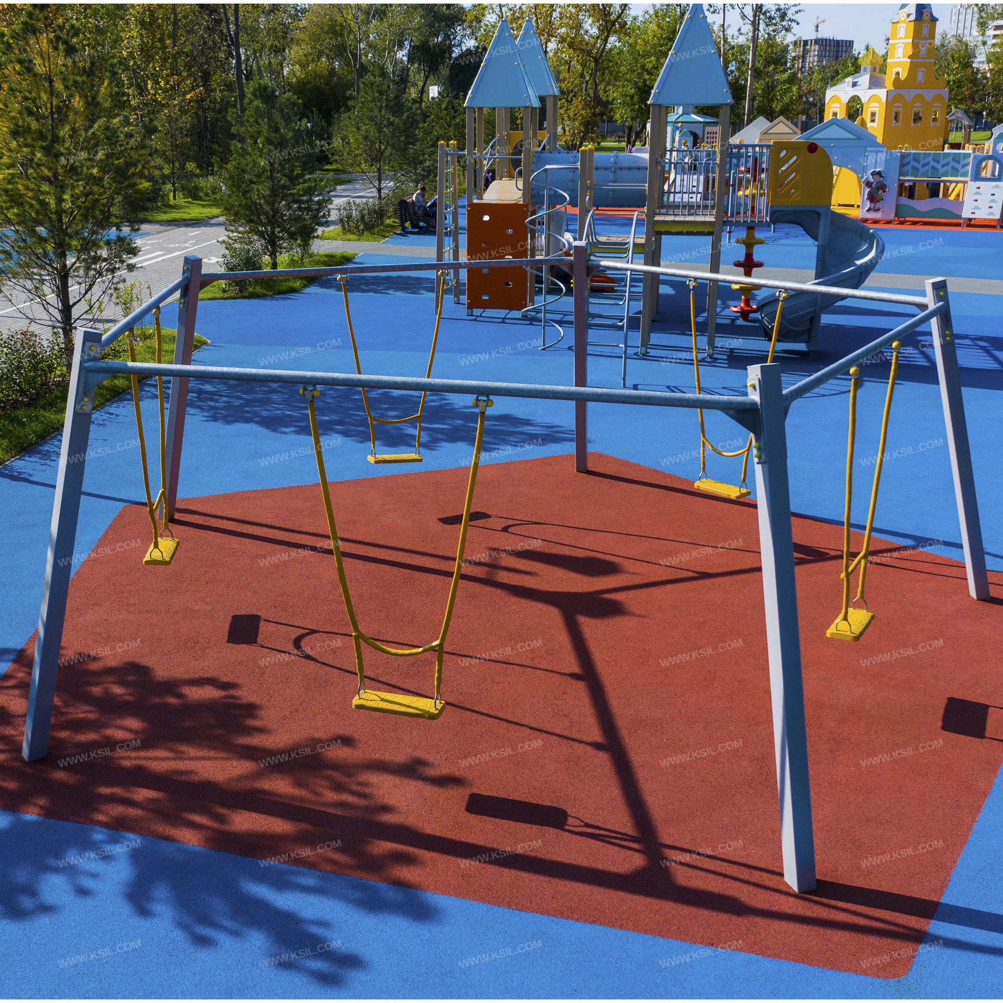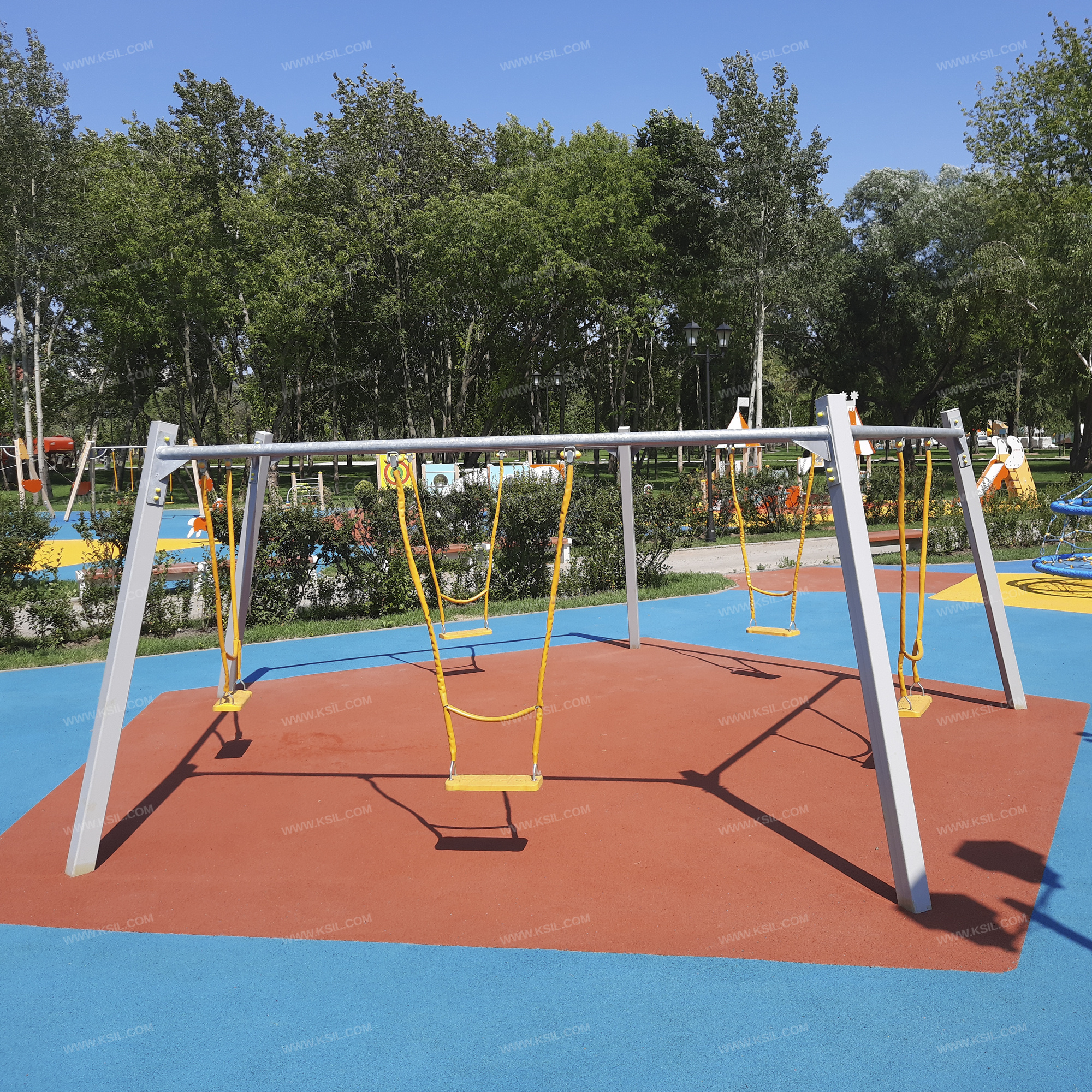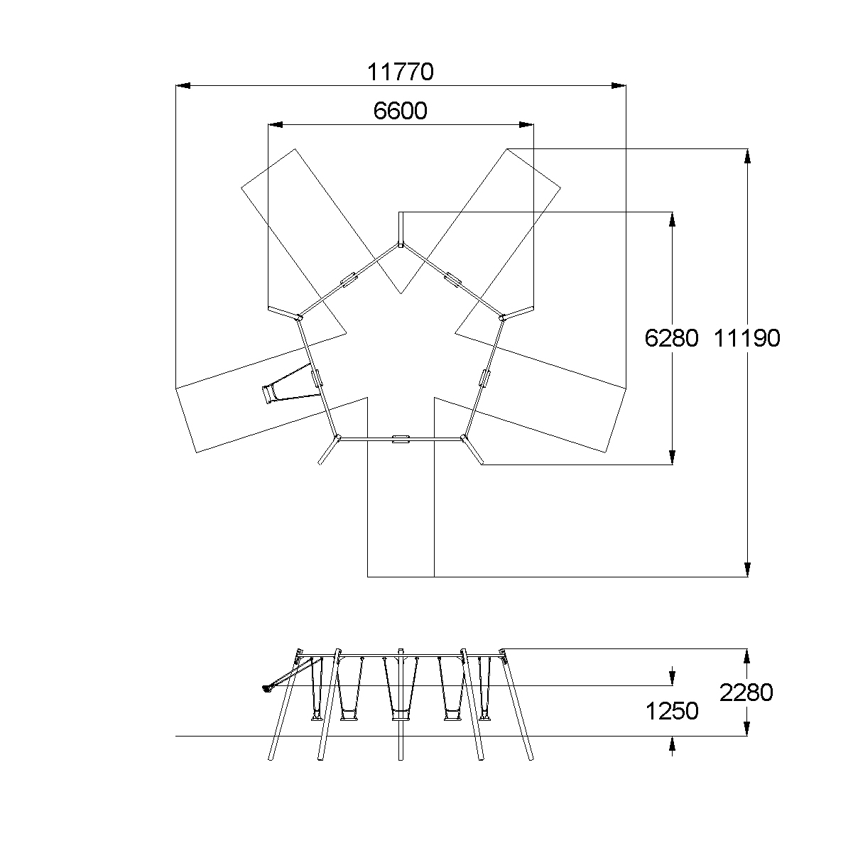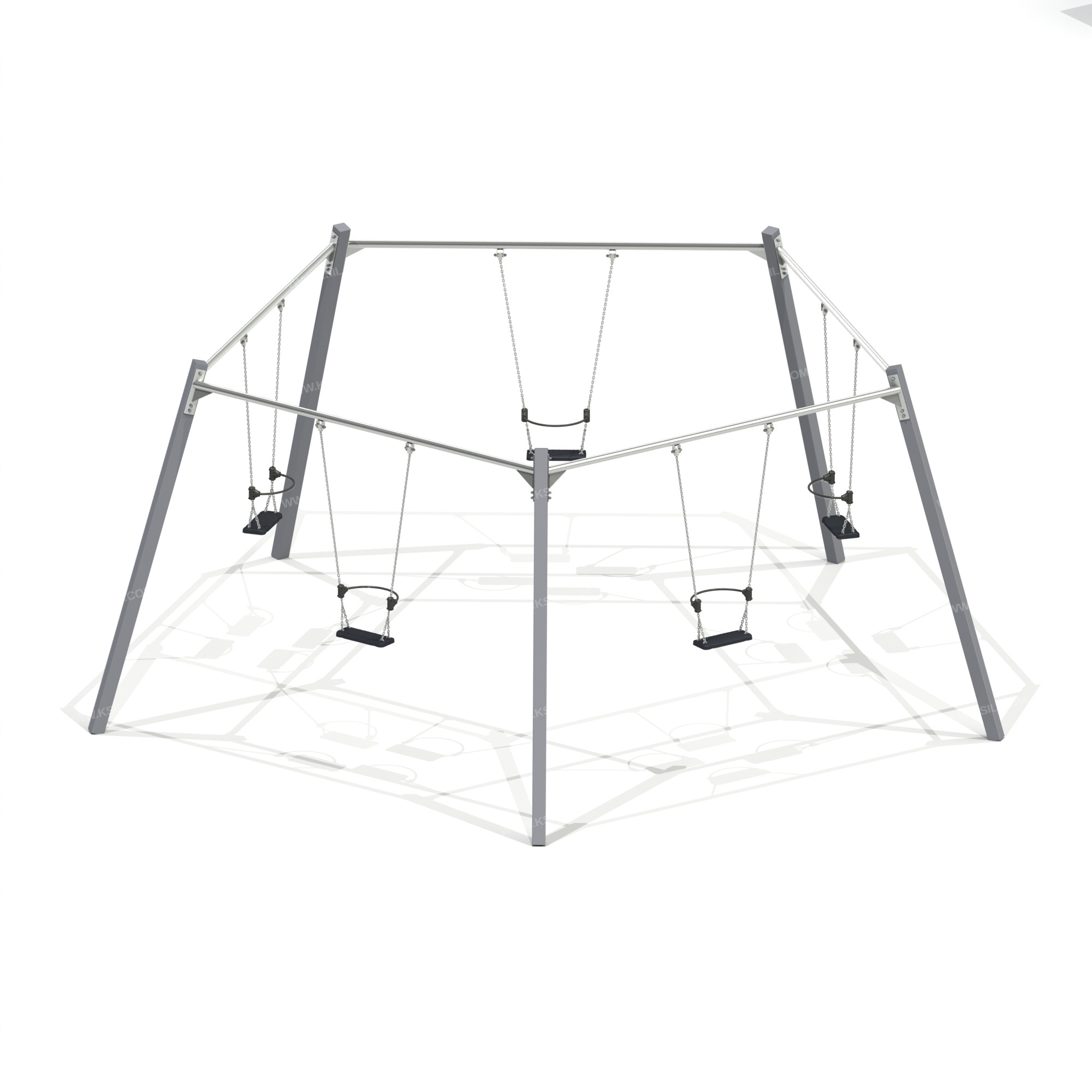 Качели коллективные должны представлять собой устойчивую пятигранную конструкцию, состоящую из 5-ти несущих стоек, 5-ти перекладин с гибкими подвесами и с плоскими сиденьями. Несущие стойки должны быть выполнены из металлической профильной трубы сечением не менее 100х100 мм. Перекладина должна быть выполнена из металлической оцинкованной трубы диаметром не менее 60 мм.Крепление подвеса должно обеспечивать горизонтальное положение относительно плоскости площадки в состоянии покоя и исключать возможность обрыва цепи в месте подвески. Подвес гибкий должен быть выполнен из оцинкованной стальной цепи, изготовленной методом контактной электросварки. На поверхности цепи не должно быть трещин, ситовидной пористости, плены и расслоения. К подвесу должно крепиться плоское сиденье, выполненное из обрезиненного металла. Длина подвеса должна быть не менее 1400 мм. Габаритные размеры сиденья должны быть не менее 435х175х35 мм.
