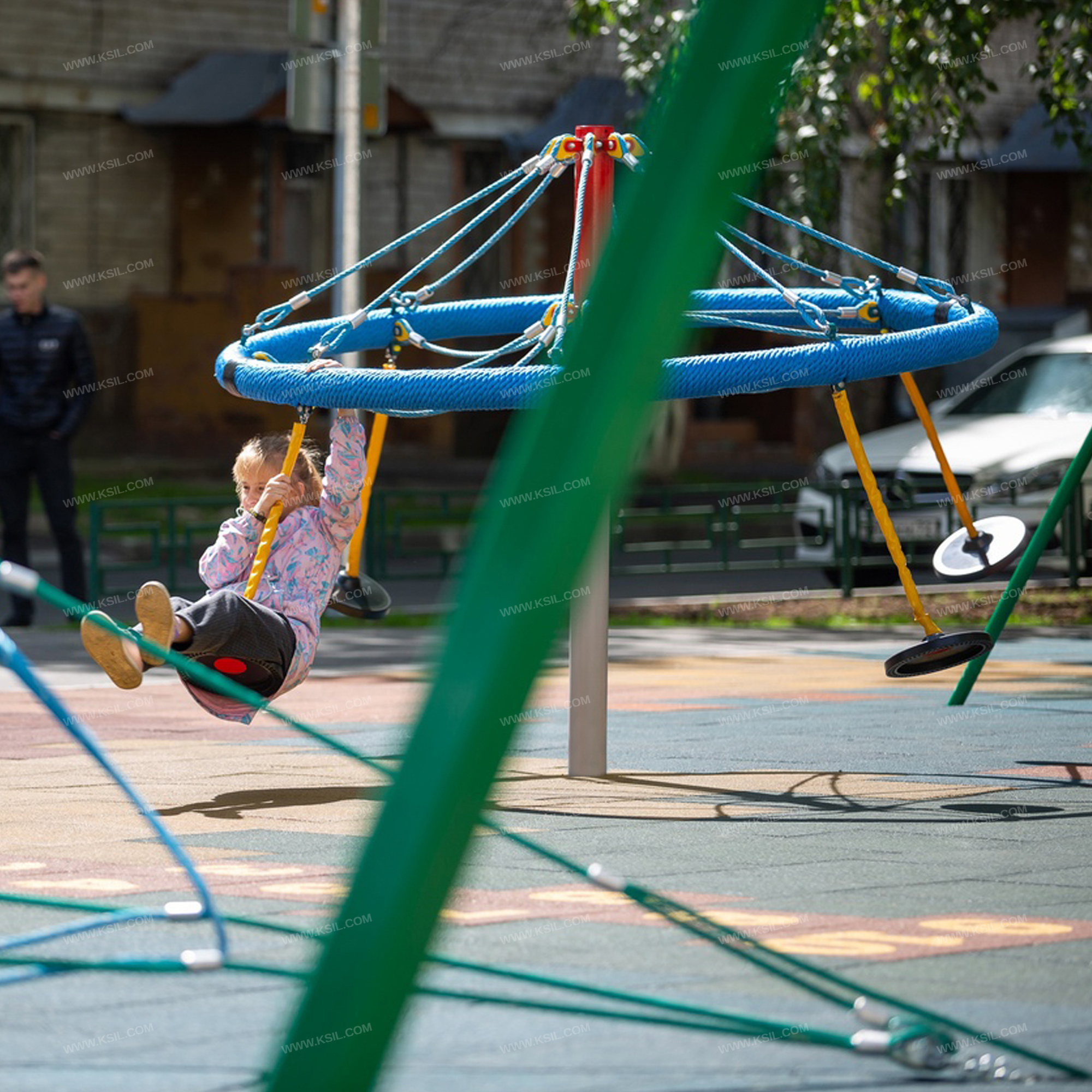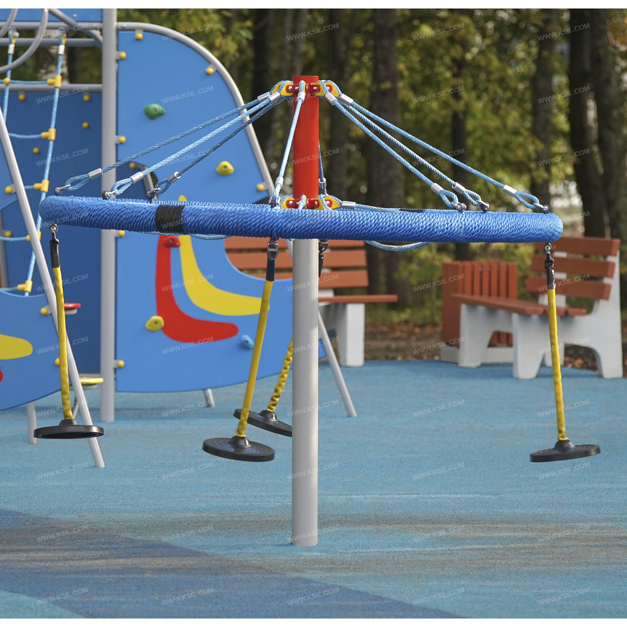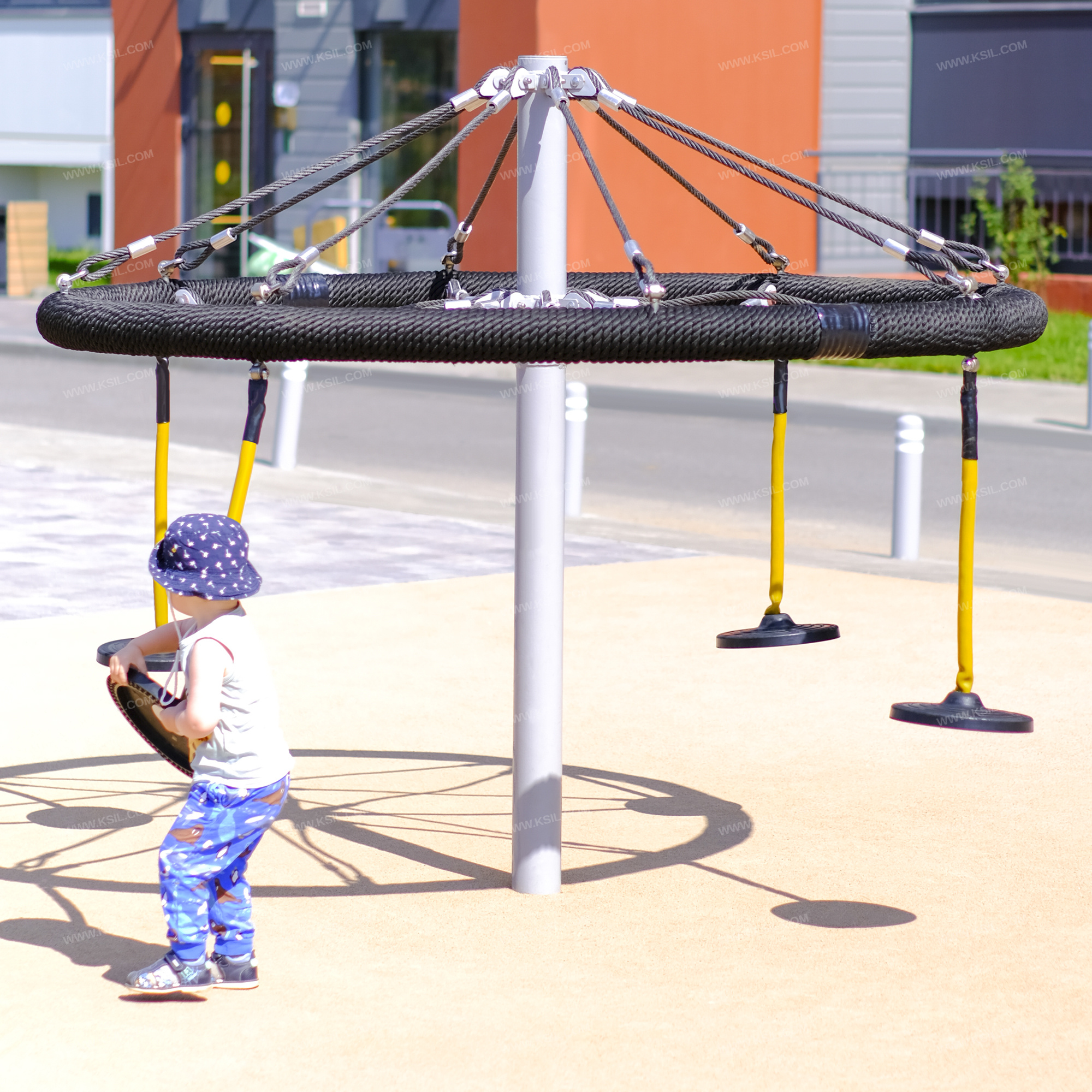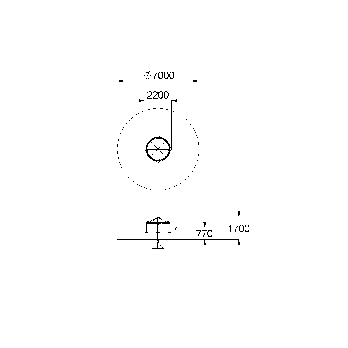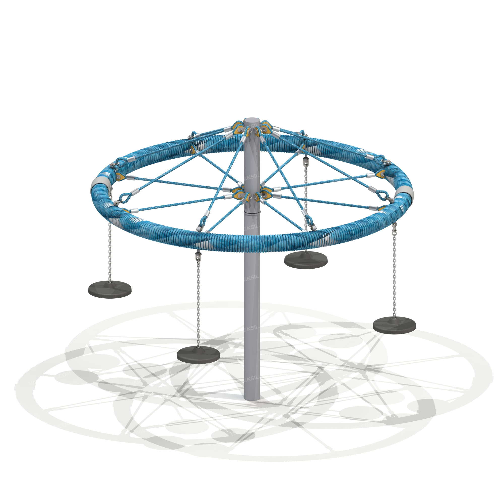 На обруче диаметром не менее 2000 мм, выполненного из стальной трубы, плотно оплетенной полиамидным канатом, должны быть установлены 4 гибкие подвески выполнены из металлической цепи диаметром 6мм с резиновыми сиденьями. Обруч должен крепиться к несущей стойке в центральной и верхней точке на 8-ми лучах из полипропиленового армированного каната аналогично в обоих случаях. Канаты должны быть надежно закреплены специальными пластиковыми креплениями и зажимами из алюминиевого сплава, позволяющими удерживать конструкцию под нагрузкой. В местах крепления канатов к наружному кольцу и центральной стойке должны быть использованы закрытые коуши. Несущая вертикальная стойка карусели выполнена из металлической трубы диаметром 100мм.