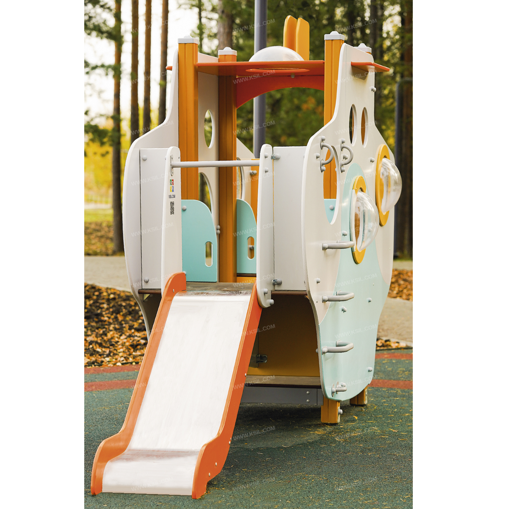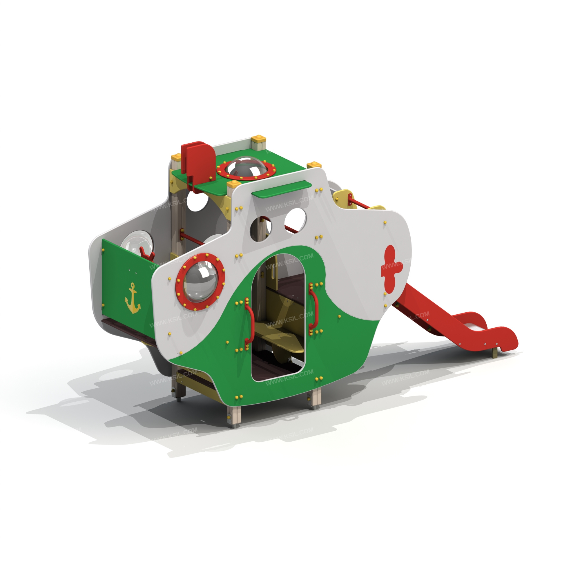 Детский игровой комплекс должен представлять собой модульную сборно-разборную конструкцию в виде подводной лодки «Наутилус». Подводная лодка должна включать в себя боковые стенки с входами, один в виде арки, другой в виде люка с ведущими к нему поручнями, горку, альпинистскую стенку, три разных по уровню внутренних отсека. Подводная лодка должна быть стилизована окнами-иллюминаторами и декоративным перископом. Несущие столбы комплекса должны быть выполнены из клееного деревянного бруса сечением не менее 100х100 мм и иметь скругленный профиль с канавкой посередине. Сверху столб должен заканчиваться пластиковой заглушкой, снизу столб должен заканчиваться металлическим оцинкованным подпятником диаметром не менее 42 мм, который бетонируется в землю.Пол башни должен быть выполнен из влагостойкой противоскользящей фанеры толщиной не менее 21 мм. Горка должна состоять из ската, бортиков, защитной секции и защитной перекладины. Горка должна иметь стартовый участок высотой не менее 950 мм, участок скольжения и конечный участок. Скат должен быть изготовлен из единого листа нержавеющей стали толщиной 1,5 мм, утопленный в паз бортиков горки. Бортики горки должны быть высотой не менее 100 мм. Защитная перекладина должна быть выполнена из металлической трубы диаметром не менее 33 мм, побуждающая ребенка присесть и установлена на высоте не менее 600 мм от уровня поверхности стартового участка горки. Защитная секция горки должна быть выполнена из влагостойкой фанеры толщиной не менее 21 мм. Перекладины, поручни должны быть выполнены из металлической трубы диаметром не менее 33 мм.Альпинистская стенка с отверстиями для рук и ног, перископ, стенки, крыша, должны быть выполнены из влагостойкой фанеры толщиной не менее 21 мм. Декоративные элементы в виде якоря, винта должны быть выполнены из влагостойкой фанеры толщиной не менее 9 мм.