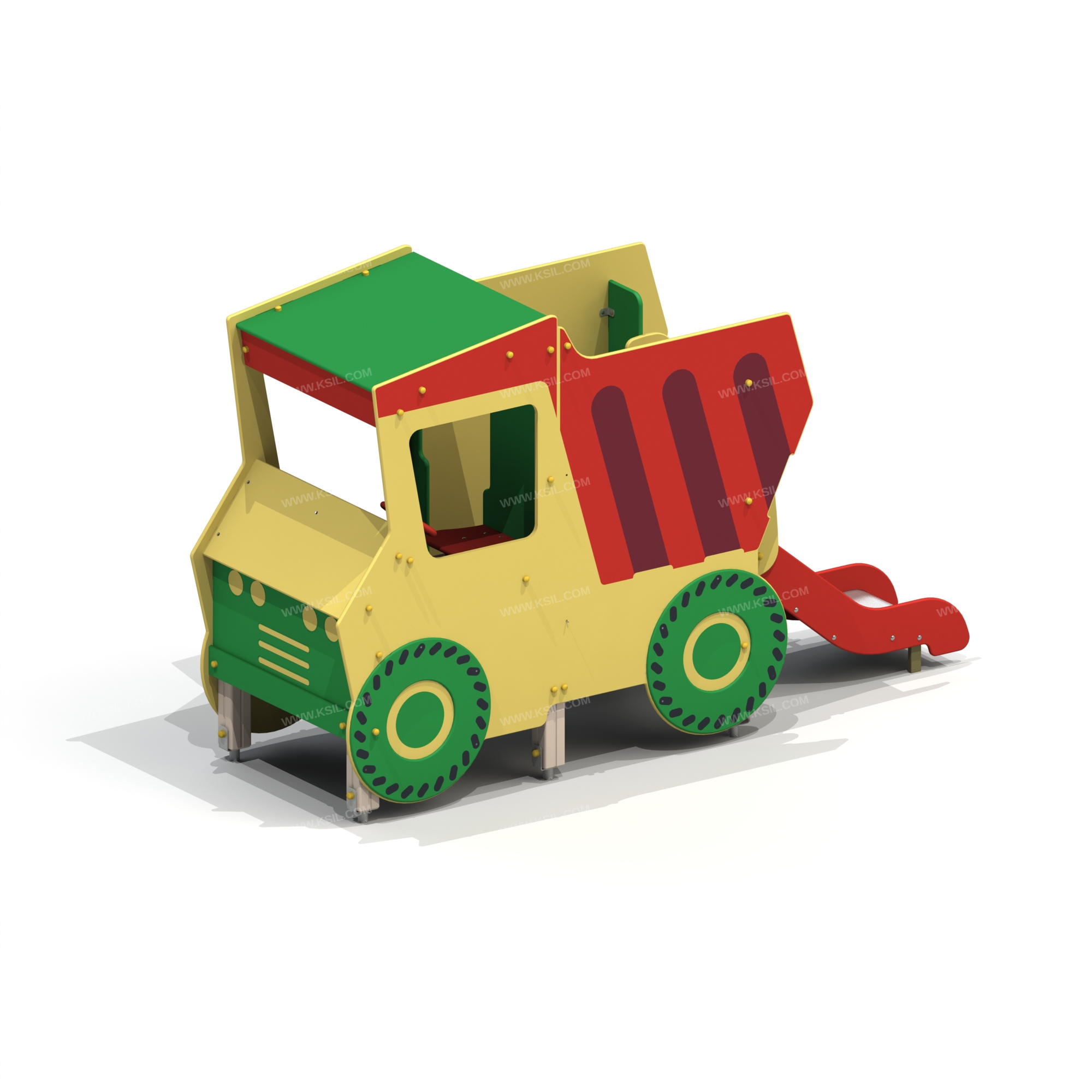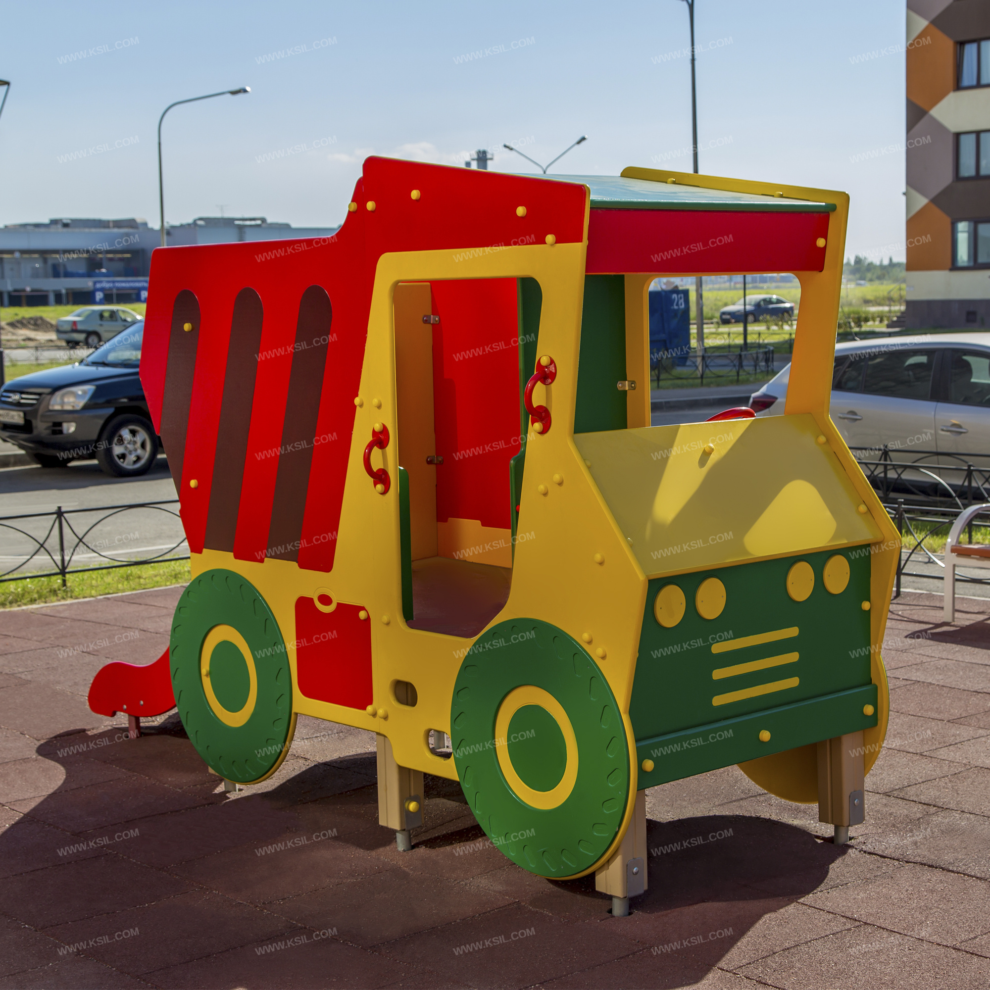 Детский игровой комплекс должен представлять собой устойчивую, модульную конструкцию из игровых и развивающих элементов, стилизованных под самосвал. Самосвал должен состоять из двух башен, имитирующие кабину и кузов самосвала. К башне 1 с крышей, с высотой площадки не менее 645 мм должны быть пристроены: боковые стенки с входом, с вырезами для ног и поручнями, задняя стенка с вырезом в виде двери, передняя стенка с декоративными элементами в виде решетки радиатора, фар и панели с рулем, педалью и рычагом передач. К башне 2 с высотой площадки не менее 650 мм должны быть пристроены: фанерные ограждения, горка. По боковым сторонам конструкции должны крепиться декоративные накладные элементы в виде колес. Несущие столбы комплекса должны быть выполнены из клееного деревянного бруса сечением не менее 100х100 мм и иметь скругленный профиль с канавкой посередине. Снизу столб должен заканчиваться металлическим оцинкованным подпятником диаметром не менее 42 мм, который бетонируется в землю.Полы башен должны быть выполнены из влагостойкой фанеры толщиной не менее 21 мм. Стенки башен, ограждения, крыша, скамейки должны быть изготовлены из влагостойкой окрашенной фанеры толщиной не менее 21 мм.Поручни должны быть выполнены из металлических труб диаметром не менее 21 мм.Декоративные накладные элементы должны быть выполнены из влагостойкой фанеры толщиной не менее 9 мм.Горка должна состоять из ската, бортиков, защитной секции и защитной перекладины. Горка должна иметь стартовый участок высотой не менее 645 мм, участок скольжения и конечный участок. Скат должен быть изготовлен из единого листа нержавеющей стали толщиной 1,5 мм, утопленный в паз бортиков горки. Бортики горки, выполненные из влагостойкой фанеры толщиной не менее 21 мм должны быть высотой не менее 100 мм. Защитная перекладина должна быть выполнена из металлической трубы диаметром не менее 33 мм, побуждающая ребенка присесть и установлена на высоте не менее 600 мм от уровня поверхности стартового участка горки. Защитная секция горки должна быть выполнена из влагостойкой фанеры толщиной не менее 21 мм.