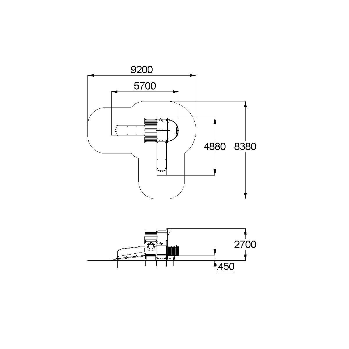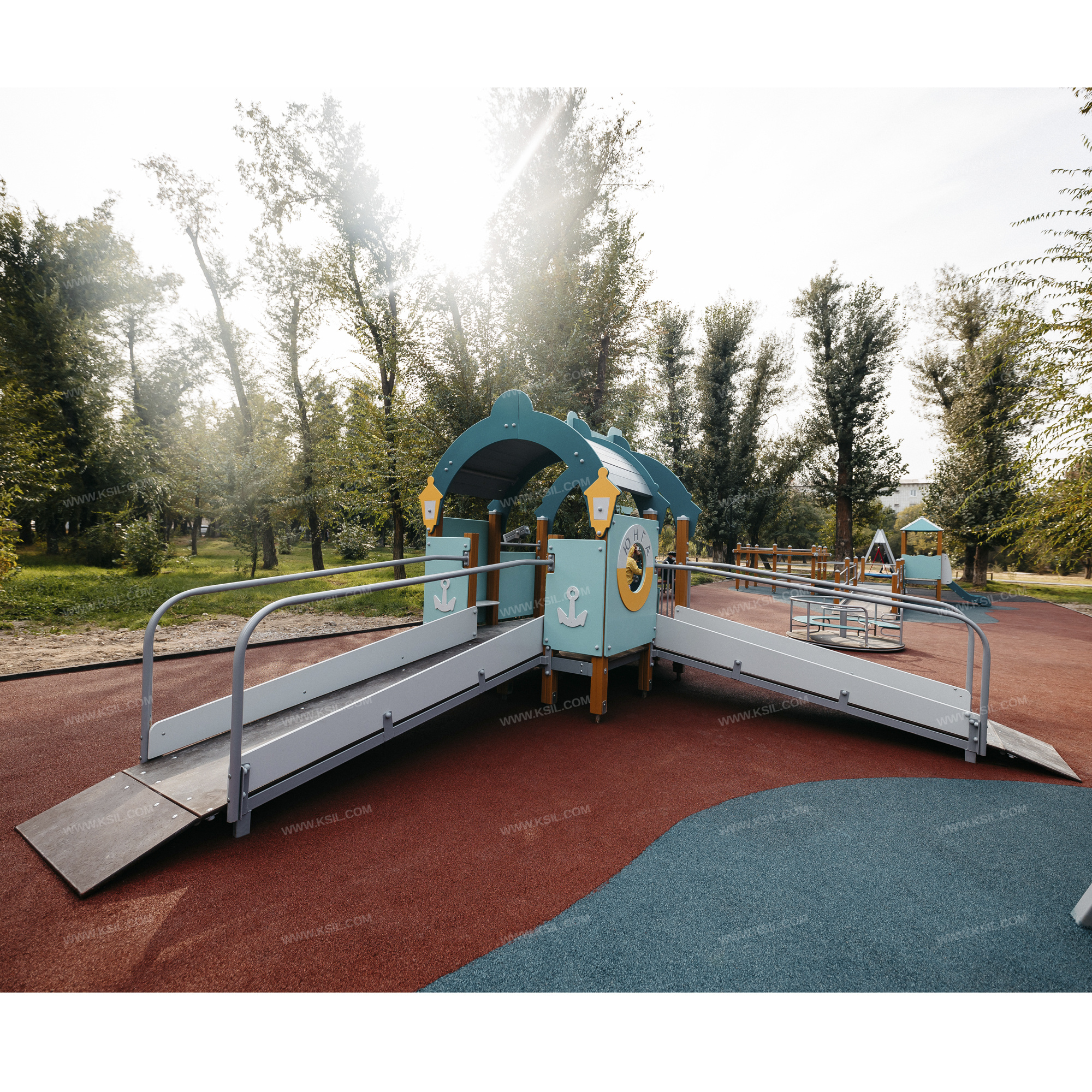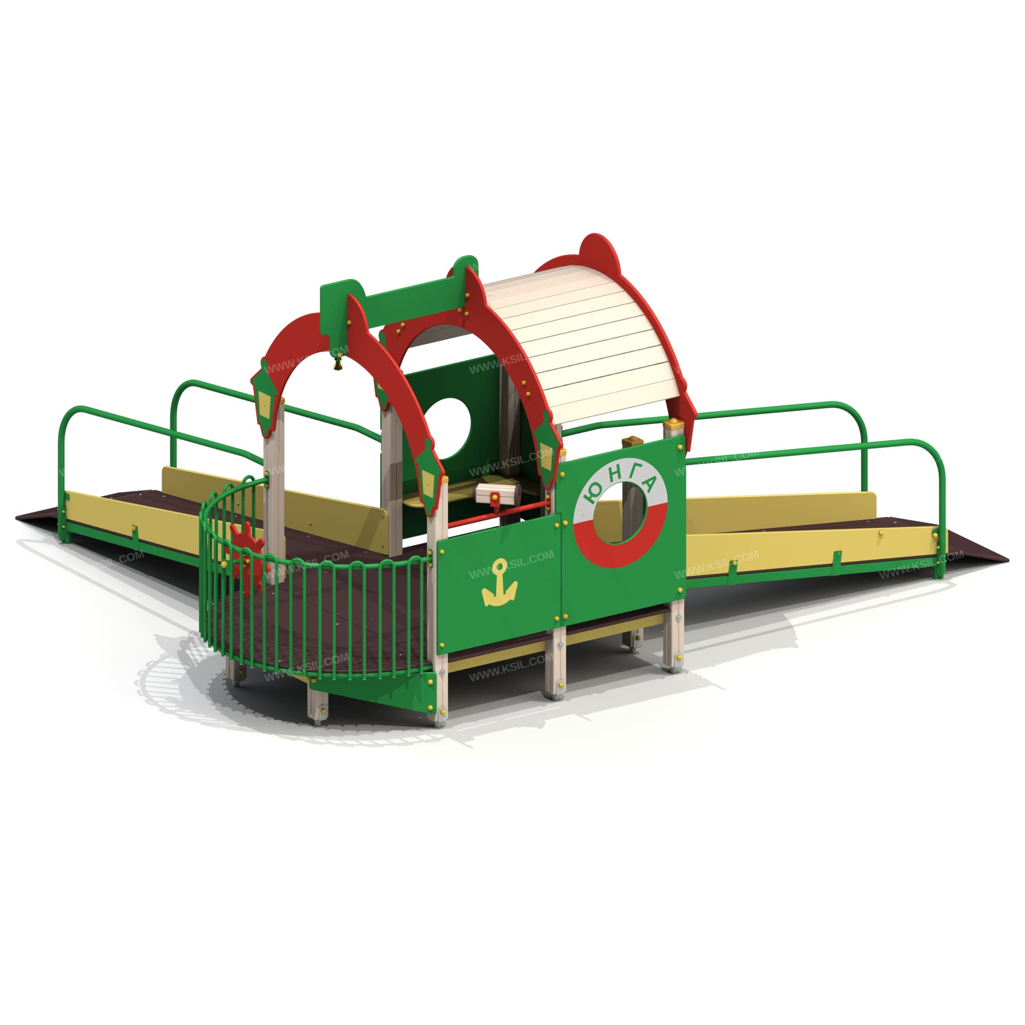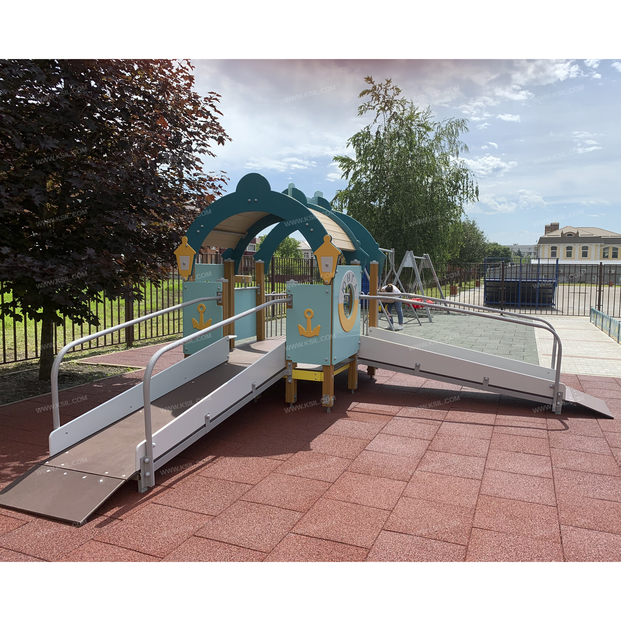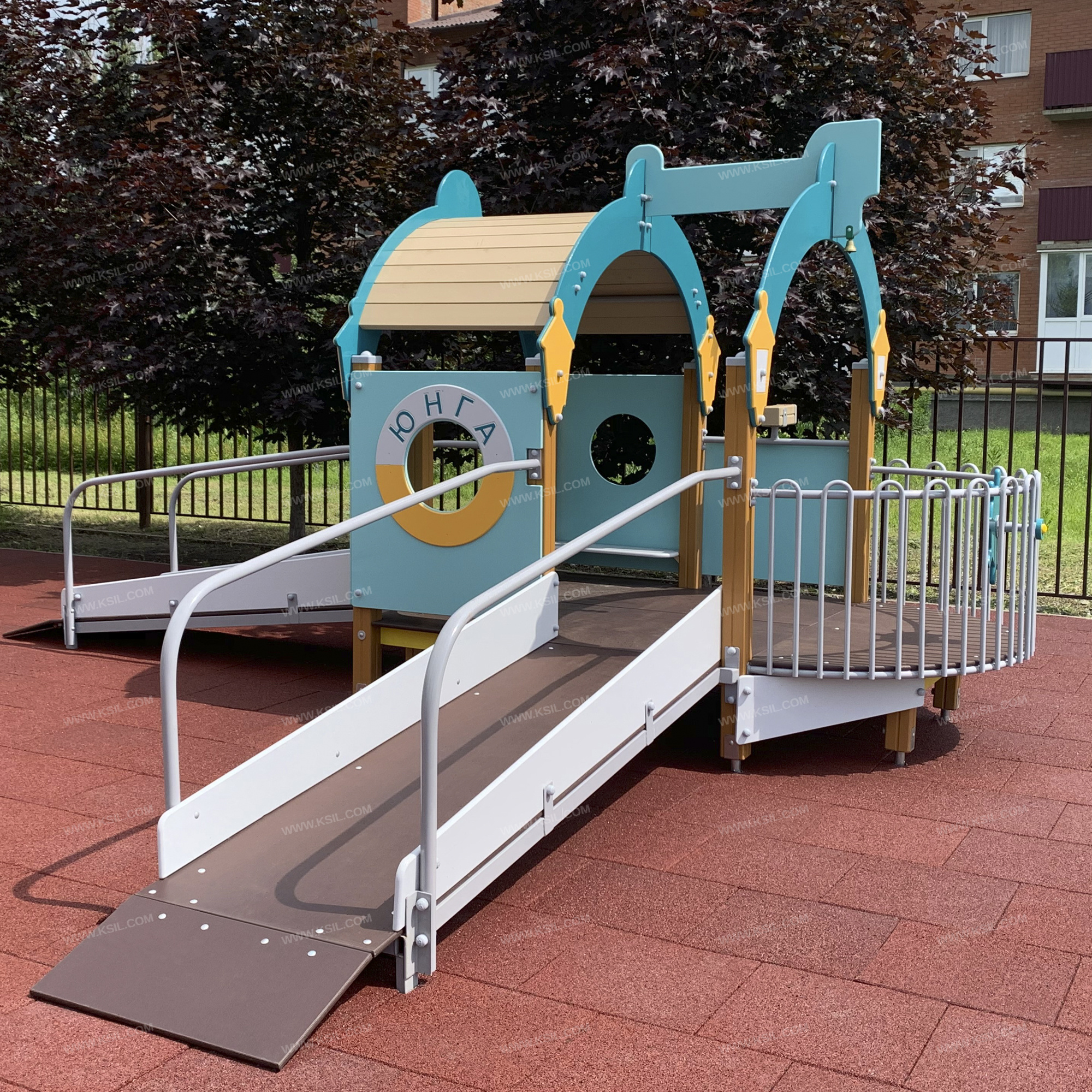 Детский игровой комплекс должен быть предназначен для детей с ограниченными физическими возможностями и представлять собой модульную сборно-разборную конструкцию, состоящую из башни с крышей. К башне должны быть пристроены 2 подъема в виде пандуса. К башне с арочной крышей, с высотой площадки не менее 450 мм должны быть пристроены: ограждение в морской тематике с круглым отверстием с художественной росписью, радиусный балкон со штурвалом, скамейки.Несущие столбы должны быть выполнены из клееного деревянного бруса сечением не менее 100х100 мм и иметь скругленный профиль с канавкой посередине. Сверху столб должен заканчиваться пластиковой заглушкой желтого цвета, снизу столб должен заканчиваться металлическим оцинкованным подпятником диаметром не менее 42 мм, который бетонируется в землю. Для увеличения жесткости конструкции в опорных столбах должны быть сделаны специальные запилы, в которые закрепляются прогоны пола, изнутри зафиксированные специальными оцинкованными уголками.Крыша башни должна состоять из 3-х арочных элементов, соединенных в первой секции фигурным коньком, во второй секции деревянными досками толщиной не менее 40 мм. Арки и конек должны быть выполнены из влагостойкой фанеры толщиной не менее 21 мм. Пол башни должен быть выполнен из влагостойкой противоскользящей фанеры толщиной не менее 21 мм. Радиусный балкон должен состоять из пола, выполненного из влагостойкой ламинированной противоскользящей фанеры толщиной не менее 21 мм и радиусного металлического ограждения из труб диаметрами не менее 21 мм и не менее 33 мм. Ограждения башни, штурвал должны быть выполнены из влагостойкой фанеры толщиной не менее 21 мм.Наклонный пандус должен состоять из настила и перил. Настил должен быть выполнен из влагостойкой противоскользящей фанеры толщиной не менее 21 мм. Перила должны быть выполнены из металлической трубы диаметром не менее 33 мм. Ограждение пандуса должно быть изготовлено из влагостойкой фанеры толщиной не менее 21 мм. Металлический каркас пандуса должен быть разборным и состоять из металлической профильной трубы сечением не менее 50х25 мм.