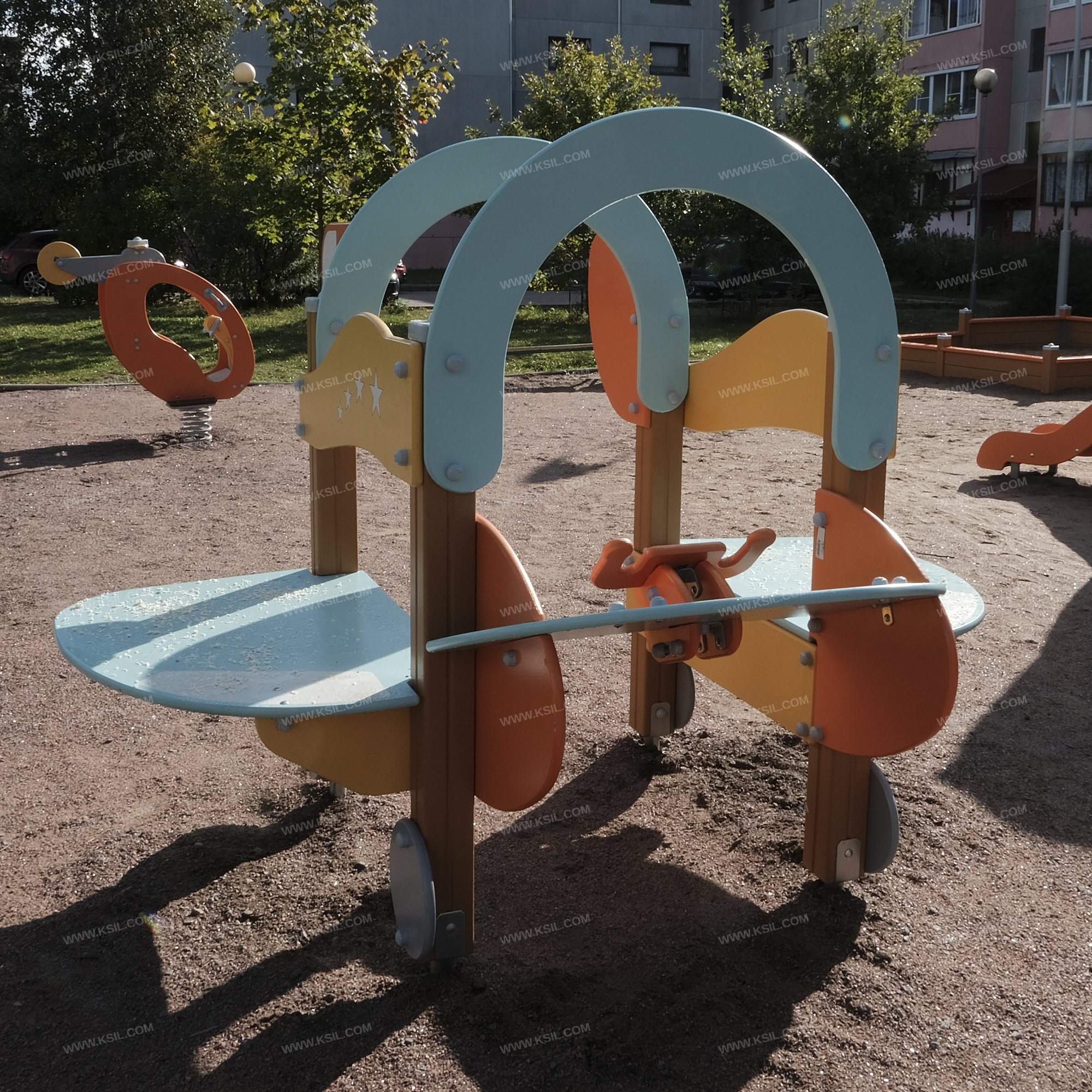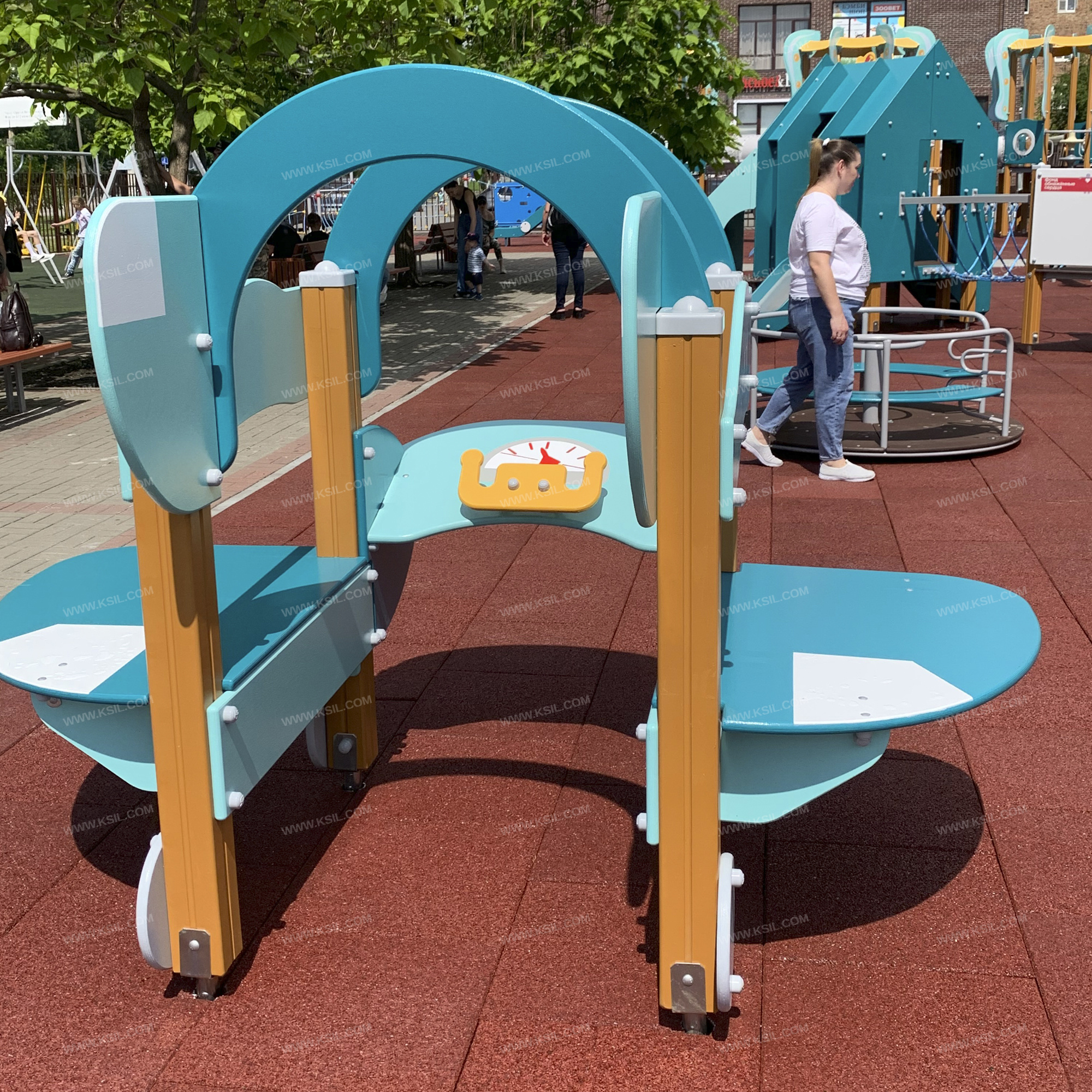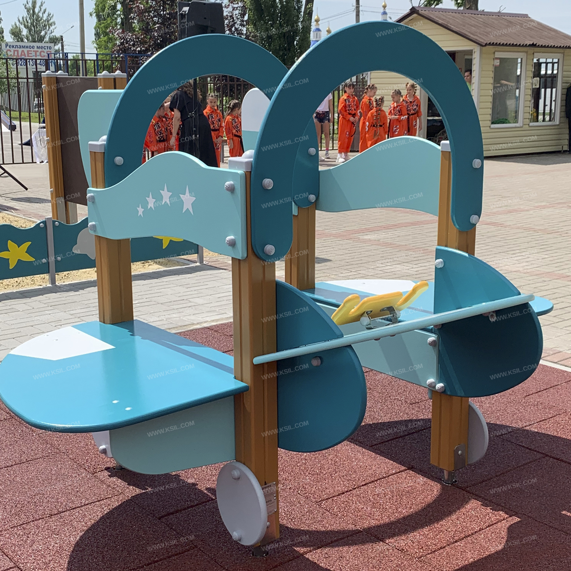 Детский игровой комплекс должен представлять собой устойчивую, модульную конструкцию из игровых и развивающих элементов, стилизованных под самолет для детей с ограниченными физическими возможностями. Самолетик представляет собой конструкцию из несущих стоек, сидений, имитирующих крылья самолета, имитации арок, столика имитирующего кабину пилота, усиливающих элементов, имитирующих двигатель самолета, ограждений, декоративных элементов в виде шасси самолета, стабилизаторов высоты.Несущие стойки должны располагаться в углах условного квадрата, выполнены из клееного деревянного бруса сечением не менее 100х100 мм и иметь скругленный профиль с канавкой посередине. Сверху столб должен заканчиваться пластиковой заглушкой, снизу столб должен заканчиваться металлическим оцинкованным подпятником диаметром не менее 42 мм, который бетонируется в землю.Сиденья, арки, столик, усиливающие элементы, ограждения, декоративные элементы в виде шасси самолета, стабилизаторы высоты должны быть выполнены из влагостойкой фанера толщиной не менее 21 мм.