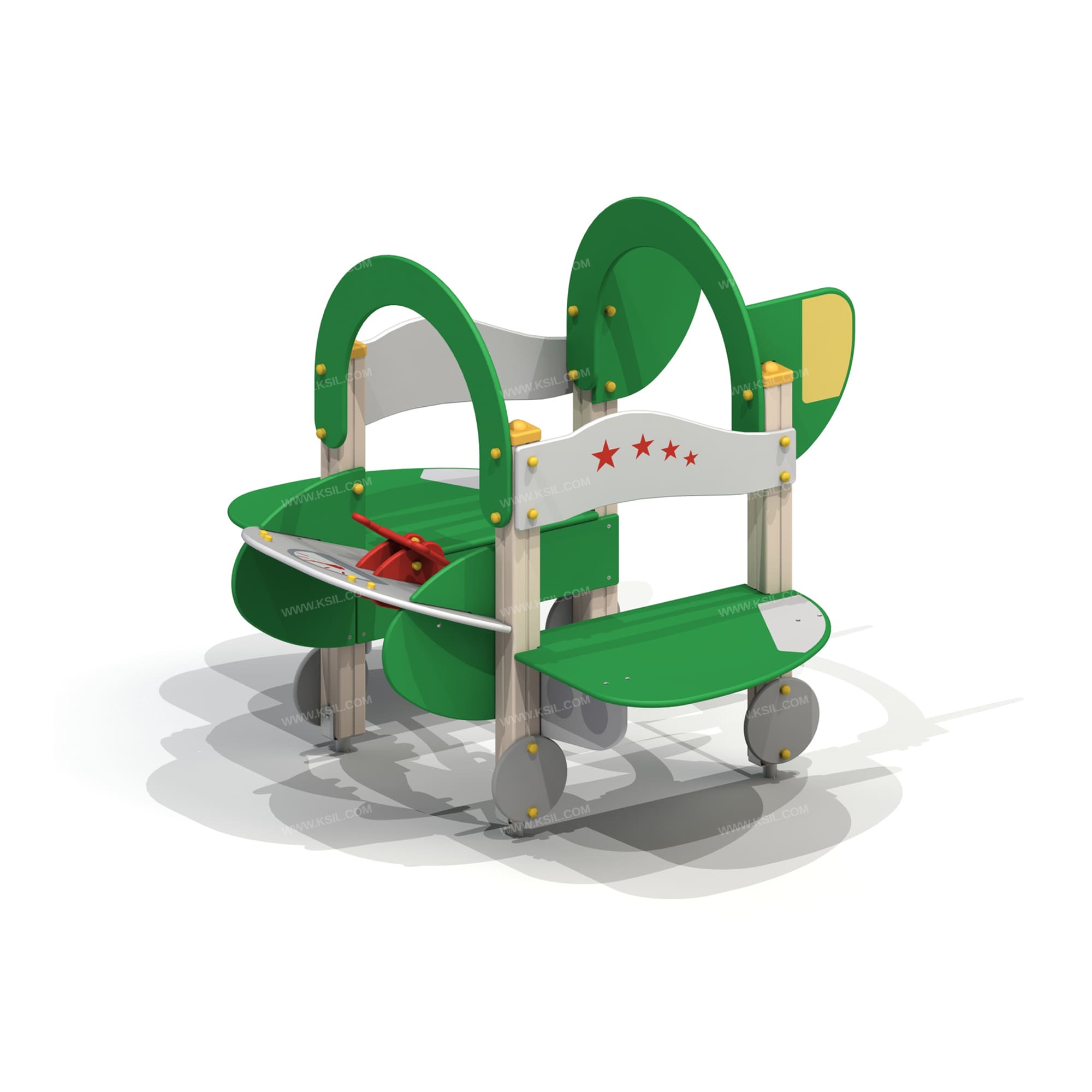 Самолетик представляет собой конструкцию из несущих стоек, сидений, имитирующих крылья самолета, имитации арок, столика имитирующего кабину пилота, усиливающих элементов, имитирующих двигатель самолета, ограждений, декоративных элементов в виде шасси самолета, стабилизаторов высоты.