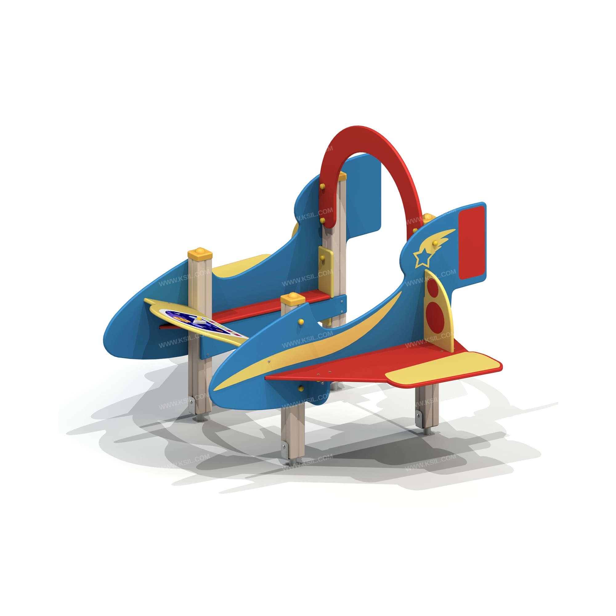 Самолетик представляет собой конструкцию из несущих стоек, сидений, имитирующих крылья самолета, имитации арок, панель управления имитирующую кабину пилота, усиливающих элементов, имитирующих двигатель самолета, ограждений, декоративных элементов в виде шасси самолета, стабилизаторов высоты.