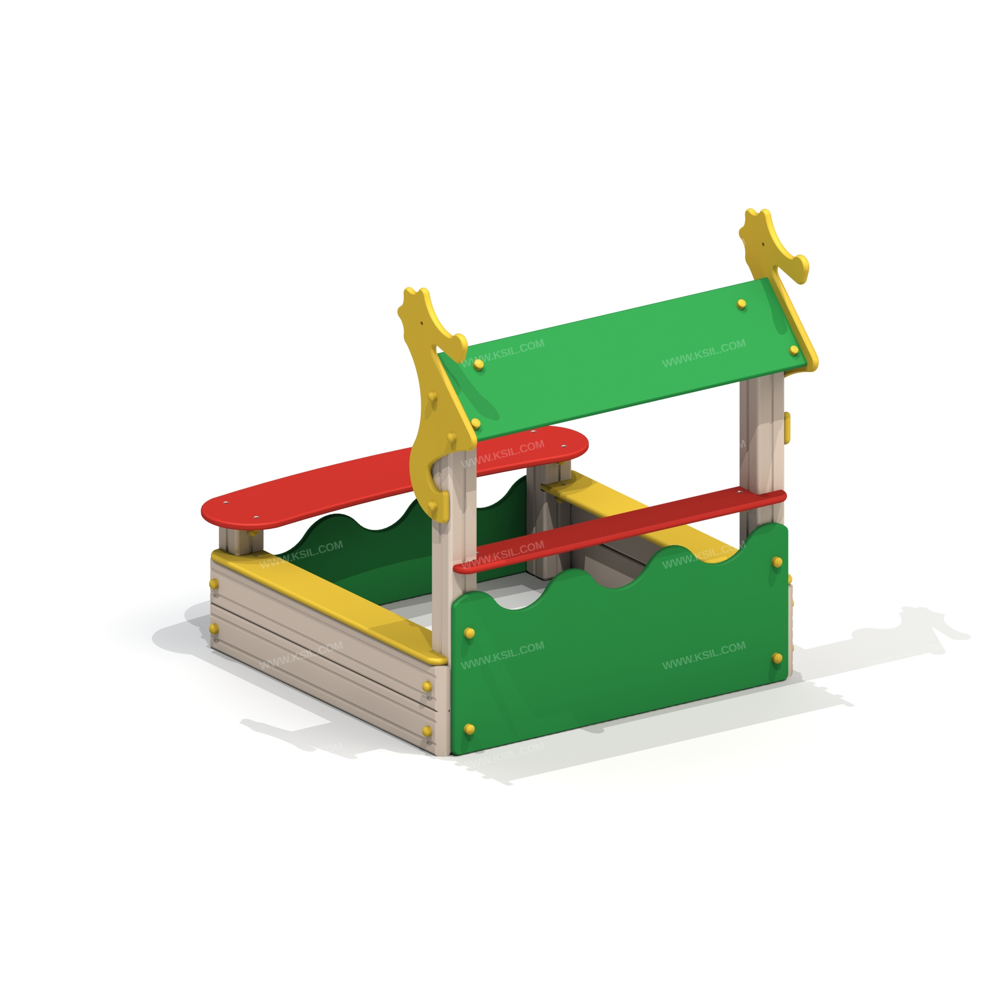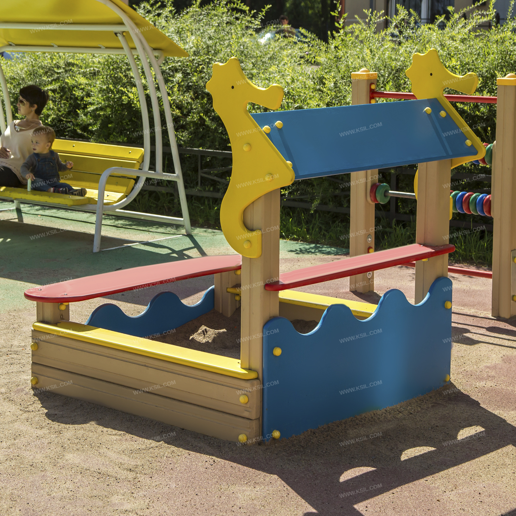 Песочница должна представлять собой устойчивую, модульную конструкцию обеспечивающую ребенку комфортные условия для игры с песком на открытом воздухе. Песочница должна быть стилизована под тематику аквариума и состоять из несущих столбов с прикрепленными к ним по периметру ограждениями, бортами, сиденьями. На 2-х столбах должен быть установлен спойлер с фанерными накладными элементами в виде морских коньков.Несущие столбы должны быть выполнены из клееного деревянного бруса сечением не менее 100х100 мм и иметь скругленный профиль с канавкой посередине. Снизу столб должен заканчиваться металлическим оцинкованным подпятником диаметром не менее 42 мм, который бетонируется в землю.Спойлер, сиденья, ограждения должны быть изготовлены из влагостойкой фанеры толщиной не менее 21 мм. Борта песочницы должны быть выполнены из деревянной доски толщиной не менее 40 мм.