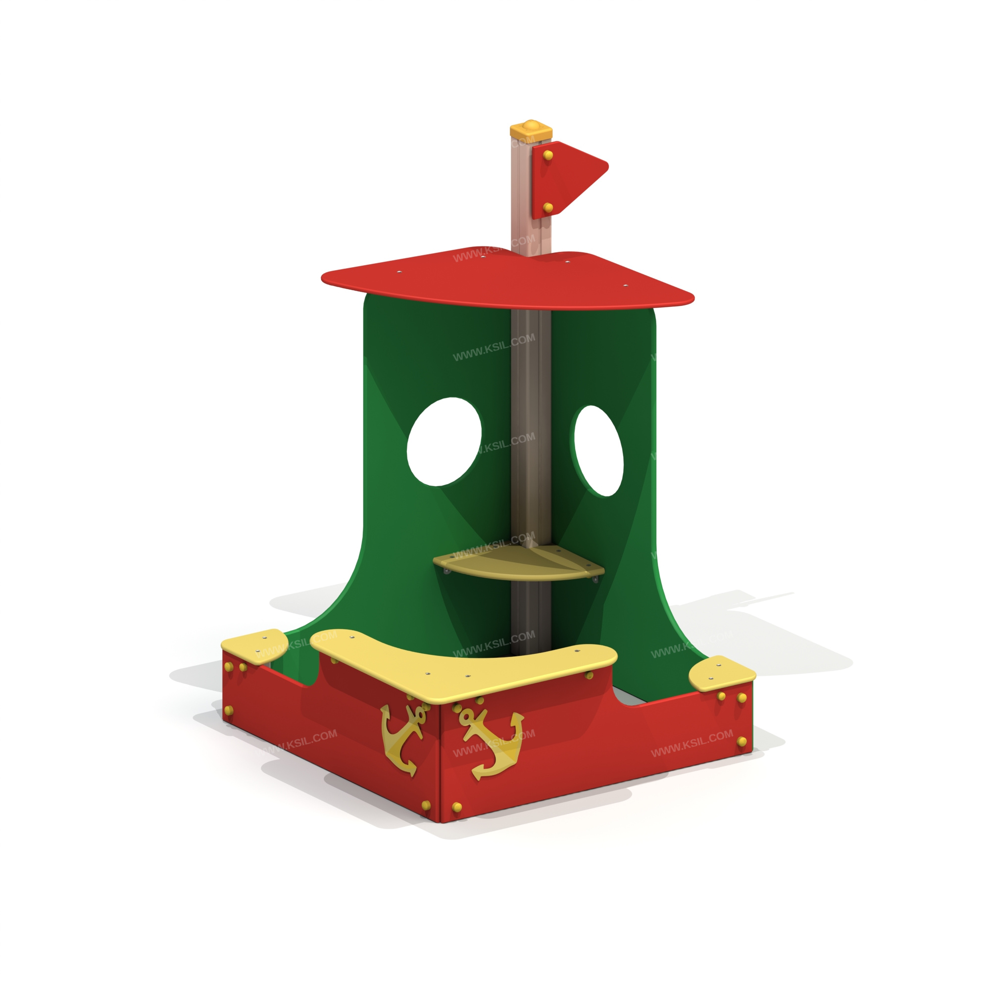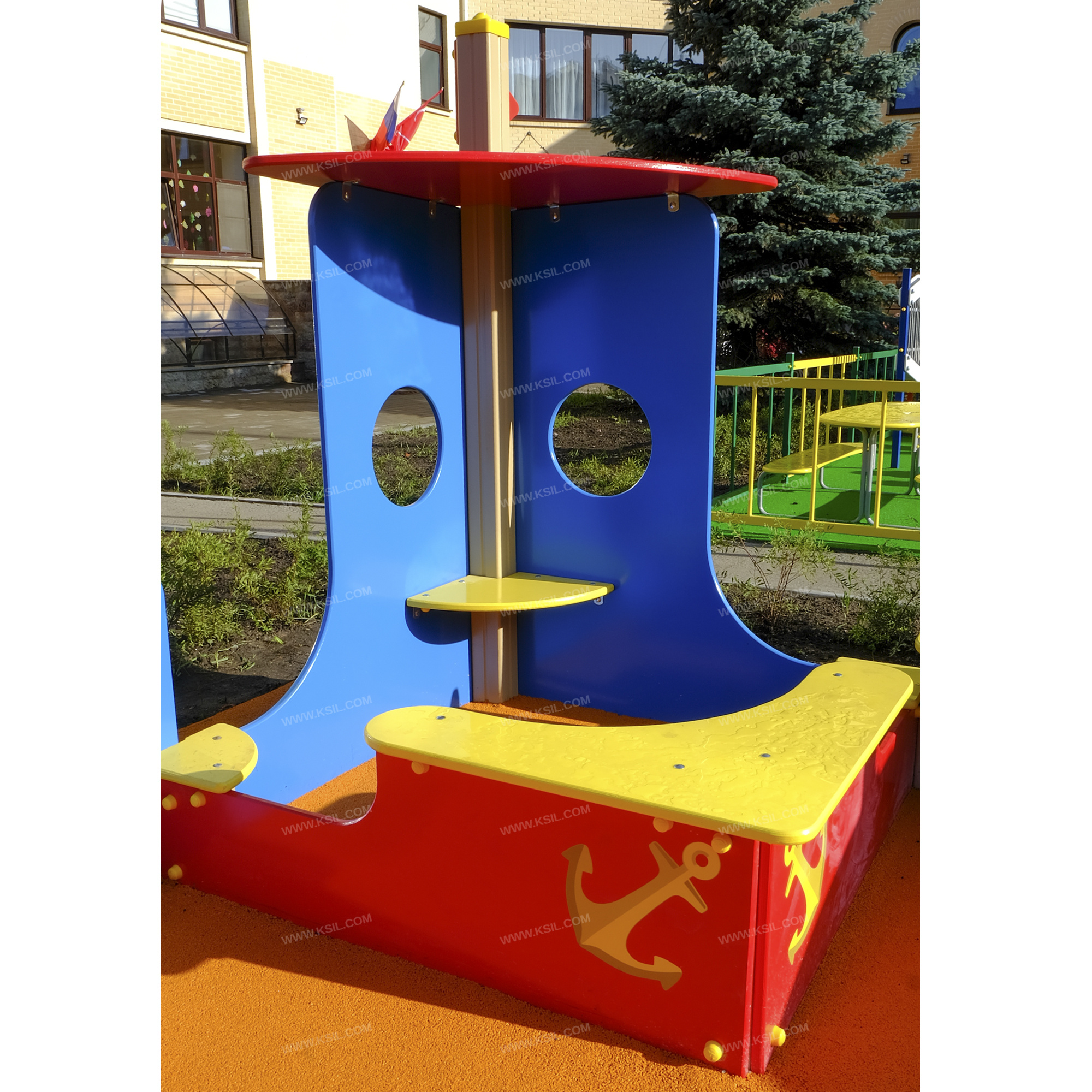 Песочница должна представлять собой устойчивую, модульную конструкцию, обеспечивающая ребенку комфортные условия для игры с песком на открытом воздухе. Конструкция песочницы должна быть стилизована под катер. Песочница должна включать в себя несущие столбы, 2 борта, 3 сиденья, 2 боковые стенки с круглым отверстием, крышу, столик, и декоративные элементы. К несущему столбу должен крепиться декоративный флаг. Несущие столбы комплекса должны быть выполнены из клееного деревянного бруса сечением не менее 100х100 мм и иметь скругленный профиль с канавкой посередине. Снизу столб должен заканчиваться металлическим оцинкованным подпятником диаметром не менее 42 мм, который бетонируется в землю.Борта, сиденья, навес крыши, декоративный флаг, столик, стенки должны быть выполнены из влагостойкой фанеры толщиной не менее 21 мм. Декоративные элементы с морской тематикой должны быть выполнены из влагостойкой фанеры толщиной не менее 9 мм.