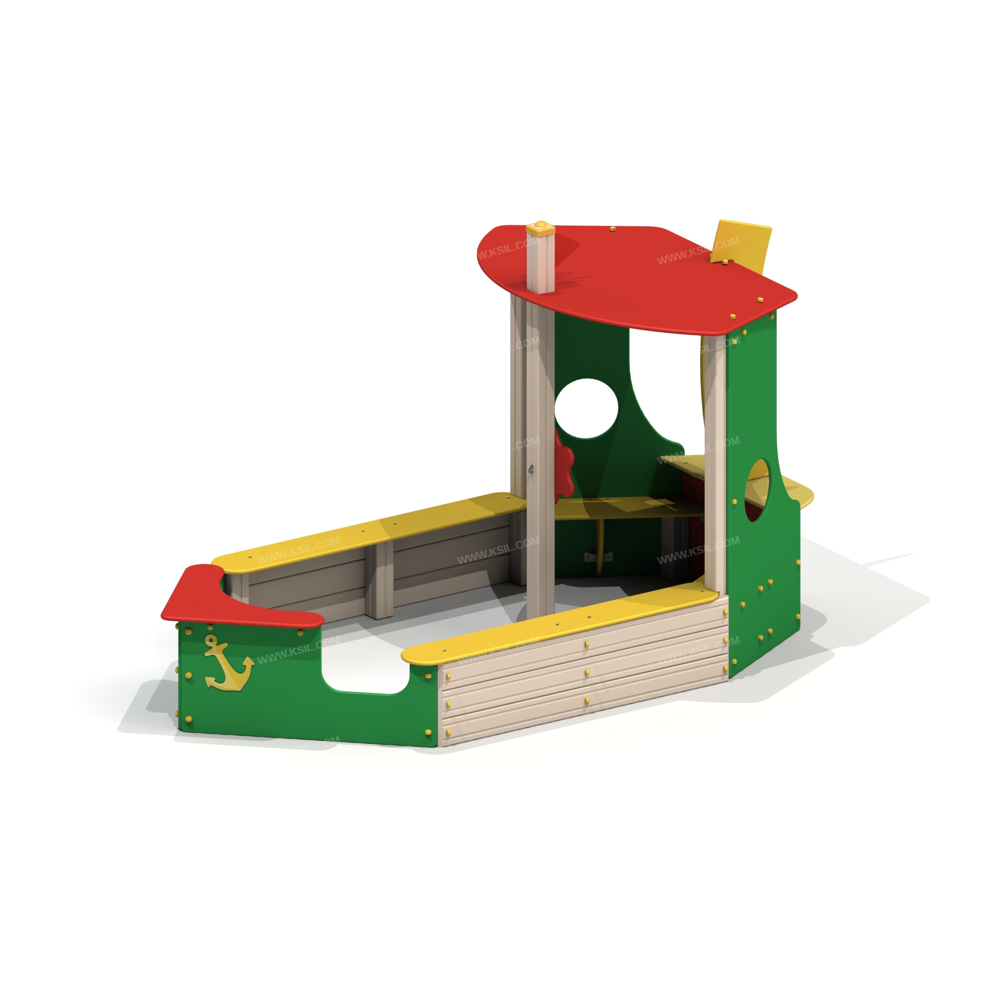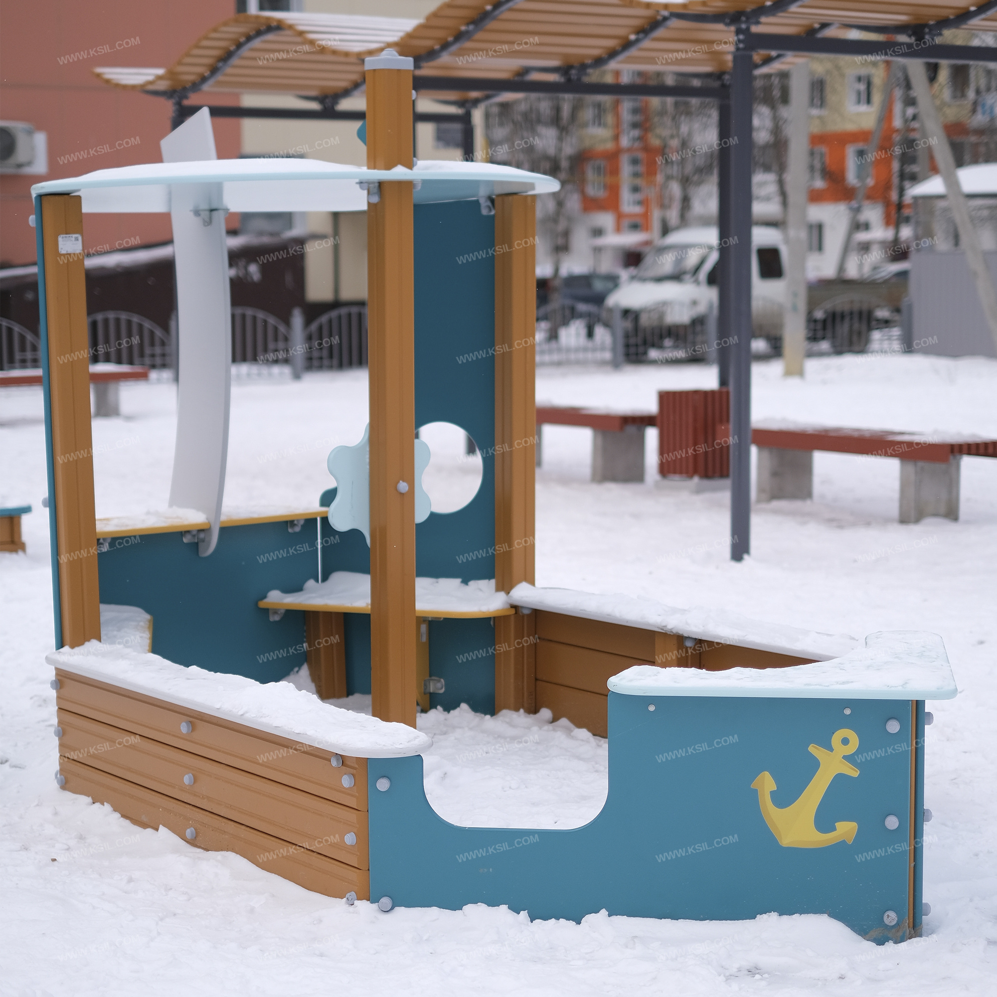 Песочница должна представлять собой устойчивую, модульную конструкцию из игровых и развивающих элементов, обеспечивающие ребенку комфортные условия для игры с песком на открытом воздухе. Конструкция песочницы должна быть стилизована в виде «Кораблика». Песочница должна включать в себя несущие столбы, борта, угловые стенки, при соединении образующие нос корабля, скамейки, расположенные поверх бортов и возле боковых стенок, боковые стенки с круглым отверстием, установленные между бортами и задней стенкой, крышу, усиливающий элемент, столик, установленный поверх задней стенки и декоративные элементы. Между столиком и крышей должен быть установлен усиливающий элемент в виде паруса. Несущие разновысокие столбы комплекса должны быть выполнены из клееного деревянного бруса сечением не менее 100х100 мм и иметь скругленный профиль с канавкой посередине. Снизу столб должен заканчиваться металлическим оцинкованным подпятником диаметром не менее 42 мм, который бетонируется в землю.Борт должен состоять из 3-х досок толщиной не менее 40 мм, скрепленных между собой. Скамейки, крыша, усиливающий элемент, столик должны быть выполнены из влагостойкой фанеры толщиной не менее 21 мм. Боковые экраны должны быть выполнены из влагостойкой фанеры толщиной не менее 21 мм с художественной росписью в морской тематике.