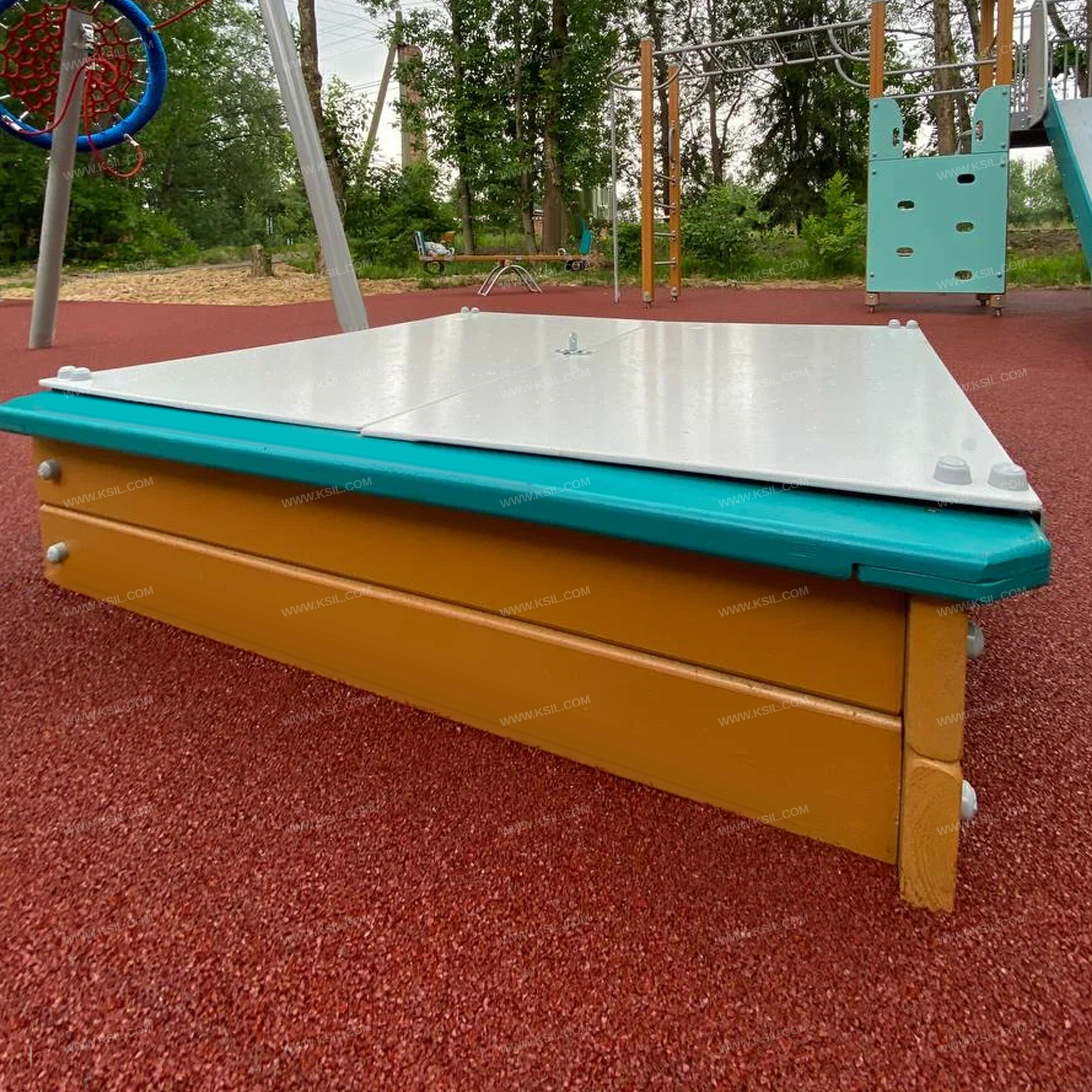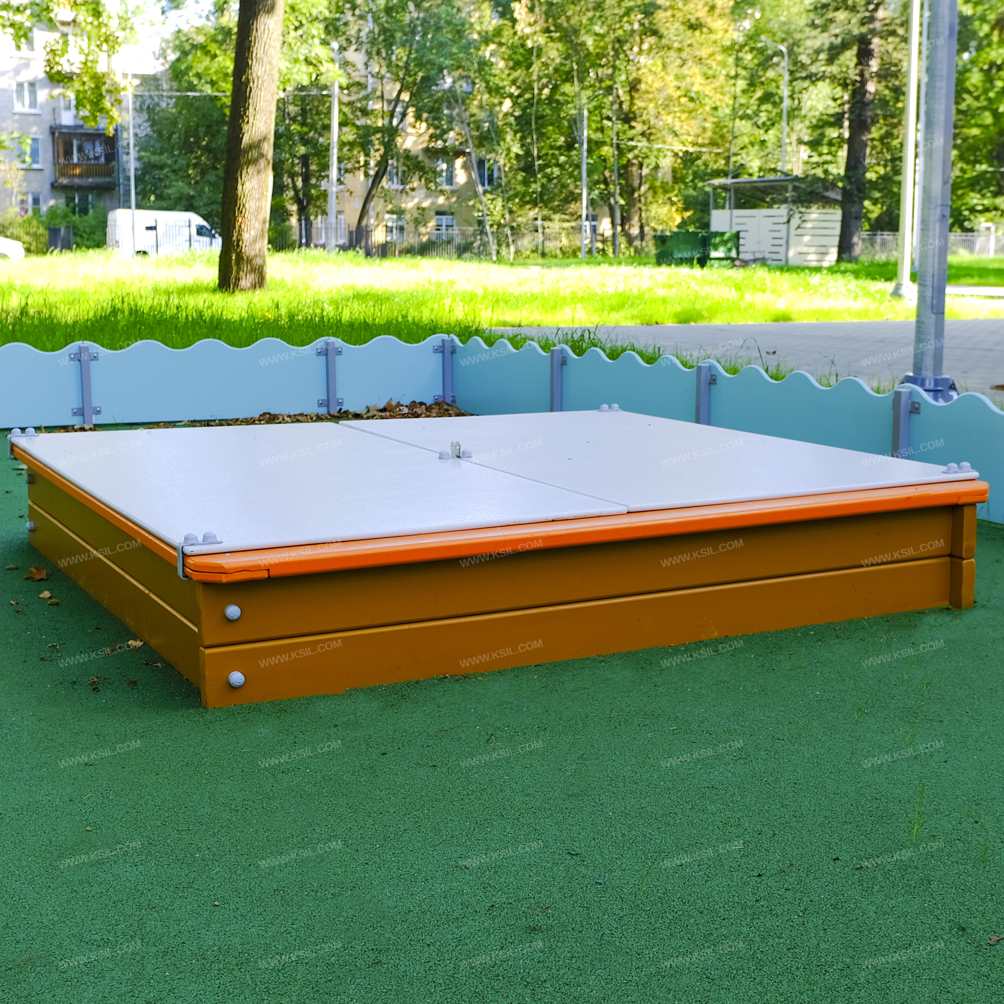 Песочница должна представлять собой устойчивую конструкцию обеспечивающую ребенку комфортные условия для игры с песком на открытом воздухе. Песочница должна состоять из 8-ми бортовых, 4-х накрывочных досок и полностью съемной крышки. Бортовые и накрывочные доски должны быть выполнены из доски сечением не менее 140х40 мм. Крышка должна состоять из 2- х частей выполненных из влагостойкой фанеры толщиной не менее 9 мм. Накрывочные доски должны стыковаться методом прямой накладки (вполдерева).Бортовые доски должны быть связаны между собой металлическими уголками 40*40мм.