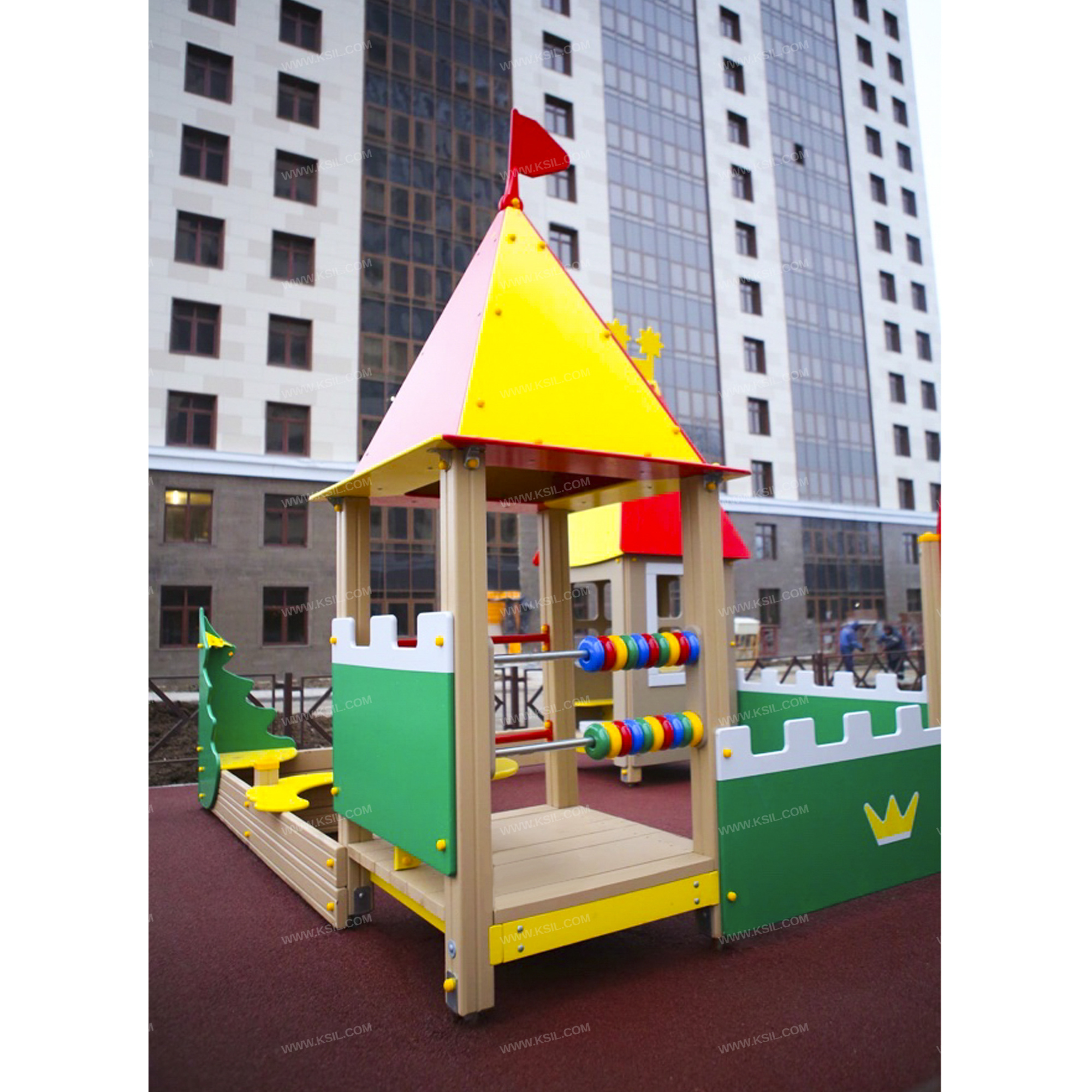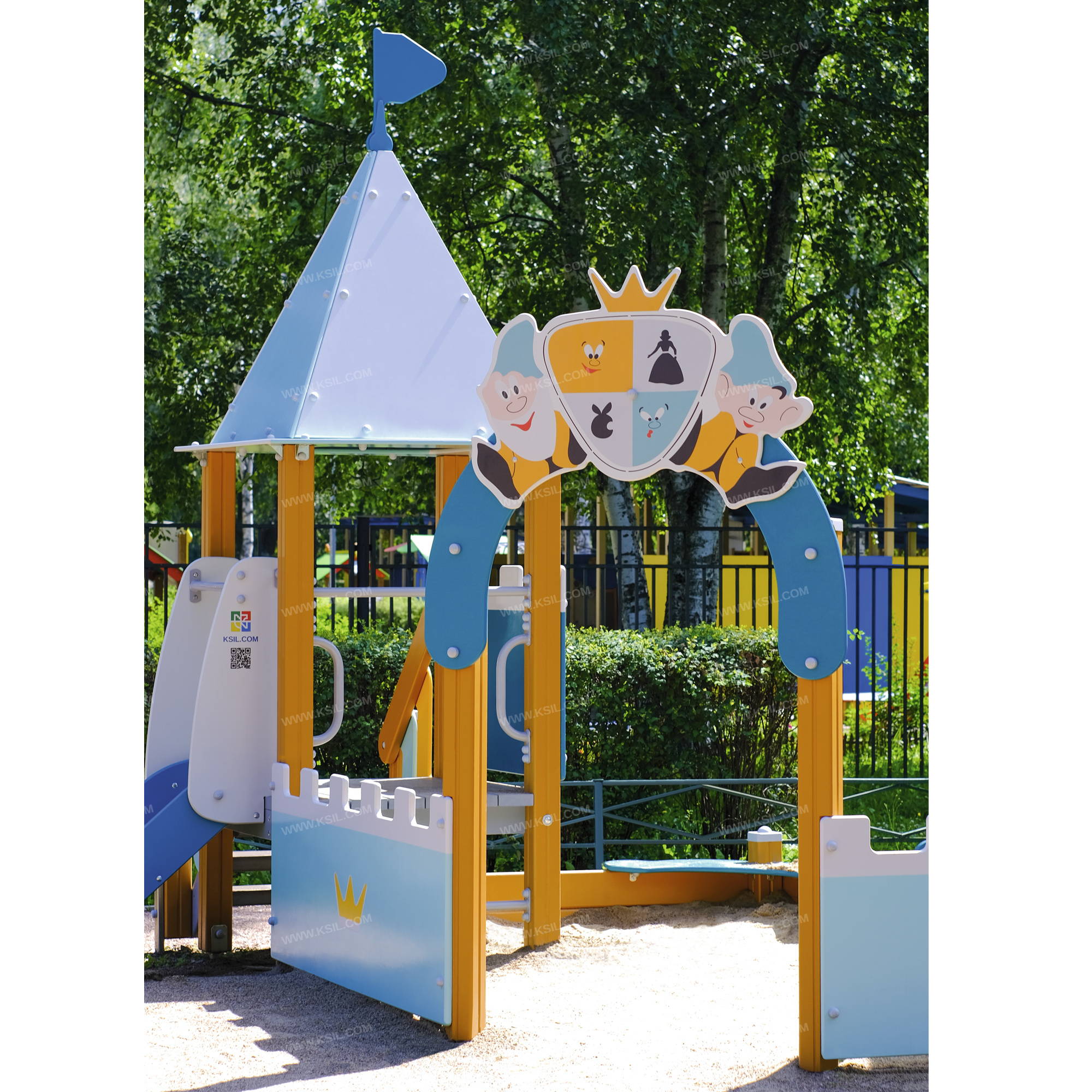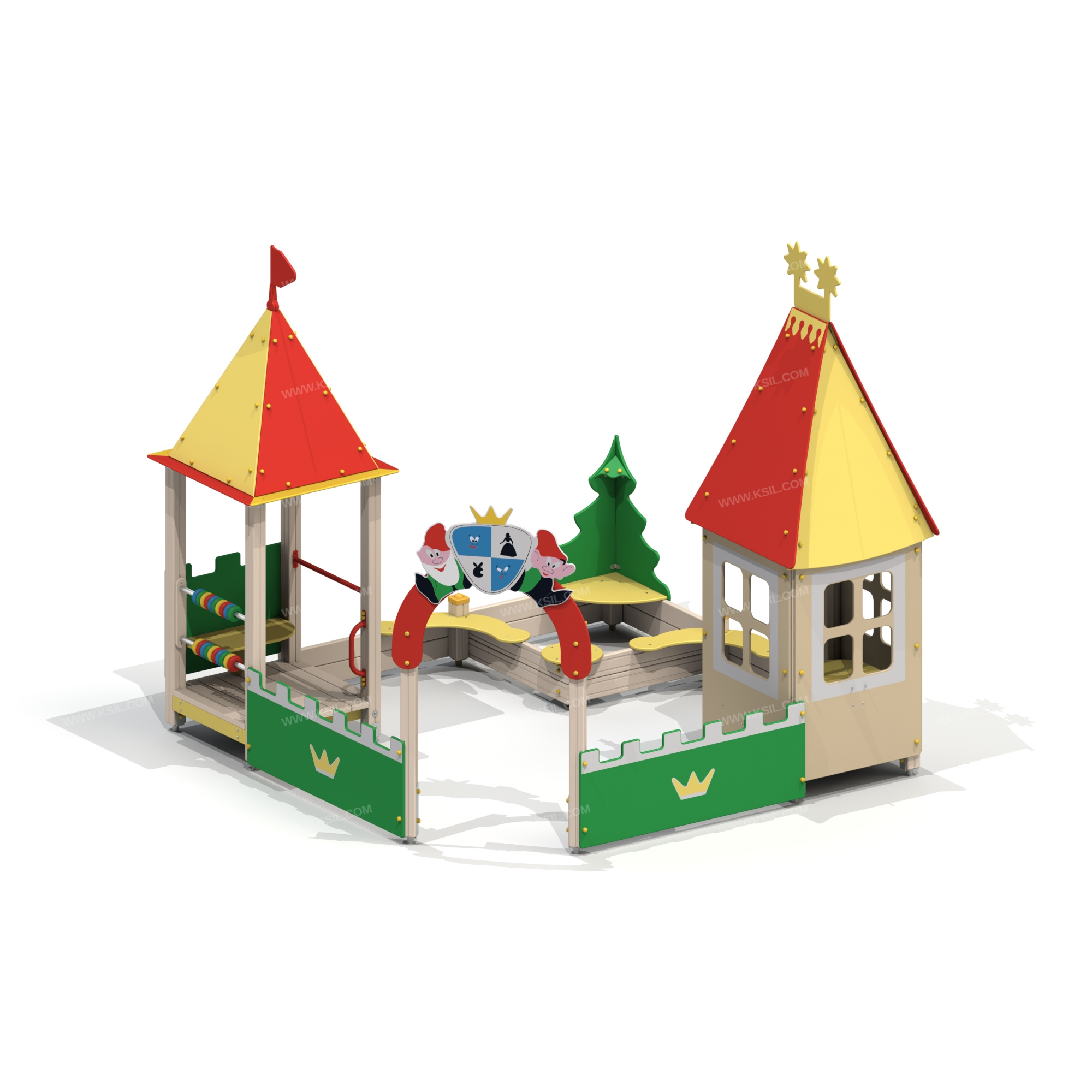Песочный дворик должен представлять собой устойчивую, модульную конструкцию из игровых и развивающих элементов, обеспечивающие ребенку комфортные условия для игры на открытом воздухе в сказочной тематике про Белоснежку и семь гномов. Песочный дворик должен состоять из одной башни с крышей, одной башни - домика, входной арки, песочницы, ограждений по периметру и декоративных элементов.К башне 1 в виде домика с крышей, с высотой площадки не менее 300 мм, должны быть пристроены: 3 боковые стенки с окошками в виде 4-х секций-прорезей, 1 стенка, обрамленных накладными элементами, 1 стенка с входом, стол, 2 скамейки К башне 2 с крышей, с высотой площадки не менее 300 мм, должны быть пристроены: счеты, фанерное ограждение, перекладина, поручень, скамейка.Несущие столбы комплекса должны быть выполнены из клееного деревянного бруса сечением не менее 100х100 мм и иметь скругленный профиль с канавкой посередине. Сверху столб должен заканчиваться пластиковой заглушкой, снизу столб должен заканчиваться металлическим оцинкованным подпятником диаметром не менее 42 мм, который бетонируется в землю.Пол башен должен быть выполнен из деревянной доски толщиной не менее 40 мм.Ограждение 1 по периметру песочного дворика, ограждения башни 2, боковые стенки домика, скамейки, стол должны быть изготовлены из влагостойкой окрашенной фанеры толщиной не менее 21 мм. Декоративные элементы в сказочной тематике про Белоснежку и семь гномов, накладные элементы окошек должны быть выполнены из влагостойкой фанеры толщиной не менее 9 мм. Входная арка должна быть установлена на несущих столбах в виде двух гномиков с гербом в руках и выполнена из влагостойкой окрашенной фанеры толщиной не менее 21 мм. Песочница должна состоять из бортов, выполненных из деревянной доски толщиной не менее 40 мм, декоративного фанерного ограждения в наружном углу в форме ели и угловых накладных элементов, выполненных из влагостойкой фанеры толщиной не менее 21 мм. Ограждение 2 по периметру песочного дворика должно быть выполнено из деревянной доски толщиной не менее 40 мм.Счеты должны состоять из двух металлических перекладин диаметром не менее 33 мм и пластиковых или деревянных «баранок».Перекладины и поручни должны быть выполнены из металлической трубы диаметром не менее 33 мм. Крыша башни 2, должна состоять из 4-х скатов и одного основания из влагостойкой фанеры толщиной не менее 15 мм. В верхней части крыша должна быть украшена декоративным флажком. Крыша башни 1 должна состоять из двух скатов, двух фронтонов из влагостойкой фанеры толщиной не менее 15 мм и декоративного конька, скрепляющего скаты крыши.