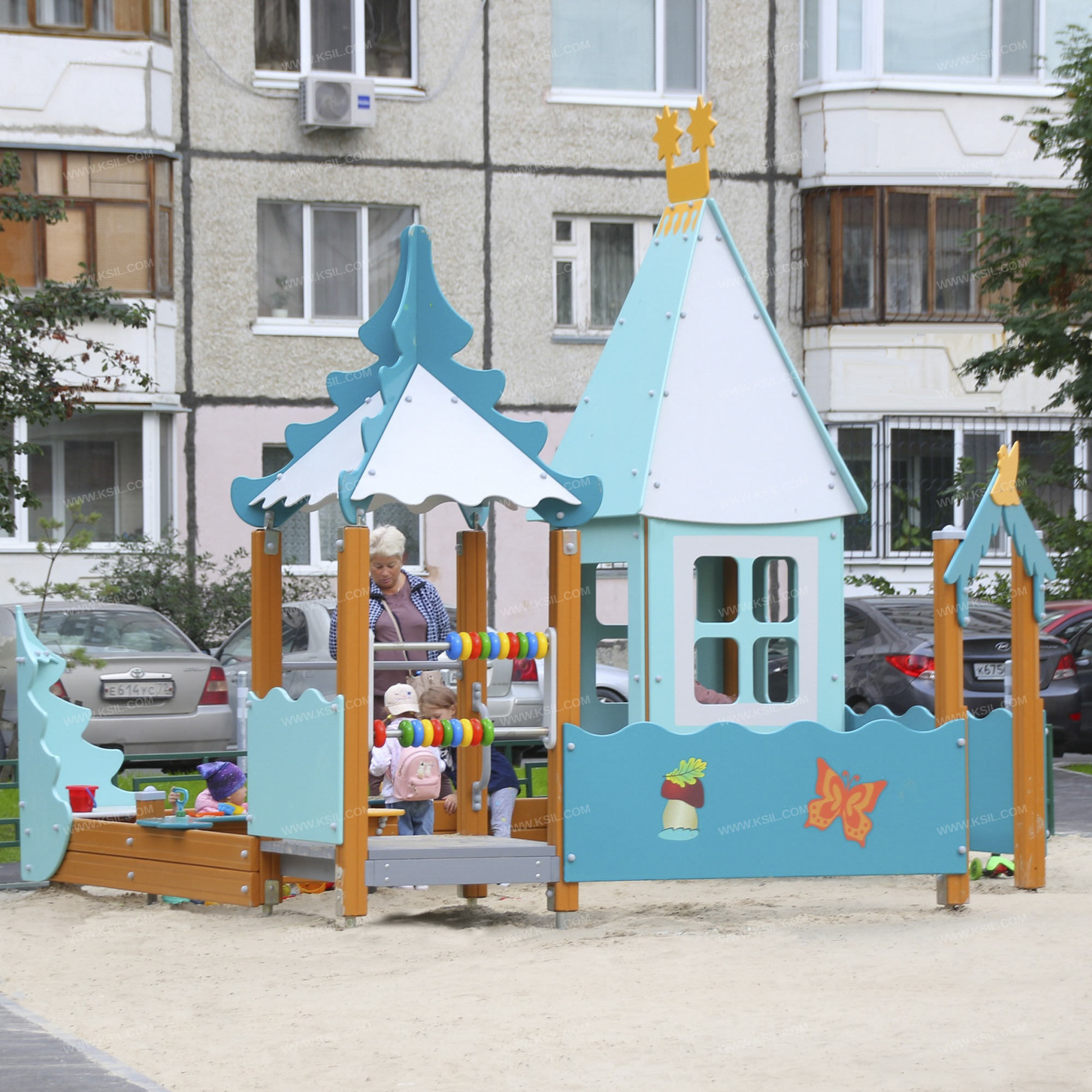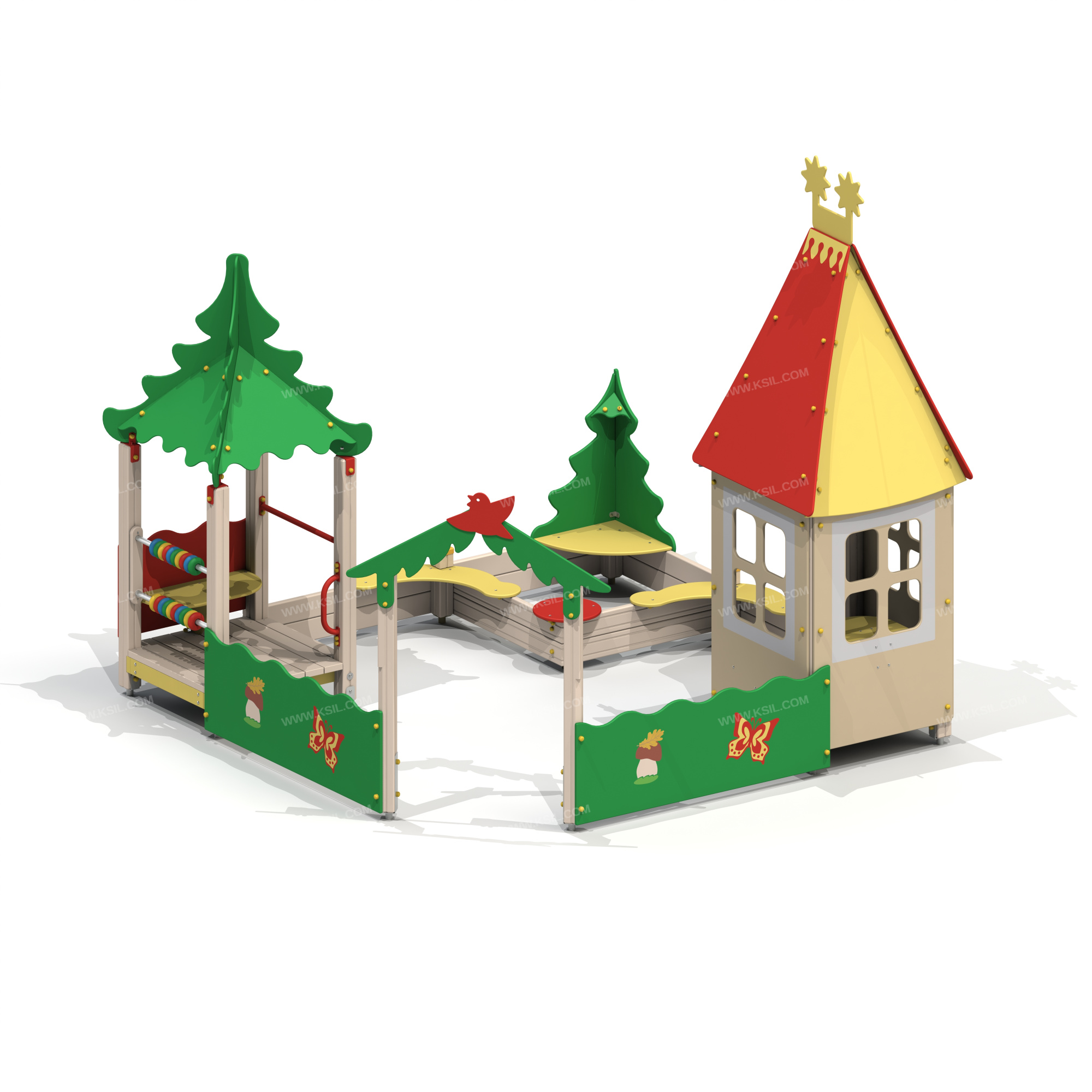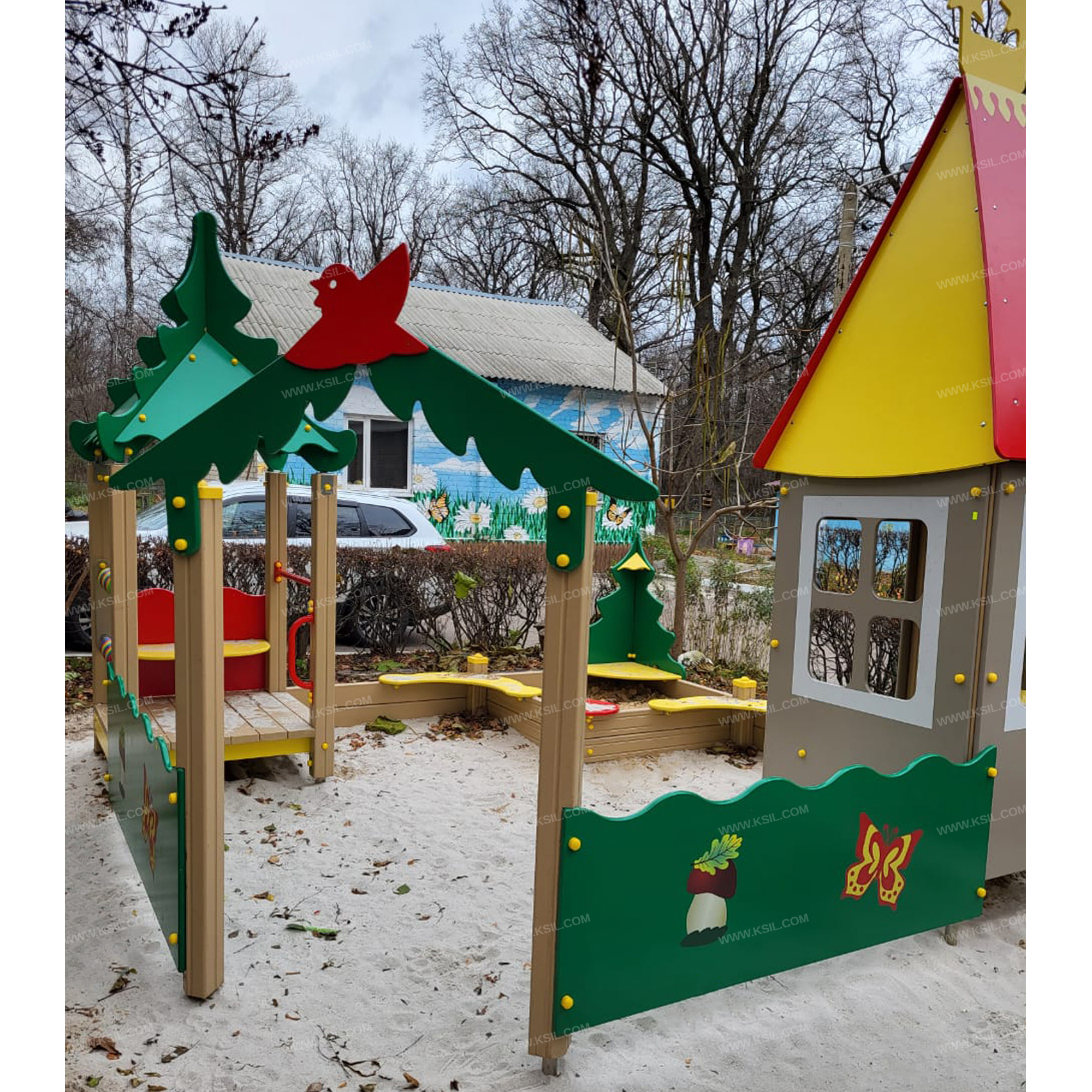 Песочный дворик должен представлять собой устойчивую, модульную конструкцию из игровых и развивающих элементов, обеспечивающие ребенку комфортные условия для игры на открытом воздухе в лесной тематике. Песочный дворик должен состоять из одной башни с крышей, одной башни - домика, входной арки, песочницы, ограждений по периметру и декоративных элементов.К башне 1 в виде домика с крышей, с высотой площадки не менее 300 мм должны быть пристроены: 3 боковые стенки с окошками в виде 4-х секций-прорезей, обрамленных накладными элементами, стол, 2 скамейки К башне 2 с крышей, с высотой площадки не менее 300 мм должны быть пристроены: счеты, фанерное ограждение, ограждение в виде перекладины, скамейка и поручень.Несущие столбы комплекса должны быть выполнены из клееного деревянного бруса сечением не менее 100х100 мм и иметь скругленный профиль с канавкой посередине. Сверху столб должен заканчиваться пластиковой заглушкой, снизу столб должен заканчиваться металлическим оцинкованным подпятником диаметром не менее 42 мм, который бетонируется в землю.Пол башен должен быть выполнен из деревянной доски толщиной не менее 40 мм.Ограждение 1 по периметру песочного дворика, ограждения башни 2, боковые стенки домика, скамейки, стол должны быть изготовлены из влагостойкой окрашенной фанеры толщиной не менее 21 мм. Декоративные элементы в лесной тематике, накладные элементы окошек должны быть выполнены из влагостойкой фанеры толщиной не менее 9 мм. Входная арка должна быть установлена на несущих столбах в виде двух веток ели, выполненных из влагостойкой окрашенной фанеры толщиной не менее 21 мм с птичкой из влагостойкой фанеры толщиной не менее 9 мм. Песочница должна состоять из бортов, выполненных из деревянной доски толщиной не менее 40 мм, декоративного фанерного ограждения в наружном углу в форме ели и угловых накладных элементов, выполненных из влагостойкой фанеры толщиной не менее 21 мм. Ограждение 2 по периметру песочного дворика должно быть выполнено из деревянной доски толщиной не менее 40 мм.Счеты должны состоять из двух металлических перекладин диаметром не менее 33 мм и пластиковых или деревянных «баранок».Ограждения в виде перекладин, перекладины и поручни должны быть выполнены из металлической трубы диаметром не менее 33 мм. Крыша башни 2 в виде ели, должна состоять из 4-х скатов, выполненных из влагостойкой фанеры толщиной не менее 9 мм и 4-х стропил из влагостойкой фанеры толщиной не менее 15 мм. Крыша башни 1 должна состоять из двух скатов, двух фронтонов из влагостойкой фанеры толщиной не менее 15 мм и декоративного элемента в виде звезд, скрепляющего скаты крыши.