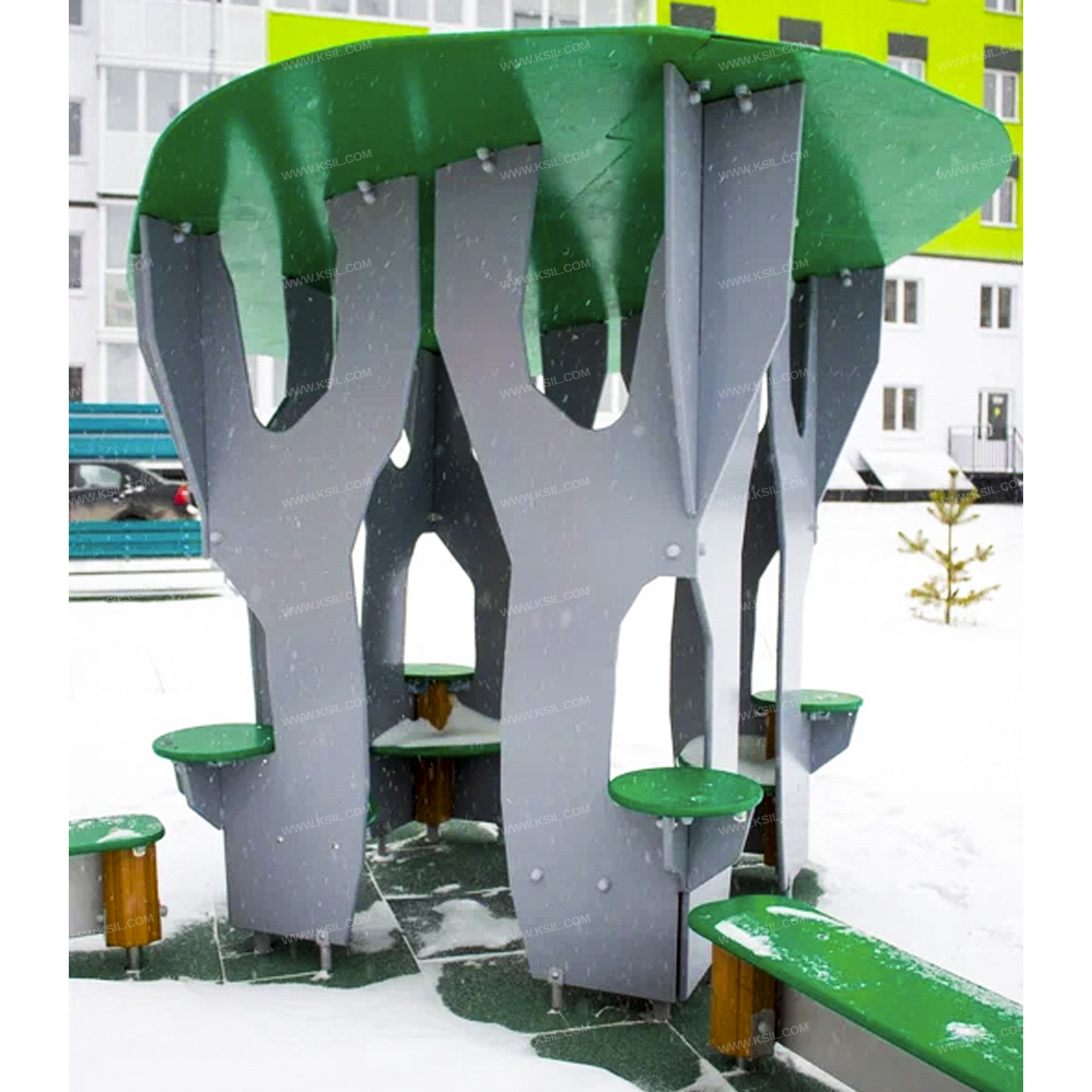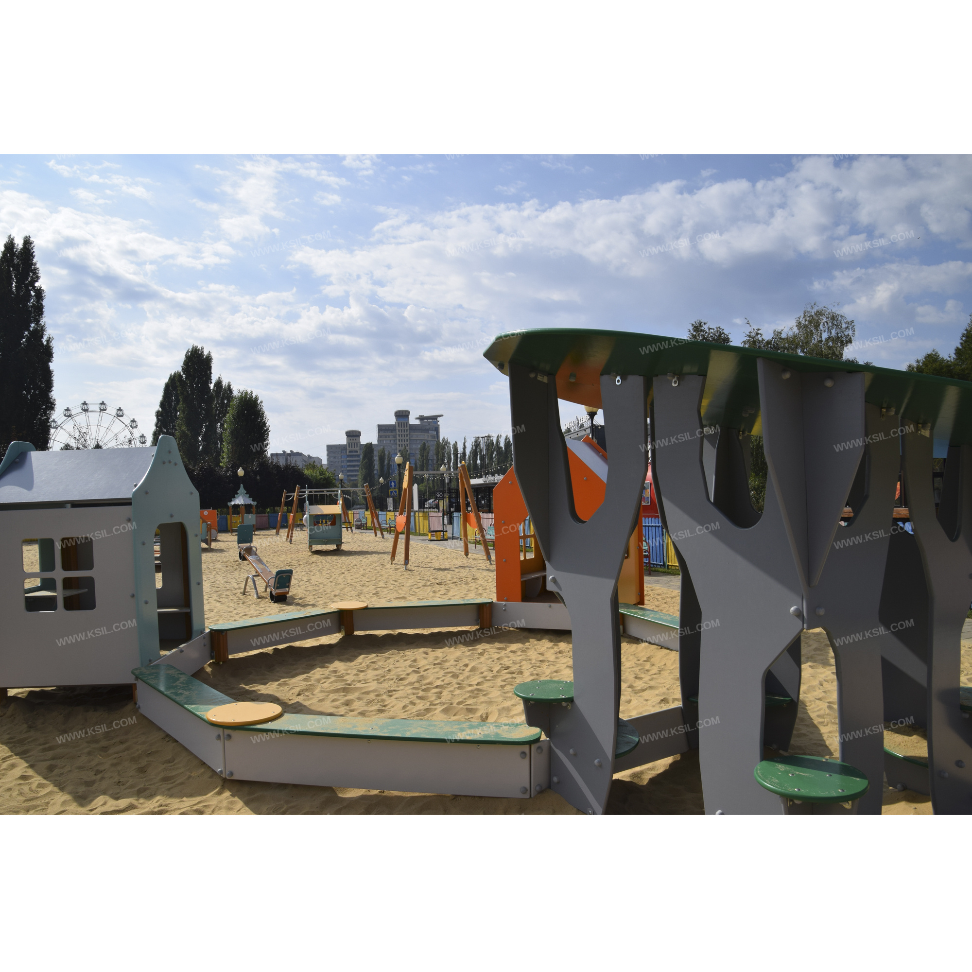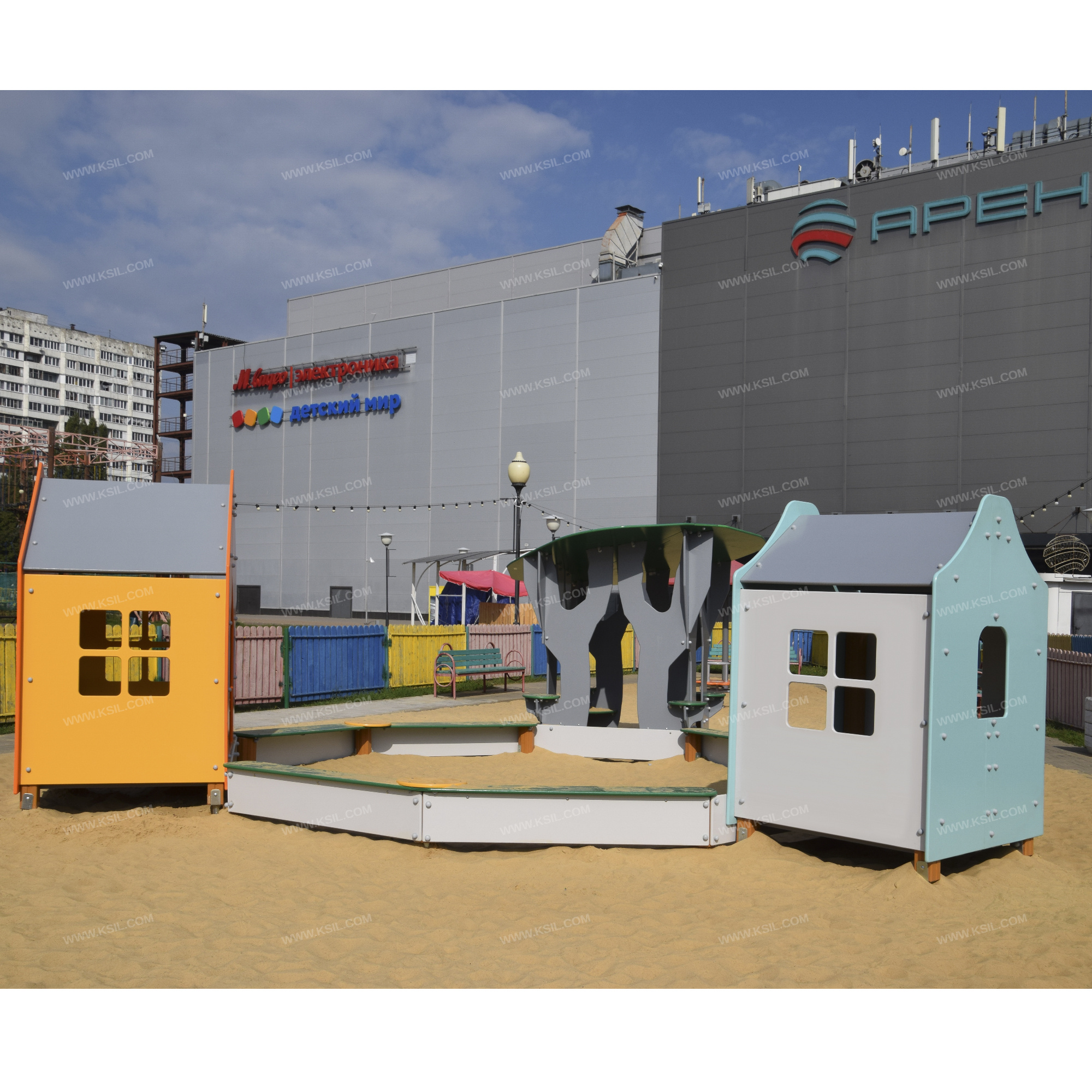 Песочный дворик должен представлять собой устойчивую, модульную конструкцию из игровых и развивающих элементов в том числе два домика и дерево, обеспечивающие ребенку комфортные условия для игры на открытом воздухе Песочный дворик должен состоять из двух домиков, песочницы состоять из 6-ти несущих стоек, 6-ти бортов, 6-ти накрывочных бортов и 3-х круглых сидений, выполненных из влагостойкой фанеры толщиной не менее 21 мм, конструкция имитирующая дерево в виде арки у основания которого 4-е круглых сиденья.Несущие стойки песочницы должны быть выполнены из клееного деревянного восьмигранного бруса сечением не менее 136х136 мм и иметь скругленный профиль с канавкой посередине. Снизу столб должен заканчиваться металлическим оцинкованным подпятником диаметром не менее 42 мм, который бетонируется в землю.Домики, с двускатной крышей, с высотой площадки не менее 300 мм, должны быть пристроены к песочнице. Отверстия в домиках в форме геометрических фигур должны служить входом и окошками домика.Несущие столбы домиков и дерева должны быть выполнены из клееного деревянного бруса сечением не менее 100х100 мм и иметь скругленный профиль с канавкой посередине. Снизу столб должен заканчиваться металлическим оцинкованным подпятником диаметром не менее 42 мм, который бетонируется в землю. Пол домиков, крона дерева и сиденья должны быть изготовлен из влагостойкой ламинированной нескользящей фанеры толщиной не менее 21 мм.