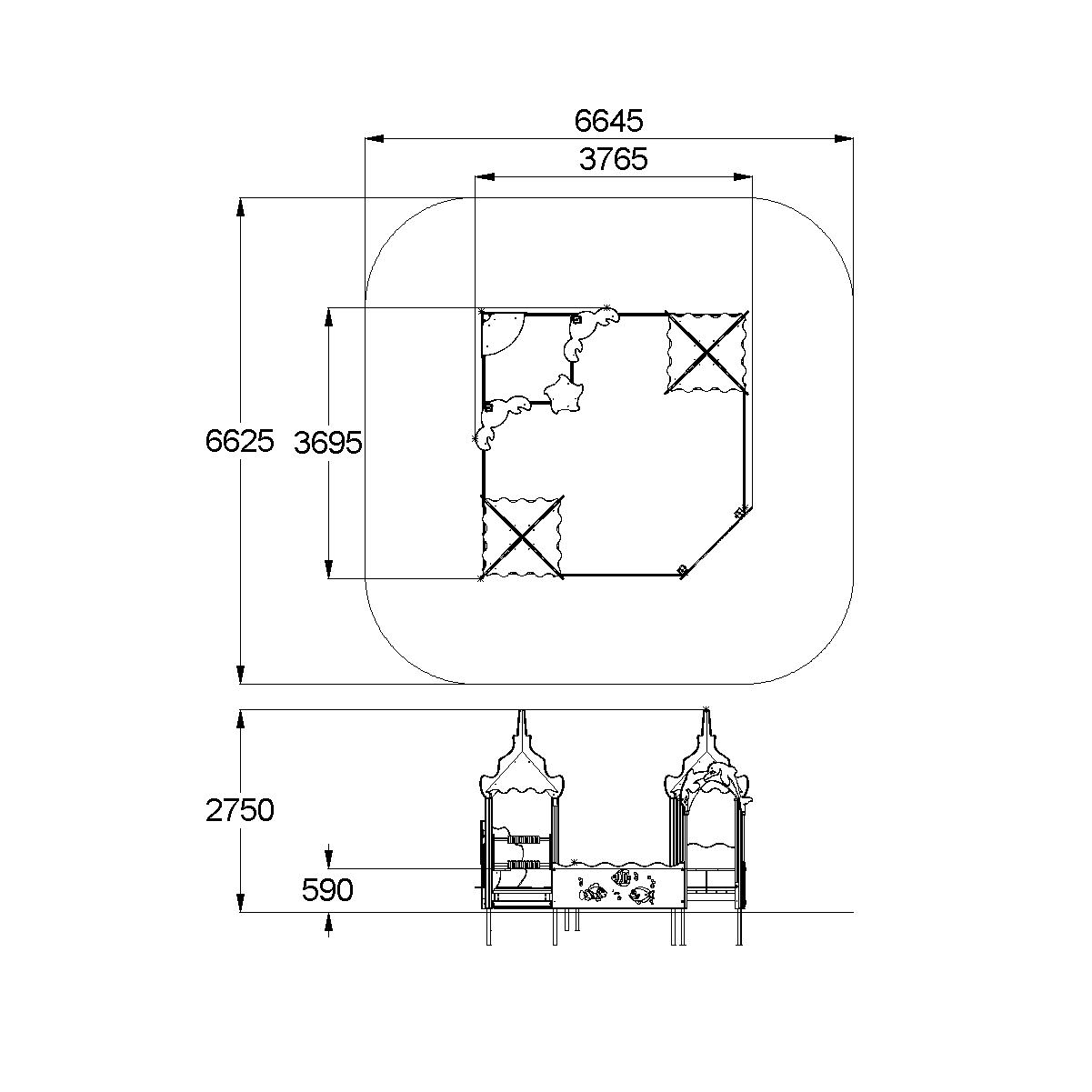 Песочный дворик должен состоять из 2-х башен с крышами, входной арки, песочницы, ограждением по периметру и декоративными элементами.