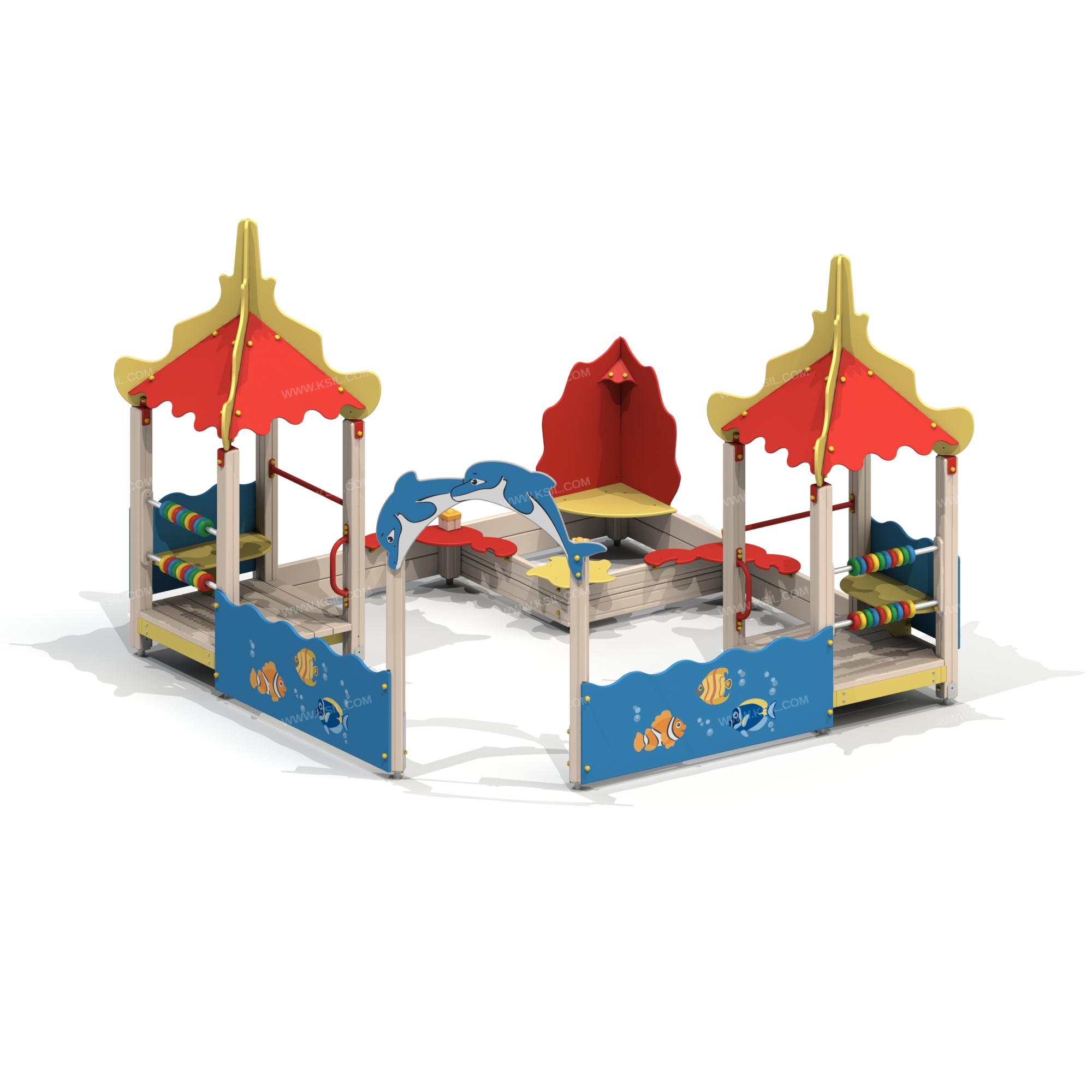 Песочный дворик должен представлять собой устойчивую, модульную конструкцию из игровых и развивающих элементов, обеспечивающие ребенку комфортные условия для игры на открытом воздухе в морской тематике. Песочный дворик должен состоять из 2-х башен с крышами, входной арки, песочницы, ограждением по периметру и декоративными элементами.К башне 1 и к башне 2 с крышей, с высотой площадки не менее 300 мм должны быть пристроены: счеты, ограждение фанерное с волнообразной верхней гранью, ограждение в виде перекладины, скамейка, поручень.Несущие столбы комплекса должны быть выполнены из клееного деревянного бруса сечением не менее 100х100 мм и иметь скругленный профиль с канавкой посередине. Сверху открытый столб должен заканчиваться пластиковой заглушкой, снизу столб должен заканчиваться металлическим оцинкованным подпятником диаметром не менее 42 мм, который бетонируется в землю.Пол башен должен быть выполнен из деревянной доски толщиной не менее 40 мм.Ограждение 1 по периметру песочного дворика, ограждения башни 1 и башни 2, скамейка, должны быть изготовлены из влагостойкой окрашенной фанеры толщиной не менее 21 мм. Входная арка должна быть установлена на несущих столбах в виде 2-х дельфинов и выполнена из влагостойкой окрашенной фанеры толщиной не менее 21 мм. Песочница должна состоять из бортов, выполненных из деревянной доски толщиной не менее 40 мм, декоративного фанерного ограждения в наружном углу в форме коралла и угловых накладных элементов, выполненных из влагостойкой фанеры толщиной не менее 21 мм. Ограждение 2 по периметру песочного дворика должно быть выполнено из деревянной доски толщиной не менее 40 мм.Счеты должны состоять из двух металлических перекладин диаметром не менее 33 мм и пластиковых или деревянных «баранок».Ограждение и поручни в виде перекладин должно быть выполнено из металлической трубы диаметром не менее 33 мм. Крыша башен должна состоять из 4-х скатов, выполненных из влагостойкой фанеры толщиной не менее 9 мм и 4-х стропил из влагостойкой фанеры толщиной не менее 15 мм. Декоративные элементы должны быть выполнены из влагостойкой фанеры толщиной не менее 9 мм.