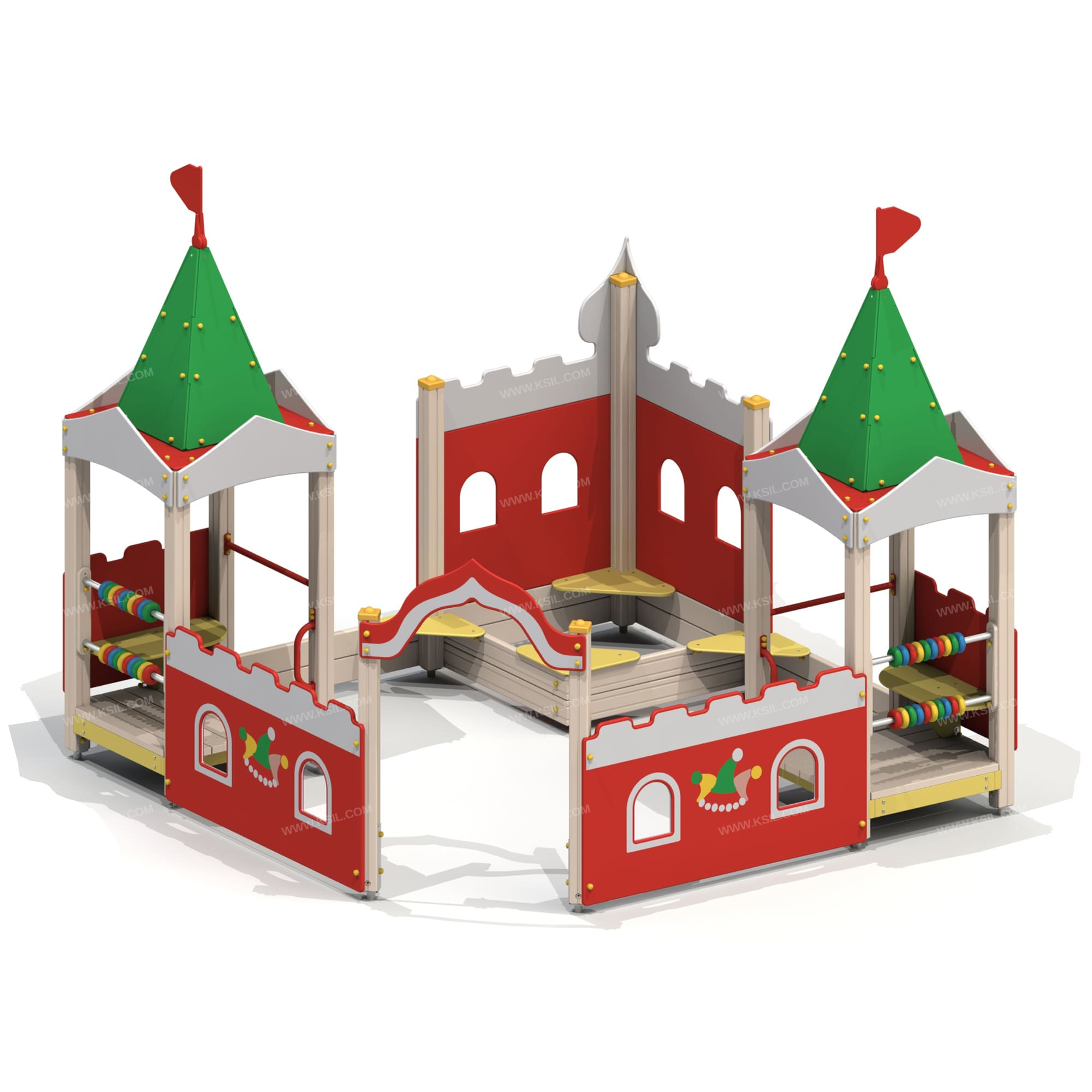 Песочный дворик, стилизованный под Кремль, должен представлять собой устойчивую, модульную конструкцию из игровых и развивающих элементов, обеспечивающие ребенку комфортные условия для игры на открытом воздухе. Песочный дворик должен состоять из 2-х башен с куполами, входной арки, песочницы, ограждением по периметру и декоративными элементами.К башне 1 и к башне 2, с высотой площадки не менее 300 мм, должны быть пристроены: счеты, ограждение фанерное, перекладина, скамейка, поручень.Несущие столбы комплекса должны быть выполнены из клееного деревянного бруса сечением не менее 100х100 мм и иметь скругленный профиль с канавкой посередине. Сверху столб должен заканчиваться пластиковой заглушкой, снизу столб должен заканчиваться металлическим оцинкованным подпятником диаметром не менее 42 мм, который бетонируется в землю.Пол башен должен быть выполнен из деревянной доски толщиной не менее 40 мм.Ограждение 1 по периметру песочного дворика с зубчатой верхней гранью и окошками, ограждения башни 1 и башни 2, скамейки, должны быть изготовлены из влагостойкой окрашенной фанеры толщиной не менее 21 мм. Входная фигурная арка должна быть установлена на несущих столбах и изготовлена из влагостойкой окрашенной фанеры толщиной не менее 21 мм.Песочница должна состоять из бортов, выполненных из деревянной доски толщиной не менее 40 мм, декоративного фанерного ограждения в наружном углу в виде крепости с окошками и угловых накладных элементов, выполненных из влагостойкой фанеры толщиной не менее 21 мм. Ограждение 2 по периметру песочного дворика должно быть выполнено из деревянной доски толщиной не менее 40 мм.Счеты должны состоять из двух металлических перекладин диаметром не менее 33 мм и пластиковых или деревянных «баранок».Перекладины и поручни должны быть выполнены из металлической трубы диаметром не менее 33 мм. Купол башен с декоративным флагом должен состоять из 4-х скатов, основания и 4-х обрамлений по периметру, выполненных из влагостойкой фанеры толщиной не менее 15 мм.