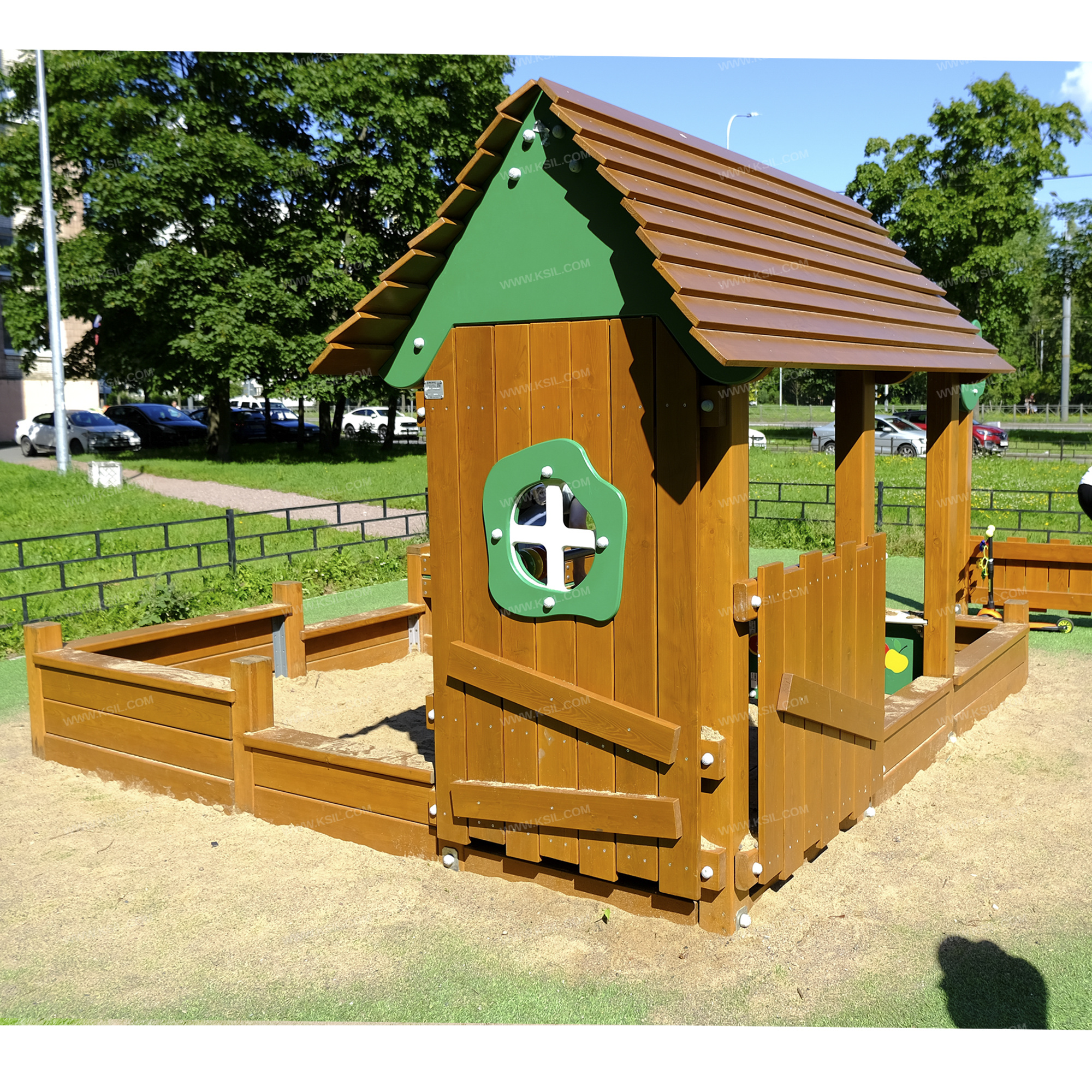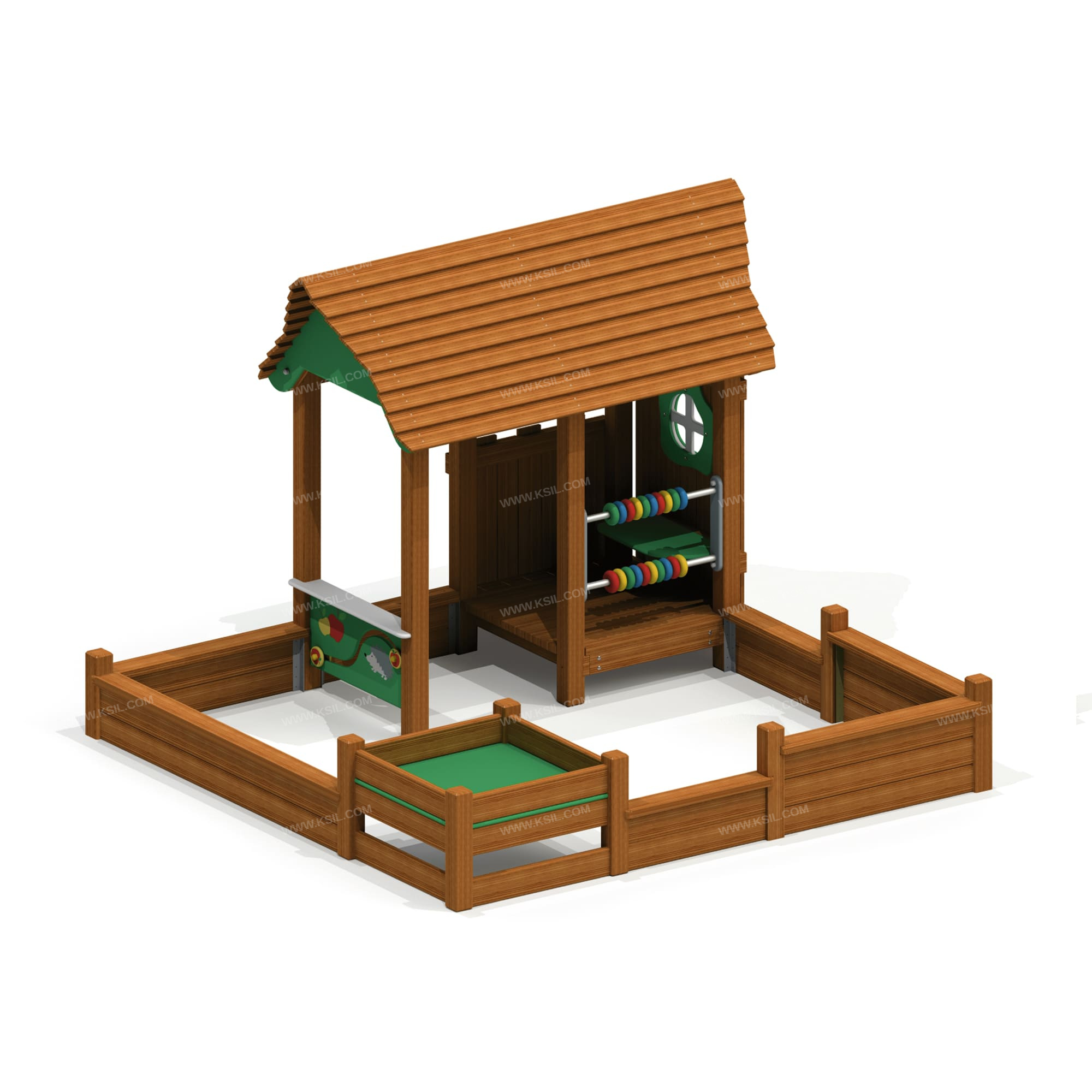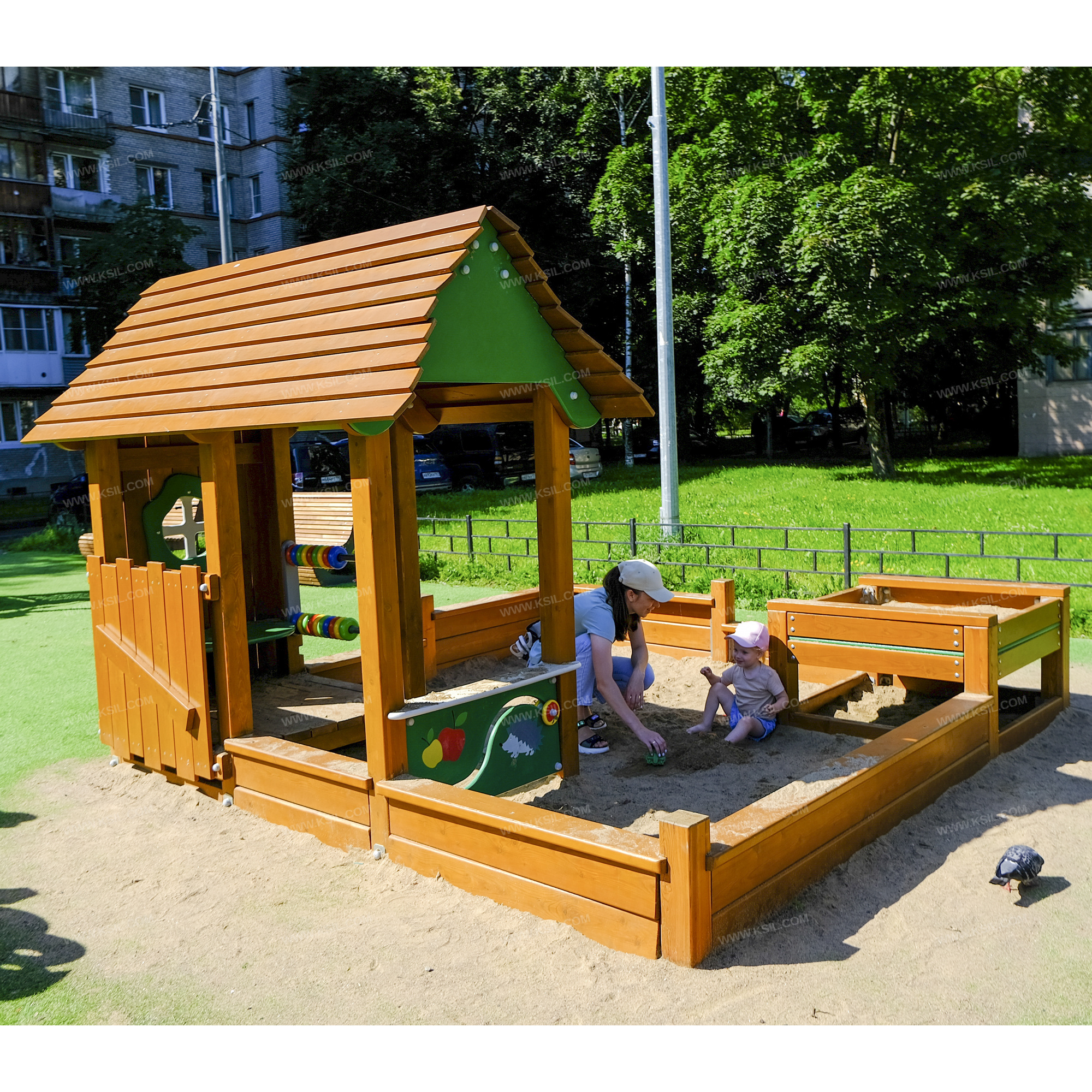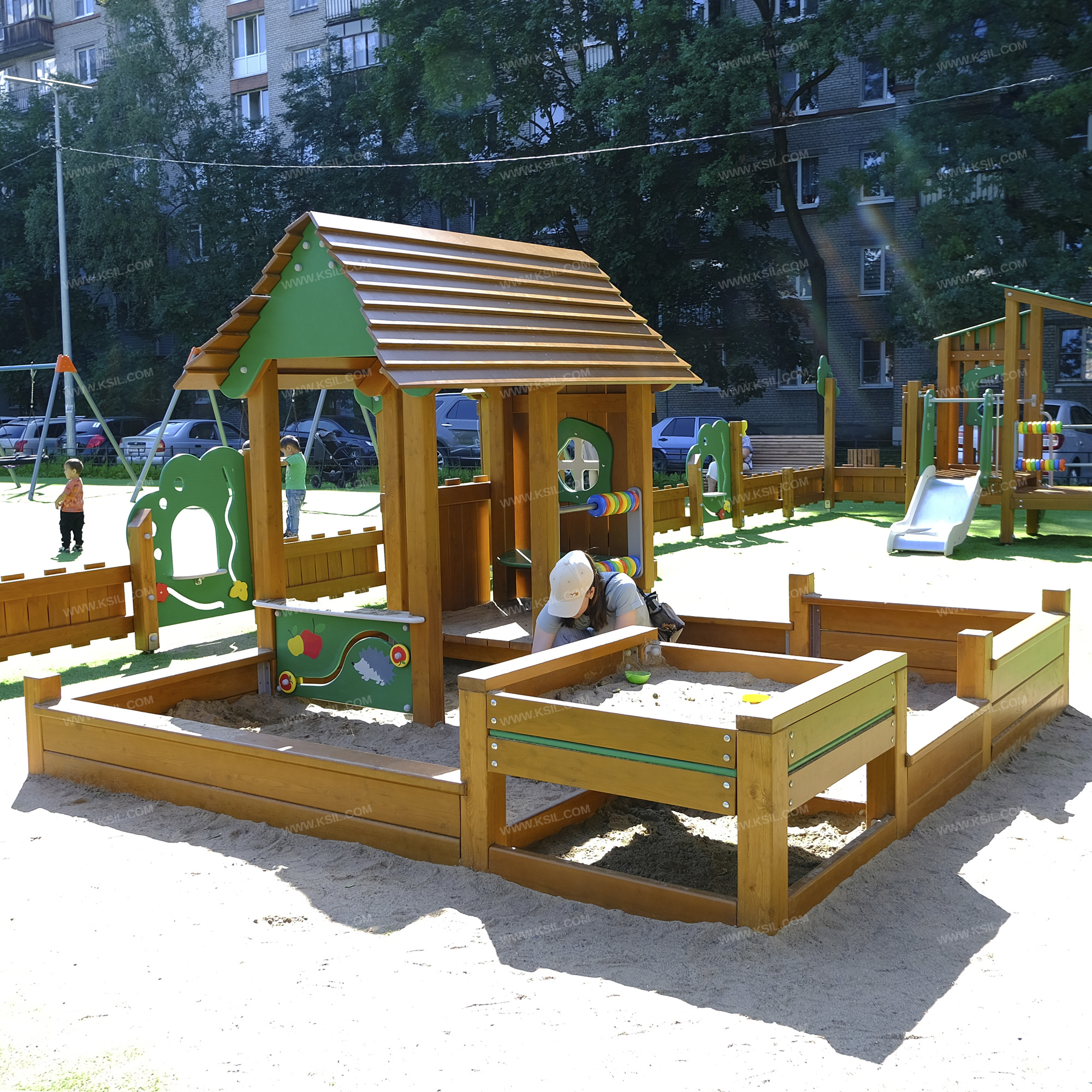Песочный дворик должен представлять собой устойчивую, модульную конструкцию из игровых и развивающих элементов, обеспечивающие ребенку комфортные условия для игры на открытом воздухе в природной тематике. Песочный дворик должен состоять из одной башни с крышей с ограждением по периметру песочницы и декоративными элементами, а также столика-песочницы.К башне с крышей, с высотой площадки не менее 280 мм должны быть пристроены: счеты, ограждение в виде наборного экрана с декоративным окном, глухое наборное ограждение, сиденье, игровая панель со столиком.Все столбы песочного дворика должны быть выполнены из клееного деревянного бруса лиственницы сечением не менее 100х100 мм и иметь скругленный профиль. Несущие столбы башни снизу крепятся на металлический оцинкованный подпятник с диаметром трубы не менее 42 мм, который бетонируется в землю. Столбы периметра песочницы крепятся на металлические уголки сечением не менее 40х40, которые устанавливаются в землю.Пол башни должен быть выполнен из деревянной доски лиственницы толщиной не менее 40 мм.Накрывочные и бортовые доски по периметру песочного дворика и ограждения столика-песочницы должны быть выполнены из деревянной доски лиственницы сечением не менее 40х140 мм. Ограждение наборное состоит из направляющих досок сечением 40*100мм, на которые крепятся вертикальные доски сечением 115х20 мм и 130х20 мм и наклонная доска сечением не менее 100х30 мм.Ограждение наборное с окном состоит из направляющих досок сечением 40*100мм, на которые крепятся вертикальные доски сечением 115х20 мм и 130х20 мм, окно из влагостойкой фанеры толщиной не менее 21 мм и наличники с двух сторон из влагостойкой фанеры толщиной не менее 15 мм.Крыша состоит из двух скатов, которые выполнены из деревянных досок лиственницы сечением не менее 115х20, деревянных стропил сечением не менее 140х40 и декоративных накладок, выполненных из влагостойкой фанеры толщиной не менее 21 мм. Стропила крыши соединяются между собой с помощью пластины, выполненной из листового металла толщиной не менее 4 мм.Игровая панель должна быть выполнена из влагостойкой фанеры толщиной не менее 21 мм с художественной росписью “Ежик” и “Яблоки”. По траектории в фанерной панели движутся втулки, выточенные из капролона, на которые с помощью болтового соединения крепятся декоративные элементы, выполненные из влагостойкой фанеры толщиной не менее 15 мм с декоративной росписью “Яблоко”. Сверху над игровой панелью устанавливается столик из влагостойкой фанеры толщиной не менее 21 мм.Счеты должны состоять из двух металлических перекладин диаметром не менее 33 мм, пластиковых «баранок» и накладок для крепления к башне, выполненных из влагостойкой фанеры толщиной не менее 21 мм.Сиденье и столик-песочница выполнены из влагостойкой фанеры толщиной не менее 21 мм.