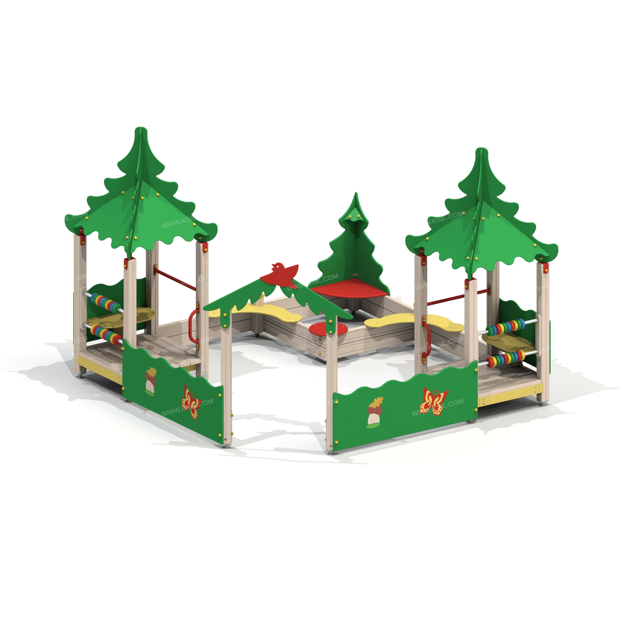 Песочный дворик должен представлять собой устойчивую, модульную конструкцию из игровых и развивающих элементов, обеспечивающие ребенку комфортные условия для игры на открытом воздухе в лесной тематике. Песочный дворик должен состоять из 2-х башен с крышами, входной арки, песочницы, ограждением по периметру и декоративными элементами.К башне 1 и к башне 2 с крышей, с высотой площадки не менее 300 мм, должны быть пристроены: счеты, ограждение фанерное с волнообразной верхней гранью, перекладина, скамейка, поручень. Несущие столбы комплекса должны быть выполнены из клееного деревянного бруса сечением не менее 100х100 мм и иметь скругленный профиль с канавкой посередине. Сверху столб должен заканчиваться пластиковой заглушкой, снизу столб должен заканчиваться металлическим оцинкованным подпятником диаметром не менее 42 мм, который бетонируется в землю.Пол башен должен быть выполнен из деревянной доски толщиной не менее 40 мм.Ограждение 1 по периметру песочного дворика с художественной росписью лесной тематикой, ограждения башни 1 и башни 2, скамейки, должны быть изготовлены из влагостойкой окрашенной фанеры толщиной не менее 21 мм. Входная арка должна быть установлена на несущих столбах в виде двух веток ели, выполненных из влагостойкой окрашенной фанеры толщиной не менее 21 мм с птичкой из влагостойкой фанеры толщиной не менее 9 мм. Песочница должна состоять из бортов, выполненных из деревянной доски толщиной не менее 40 мм, декоративного фанерного ограждения в наружном углу в форме ели и угловых накладных элементов, выполненных из влагостойкой фанеры толщиной не менее 21 мм. Ограждение 2 по периметру песочного дворика должно быть выполнено из деревянной доски толщиной не менее 40 мм с художественной росписью лесной тематикой.Счеты должны состоять из двух металлических перекладин диаметром не менее 33 мм и пластиковых или деревянных «баранок».Перекладины и поручни должны быть выполнены из металлической трубы диаметром не менее 33 мм. Крыша башен должна состоять из 4-х скатов, выполненных из влагостойкой фанеры толщиной не менее 9 мм и 4-х фронтонов из влагостойкой фанеры толщиной не менее 15 мм.