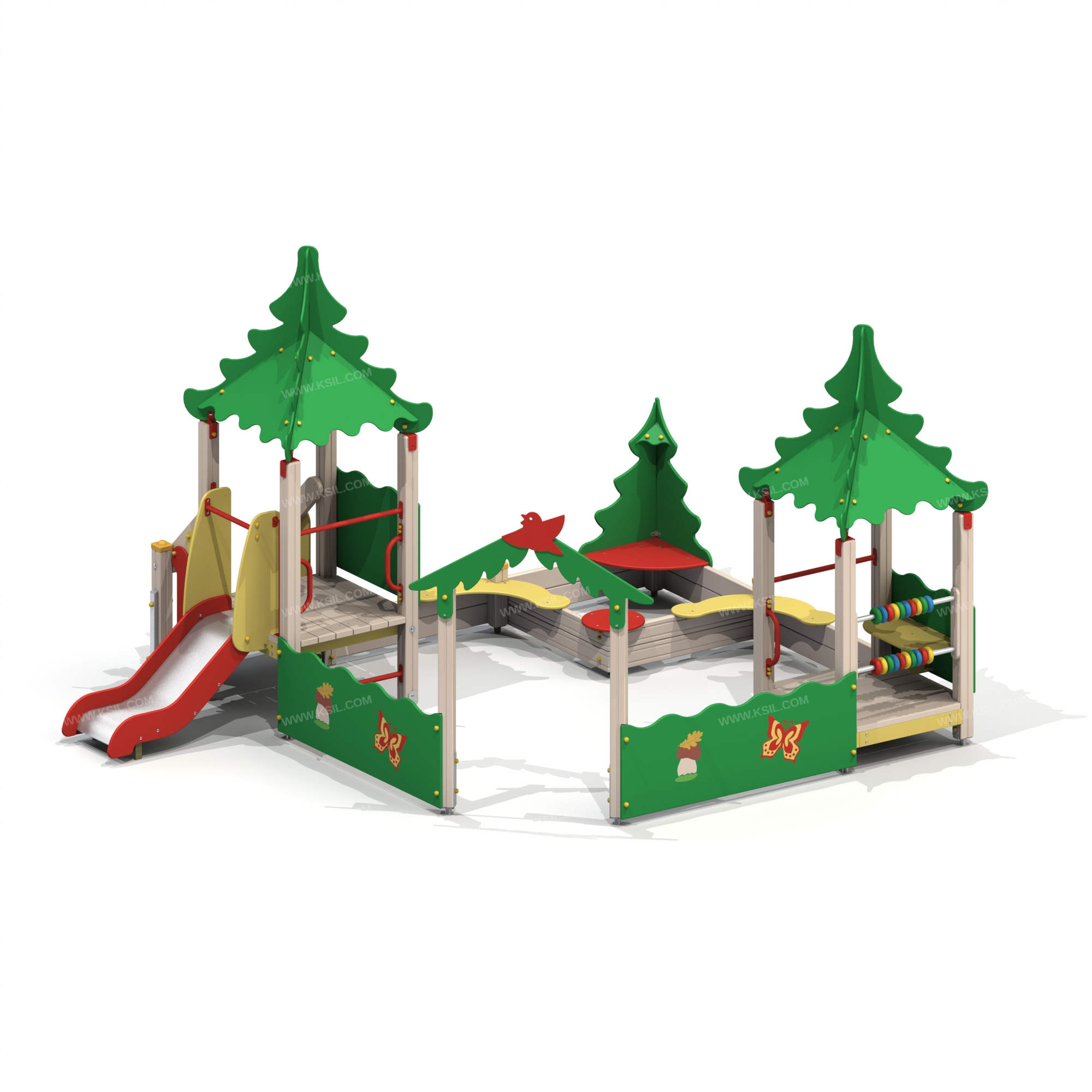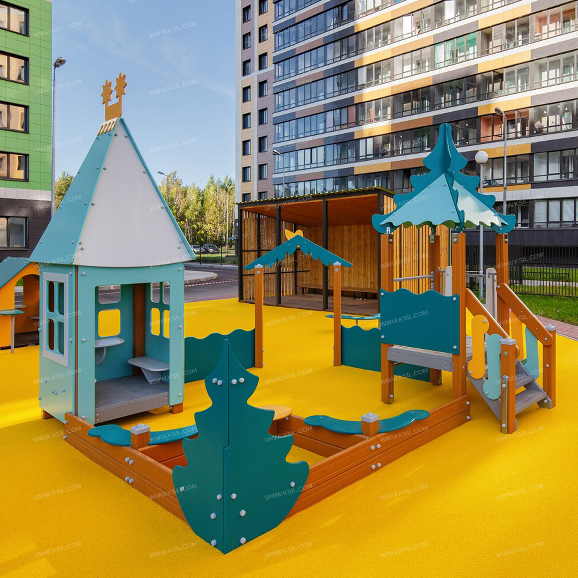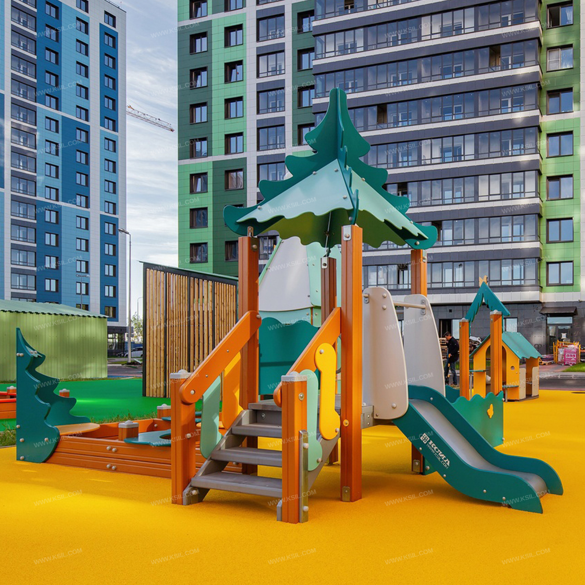 Песочный дворик должен представлять собой устойчивую, модульную конструкцию из игровых и развивающих элементов, обеспечивающие ребенку комфортные условия для игры на открытом воздухе в лесной тематике. Песочный дворик должен состоять из 2-х башен с крышами, входной арки, песочницы, ограждением по периметру и декоративными элементами.К башне 1 с крышей, с высотой площадки не менее 650 мм должны быть пристроены: лестница, горка, ограждение фанерное, ограждение в виде перекладины и перекладина, установленная под площадкой башни, поручни.К башне 2 с крышей, с высотой площадки не менее 300 мм должны быть пристроены: счеты, фанерное ограждение, ограждение в виде перекладины, скамейка, поручень.Несущие столбы комплекса должны быть выполнены из клееного деревянного бруса сечением не менее 100х100 мм и иметь скругленный профиль с канавкой посередине. Сверху столб должен заканчиваться пластиковой заглушкой, снизу столб должен заканчиваться металлическим оцинкованным подпятником диаметром не менее 42 мм, который бетонируется в землю.Пол башен должен быть выполнен из деревянной доски толщиной не менее 40 мм.Лестница высотой не менее 650 мм должна быть оснащена перилами, выполненными из деревянной доски толщиной не менее 40 мм с декоративными накладными элементами из влагостойкой фанеры толщиной 15 мм. Перила должны быть установлены от первой ступени. Ступени лестниц должны быть выполнены из ламинированной противоскользящей влагостойкой фанеры толщиной не менее 15 мм и деревянной доски толщиной 40 мм, склеенных между собой. Расстояние между ступенями должно быть одинаковым. Горка должна состоять из ската, бортиков, защитной секции и защитной перекладины. Горка должна иметь стартовый участок высотой не менее 650 мм, участок скольжения и конечный участок. Скат должен быть изготовлен из единого листа нержавеющей стали толщиной 1,5 мм, утопленный в паз бортиков горки. Бортики горки, выполненные из влагостойкой фанеры толщиной не менее 21 мм должны быть высотой не менее 100 мм. Защитная перекладина должна быть выполнена из металлической трубы диаметром не менее 33 мм, побуждающая ребенка присесть и установлена на высоте не менее 600 мм от уровня поверхности стартового участка горки. Защитная секция горки должна быть выполнена из влагостойкой фанеры толщиной не менее 21 мм. Ограждение 1 по периметру песочного дворика, ограждения башни 1 и башни 2, скамейка, должны быть изготовлены из влагостойкой окрашенной фанеры толщиной не менее 21 мм. Декоративные элементы с лесной тематикой должны быть выполнены из влагостойкой фанеры толщиной не менее 9 мм. Входная арка должна быть установлена на несущих столбах в виде двух веток ели выполненных из влагостойкой окрашенной фанеры толщиной не менее 21 мм с птичкой из влагостойкой фанеры толщиной не менее 9 мм. Песочница должна состоять из бортов, выполненных из деревянной доски толщиной не менее 40 мм, декоративного фанерного ограждения в наружном углу в форме ели и угловых накладных элементов, выполненных из влагостойкой фанеры толщиной не менее 21 мм. Ограждение 2 по периметру песочного дворика должно быть выполнено из деревянной доски толщиной не менее 40 мм.Счеты должны состоять из двух металлических перекладин диаметром не менее 33 мм и пластиковых или деревянных «баранок».Ограждения в виде перекладин, переклади