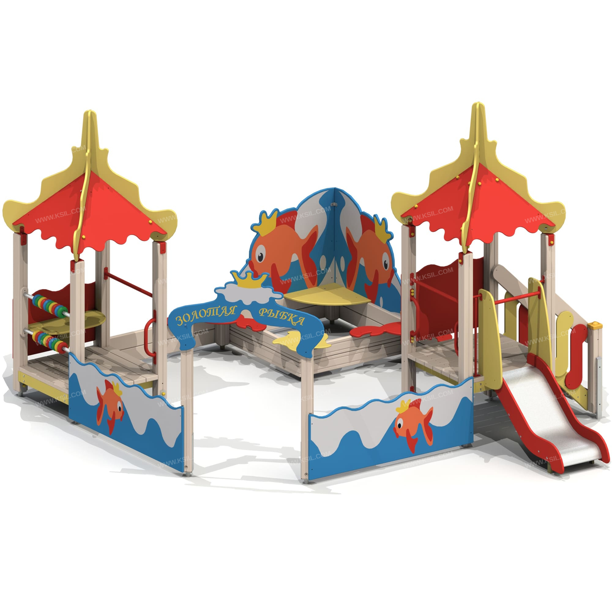 Песочный дворик должен представлять собой устойчивую, модульную конструкцию из игровых и развивающих элементов, обеспечивающие ребенку комфортные условия для игры с песком на открытом воздухе в сказочной тематике золотой рыбки. Песочный дворик должен состоять из 2-х башен с крышами, входной арки, песочницы, ограждений по периметру и декоративных элементов.К башне 1, с крышей, с высотой площадки не менее 650 мм, должны быть пристроены: лестница, горка, ограждение фанерное, перекладины, поручни.К башне 2 с крышей, с высотой площадки не менее 300 мм должны быть пристроены: счеты, фанерное ограждение, перекладина, поручень, скамейка.Несущие столбы комплекса должны быть выполнены из клееного деревянного бруса сечением не менее 100х100 мм и иметь скругленный профиль с канавкой посередине. Сверху столб должен заканчиваться пластиковой заглушкой, снизу столб должен заканчиваться металлическим оцинкованным подпятником диаметром не менее 42 мм, который бетонируется в землю.Пол башен должен быть выполнен из деревянной доски толщиной не менее 40 мм.Горка должна состоять из ската, бортиков, защитной секции и защитной перекладины. Горка должна иметь стартовый участок высотой не менее 650 мм, участок скольжения и конечный участок. Скат должен быть изготовлен из единого листа нержавеющей стали толщиной 1,5 мм, утопленный в паз бортиков горки. Бортики горки, выполненные из влагостойкой фанеры толщиной не менее 21 мм должны быть высотой не менее 100 мм. Защитная перекладина должна быть выполнена из металлической трубы диаметром не менее 33 мм, побуждающая ребенка присесть и установлена на высоте не менее 600 мм от уровня поверхности стартового участка горки. Защитная секция горки должна быть выполнена из влагостойкой фанеры толщиной не менее 21 мм. Лестница высотой не менее 650 мм должна быть оснащена перилами, выполненными из деревянной доски толщиной не менее 40 мм с декоративными накладными элементами из влагостойкой фанеры толщиной 15 мм. Перила должны быть установлены от первой ступени. Ступени лестниц должны быть выполнены из ламинированной противоскользящей влагостойкой фанеры толщиной не менее 15 мм и деревянной доски толщиной 40 мм, склеенных между собой. Расстояние между ступенями должно быть одинаковым. Ограждение 1 по периметру песочного дворика с художественной росписью рыбки в море, ограждения башни 1 и башни 2, скамейка, должны быть изготовлены из влагостойкой окрашенной фанеры толщиной не менее 21 мм. Входная арка должна быть установлена на несущих столбах с надписью, «Золотая рыбка» и выполнена из влагостойкой окрашенной фанеры толщиной не менее 21мм. Песочница должна состоять из бортов, выполненных из деревянной доски толщиной не менее 40 мм, декоративного фанерного ограждения в наружном углу в виде золотых рыбок и угловых накладных элементов, выполненных из влагостойкой фанеры толщиной не менее 21 мм. Ограждение 2 по периметру песочного дворика должно быть выполнено из деревянной доски толщиной не менее 40 мм.Счеты должны состоять из двух металлических перекладин диаметром не менее 33 мм и пластиковых или деревянных «баранок».Перекладины и поручни должны быть выполнены из металлической трубы диаметром не менее 33 мм. Крыша башен должна состоять из 2-х скатов, выполненных из влагостойкой фанеры толщиной не менее 9 мм и 2-х фронтонов из влаг