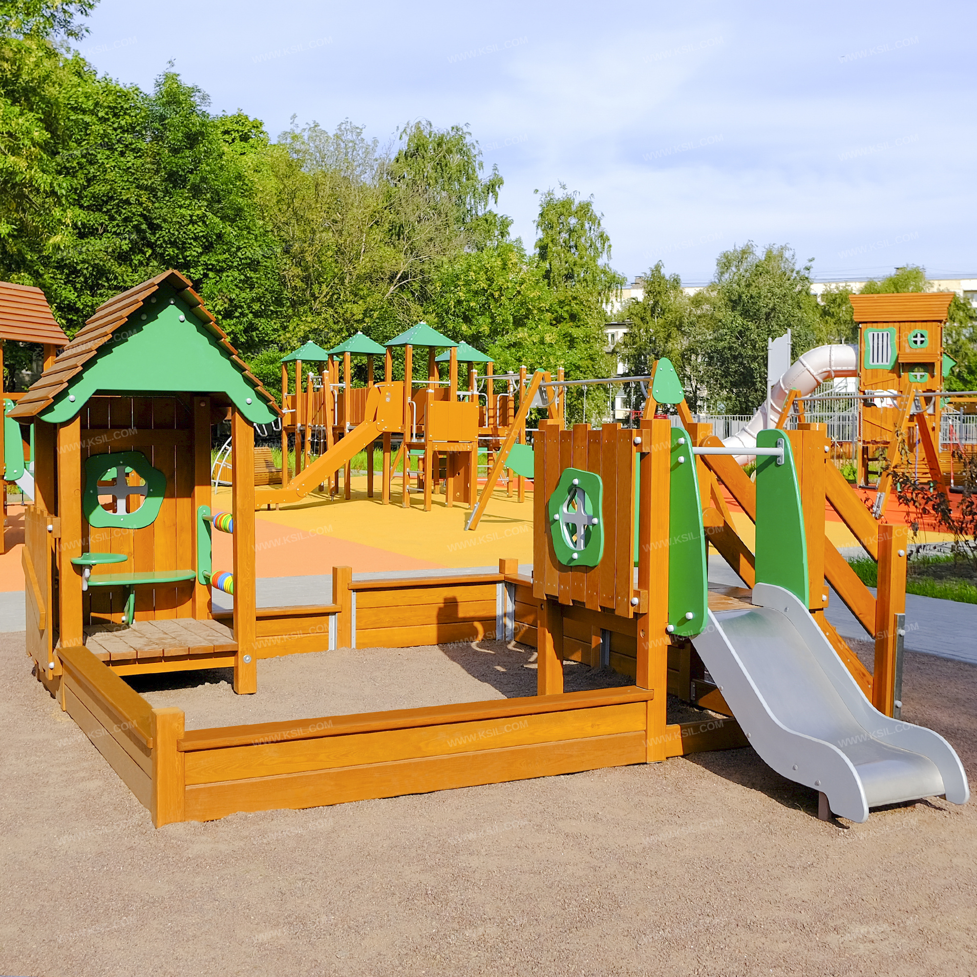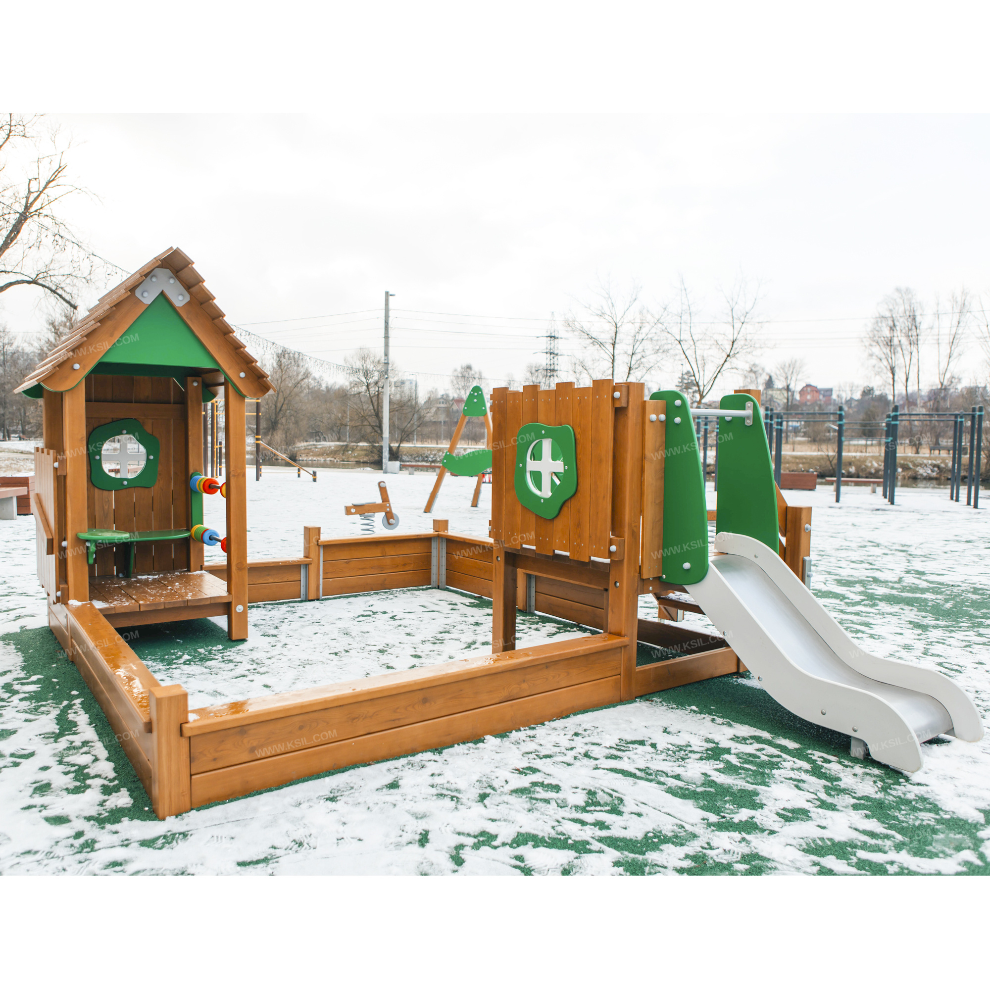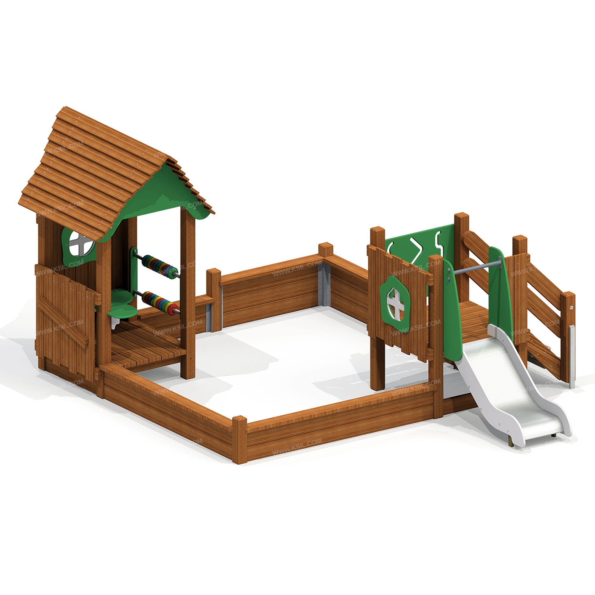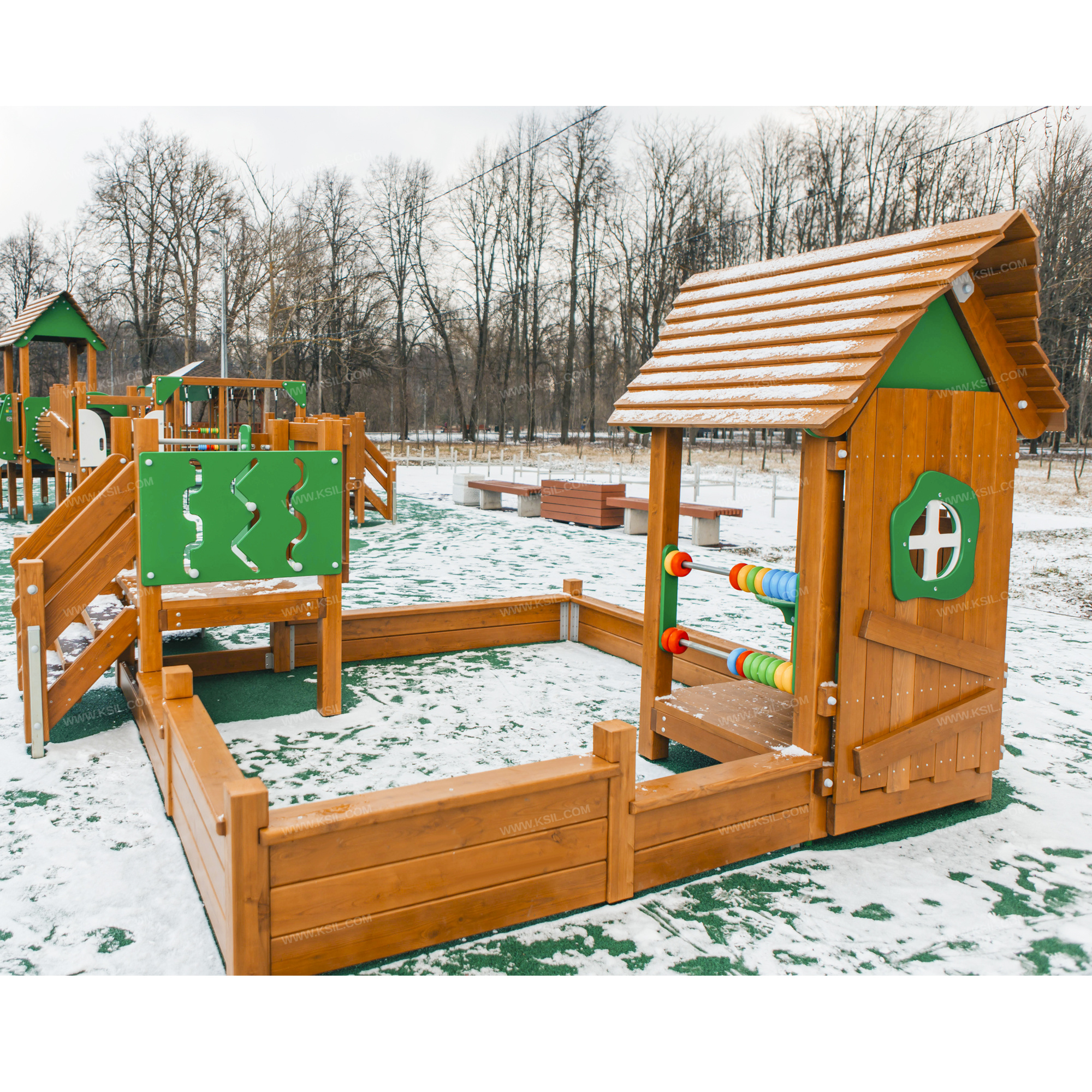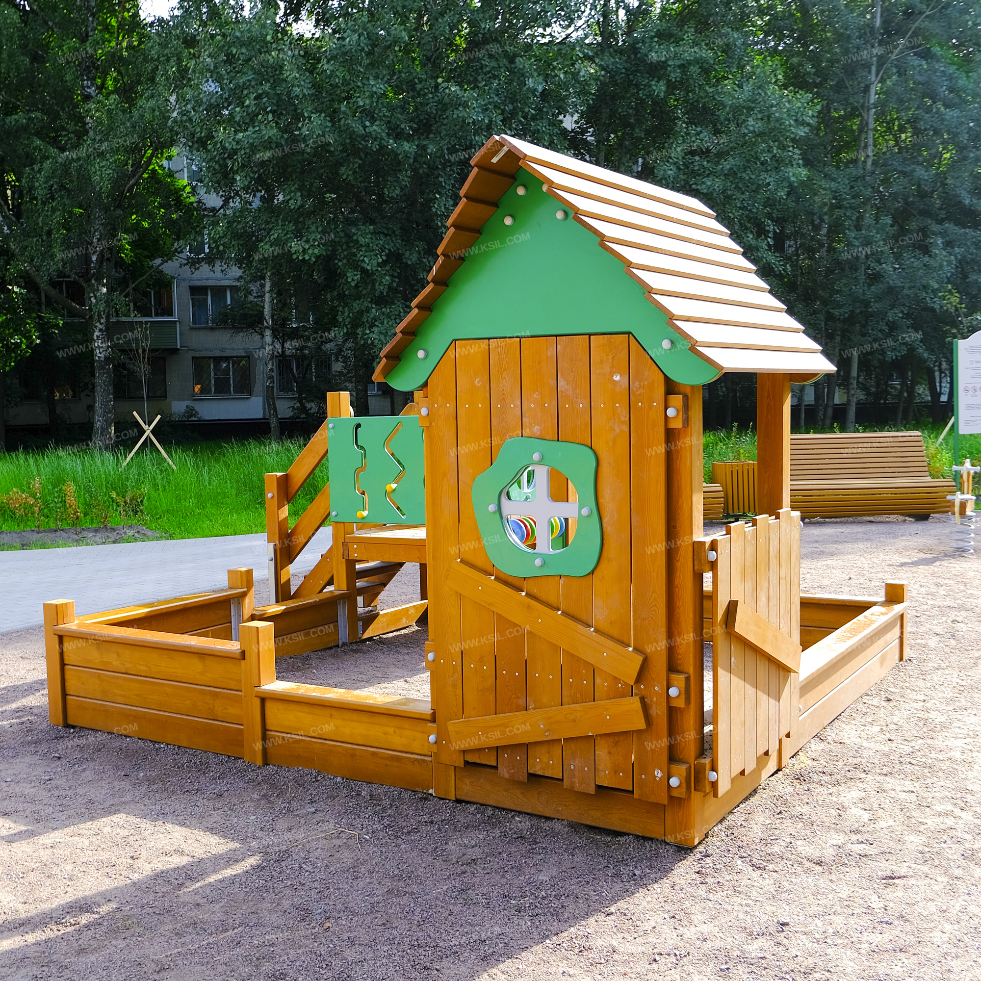 Песочный дворик должен представлять собой устойчивую, модульную конструкцию из игровых и развивающих элементов, обеспечивающие ребенку комфортные условия для игры на открытом воздухе в природной тематике. Песочный дворик должен состоять из 2-х башен, одна из которых с крышей, ограждением по периметру песочницы и декоративными элементами.К башне 1, с высотой площадки не менее 650 мм, должны быть пристроены: лестница, горка, ограждение в виде наборного экрана с декоративным окном, ограждение в виде игровой панели.К башне 2 с крышей, с высотой площадки не менее 280 мм должны быть пристроены: счеты, ограждение в виде наборного экрана с декоративным окном, глухое наборное ограждение, скамейка, столик.Все столбы песочного дворика должны быть выполнены из клееного деревянного бруса лиственницы сечением не менее 100х100 мм и иметь скругленный профиль. Несущие столбы обеих башен снизу крепятся на металлический оцинкованный подпятник с диаметром трубы не менее 42 мм, который бетонируется в землю. Столбы периметра песочницы крепятся на металлические уголки сечением не менее 40х40, которые устанавливаются в землю.Пол башен должен быть выполнен из деревянной доски лиственницы толщиной не менее 40 мм.Лестница высотой не менее 650 мм должна быть оснащена перилами, выполненными из деревянной доски лиственницы толщиной не менее 40 мм. Перила должны быть установлены от первой ступени. Ступени лестниц должны быть выполнены из ламинированной противоскользящей влагостойкой фанеры толщиной не менее 15 мм и деревянной доски толщиной 40 мм, склеенных между собой. Расстояние между ступенями должно быть одинаковым. Столбы лестницы крепятся на металлический подпятник из профильной трубы сечением 50х25, который бетонируется в землю. Горка должна состоять из ската, бортиков, защитной секции и защитной перекладины. Горка должна иметь стартовый участок высотой не менее 650 мм, участок скольжения и конечный участок. Скат должен быть изготовлен из единого листа нержавеющей стали толщиной 1,5 мм, утопленный в паз бортиков горки. Бортики горки, выполненные из влагостойкой фанеры толщиной не менее 21 мм должны быть высотой не менее 100 мм. Защитная перекладина должна быть выполнена из металлической трубы диаметром не менее 33 мм, побуждающая ребенка присесть и установлена на высоте не менее 600 мм от уровня поверхности стартового участка горки. Защитная секция горки должна быть выполнена из влагостойкой фанеры толщиной не менее 21 мм. Накрывочные и бортовые доски по периметру песочного дворика должны быть выполнены из деревянной доски лиственницы сечением не менее 40х140 мм. Ограждение наборное состоит из направляющих досок сечением 40*100мм, на которые крепятся вертикальные доски сечением 115х20 мм и 130х20 мм и наклонная доска сечением не менее 100х30 мм.Ограждение наборное с окном состоит из направляющих досок сечением 40*100мм, на которые крепятся вертикальные доски сечением 115х20 мм и 130х20 мм, окно из влагостойкой фанеры толщиной не менее 21 мм и наличники с двух сторон из влагостойкой фанеры толщиной не менее 15 мм.Крыша состоит из двух скатов, которые выполнены из деревянных досок лиственницы сечением не менее 115х20, деревянных стропил сечением не менее 140х40 и декоративных накладок, выполненных из влагостойкой фанеры толщиной не менее 21 мм. Стропила крыши соединяются между собой с 