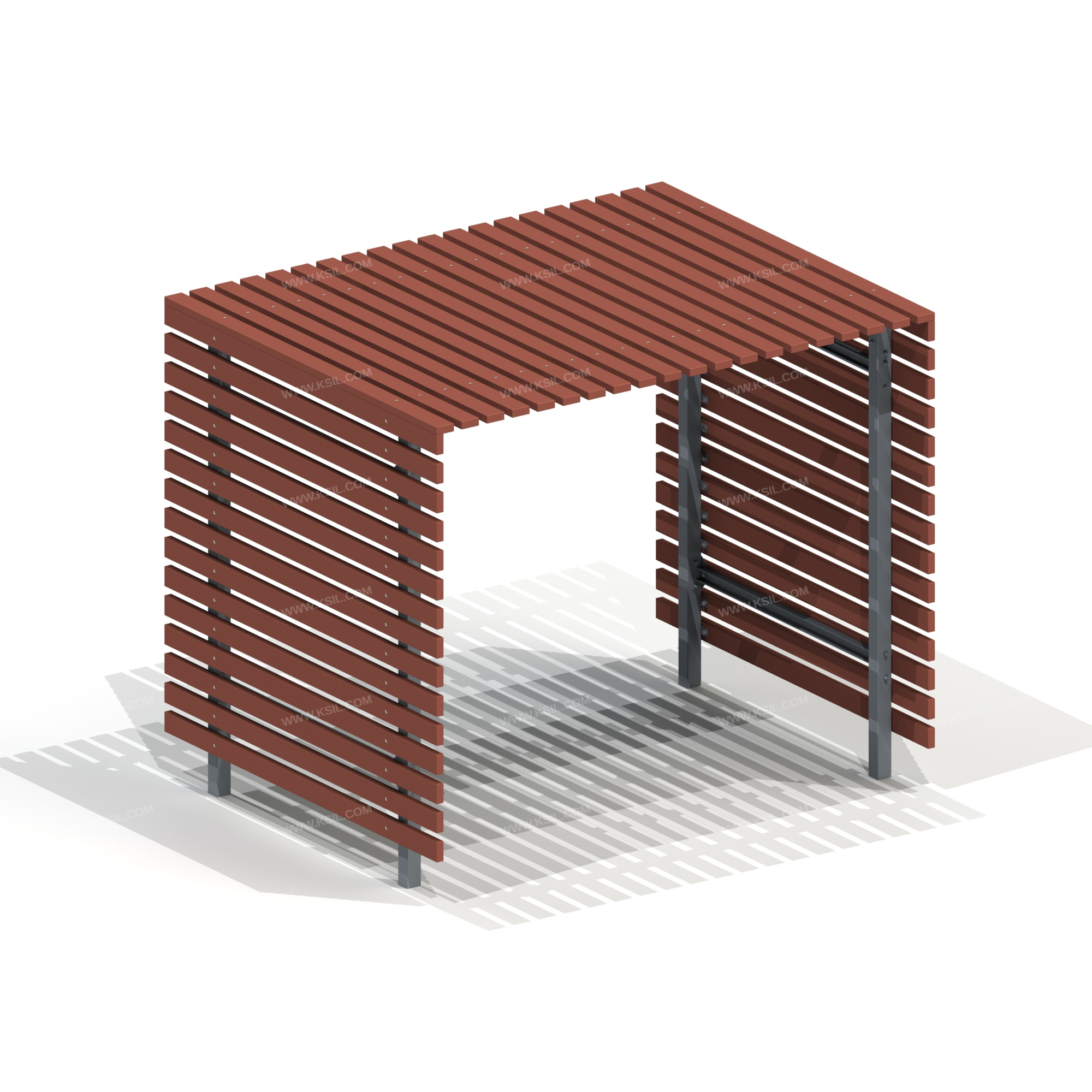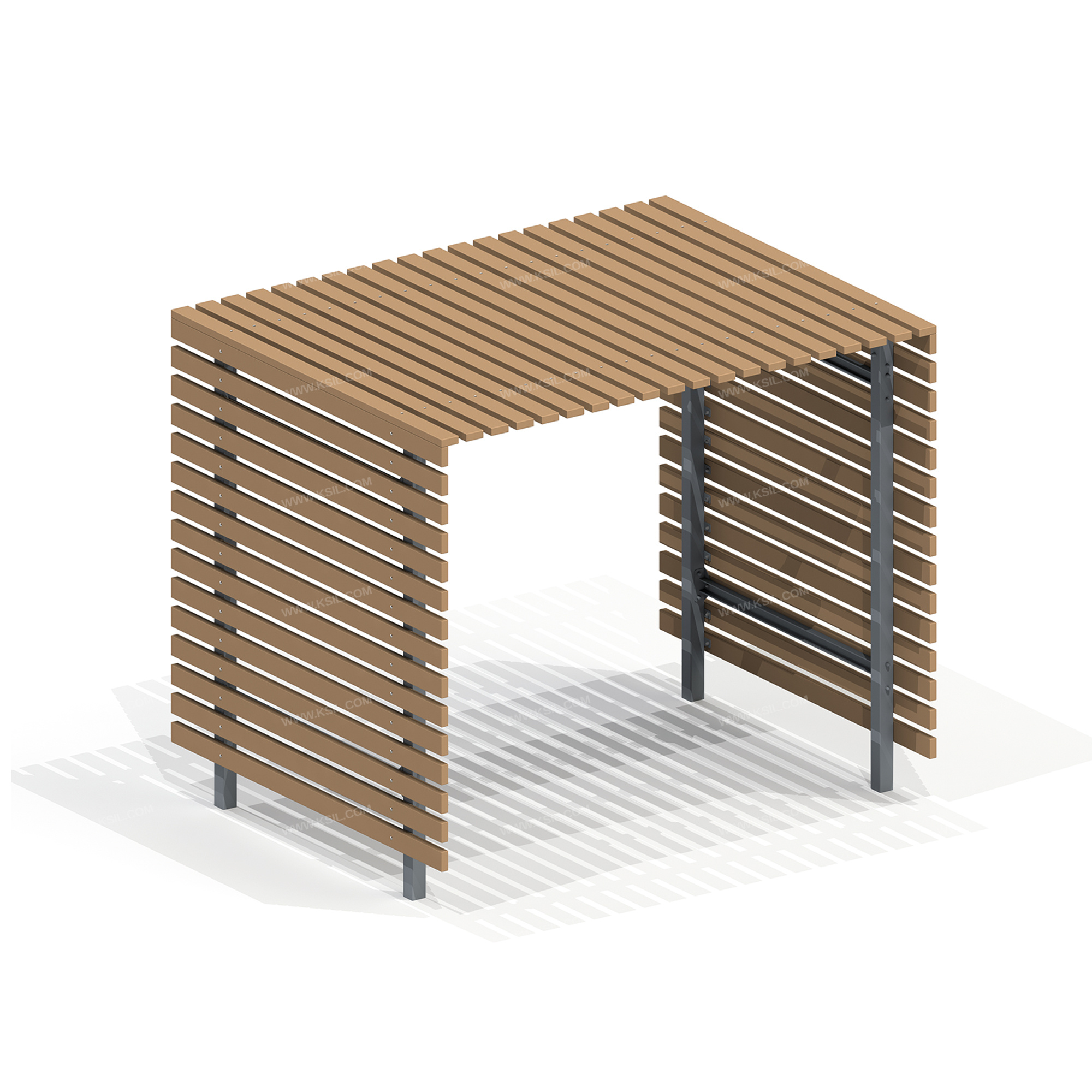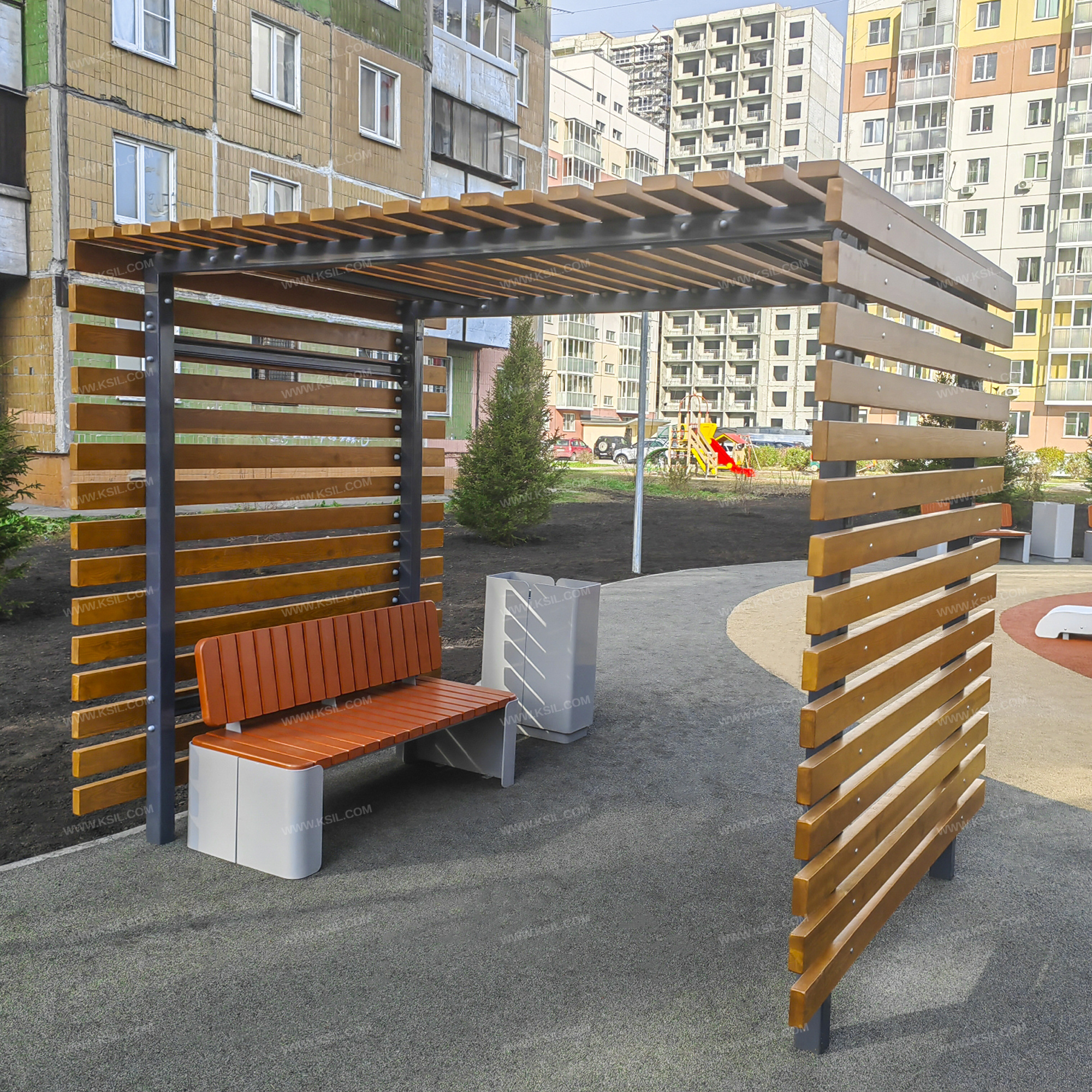 Пергола представляет собой устойчивую конструкцию, предназначенную для комфортного отдых на открытом воздухе, обеспечивающую защиту пользователя от воздействия солнечных лучей и атмосферных осадков, но не являющуюся оборудованием детской игровой площадки. Пергола должна состоять из металлического каркаса в виде стоек, балок крыши и поперечных балок. По бокам, и с верху обшита настилом. Настил должен состоять из деревянных досок хвойных пород, сечением не менее 40х100 мм.Стойки и балки крыши должны быть выполнены из профильной трубы сечением не менее 80х80 мм, к стойкам и балкам приварены фланцы выполнены из металлических пластин толщиной не менее 3 мм. Поперечные балки выполнены из швеллера 65х36х4,4 мм и металлических пластин толщиной не менее 4 мм.