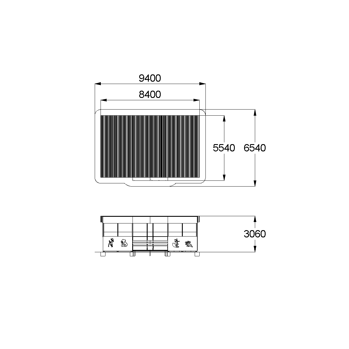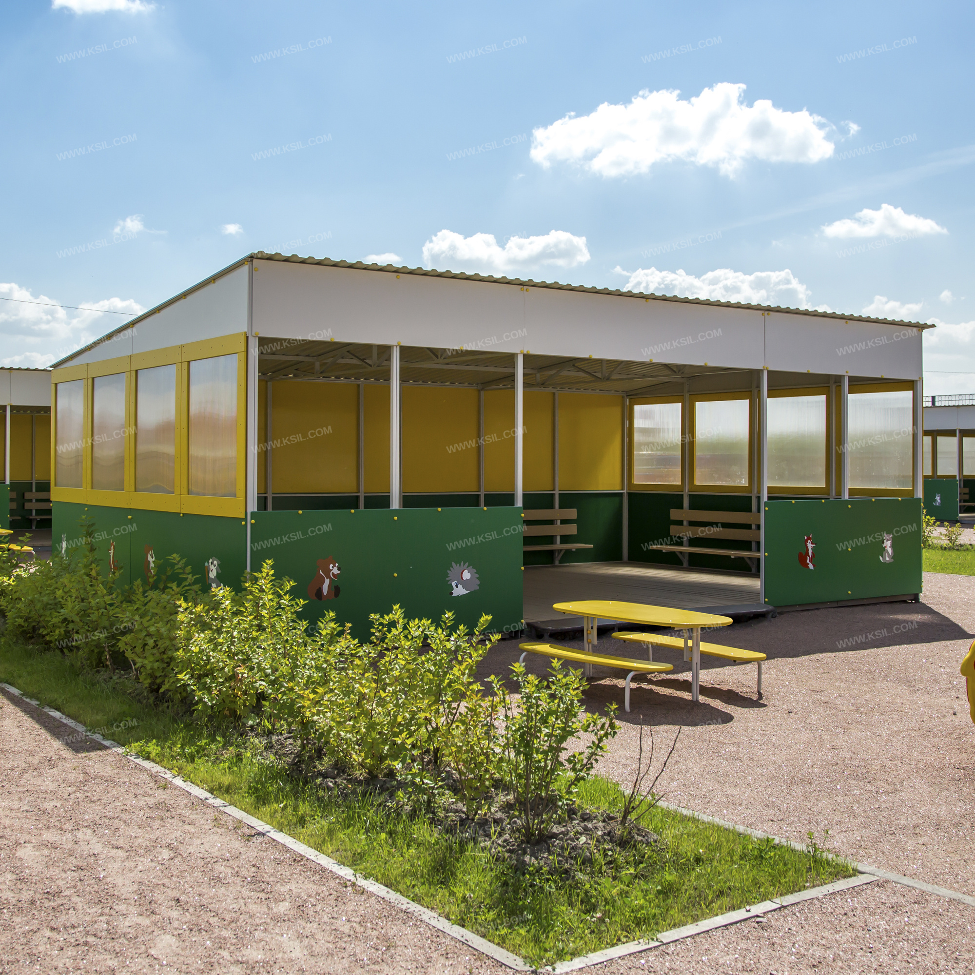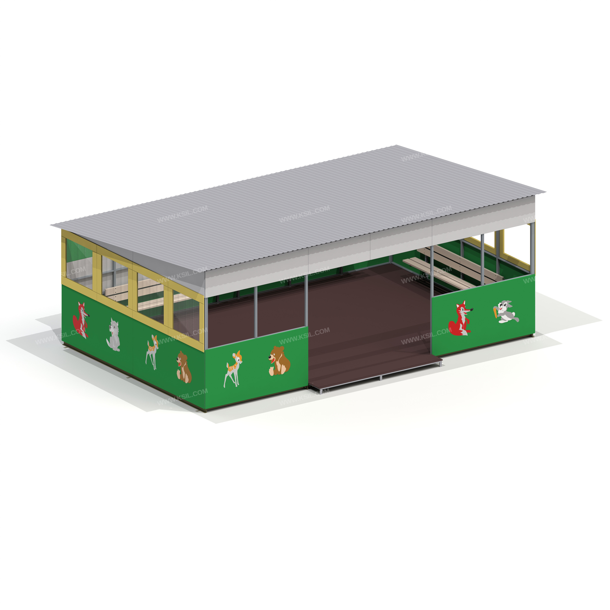 Навес должен представлять собой устойчивую конструкцию обеспечивающую защиту от воздействия солнечных лучей и атмосферных осадков.Навес в тематике лесных животных должен состоять из: крыши, покатую на одну сторону и оснащенной стропильной системой выполненной из металлического каркаса с наклонным скатом покрытым кровельным профилированным листом С-20 толщиной не менее 0,6 мм, своды крыши должны быть оснащены фронтонами из влагостойкой окрашенной фанеры толщиной не менее 15 мм; каркаса рам из металлической трубы сечением не менее 50х25 мм, пола из деревянной доски толщиной не менее 40 мм, стенок из влагостойкой фанеры толщиной не менее 15 мм. Под кровлей должны быть установлены скамейки, расположенные вдоль стенок. К главному входу должна крепиться ступенька, настил которой выполнен из влагостойкой противоскользящей фанеры толщиной не менее 21 мм, окна выполнены из сотового поликарбоната толщиной 6 мм и наличников из фанеры толщиной 15 мм.