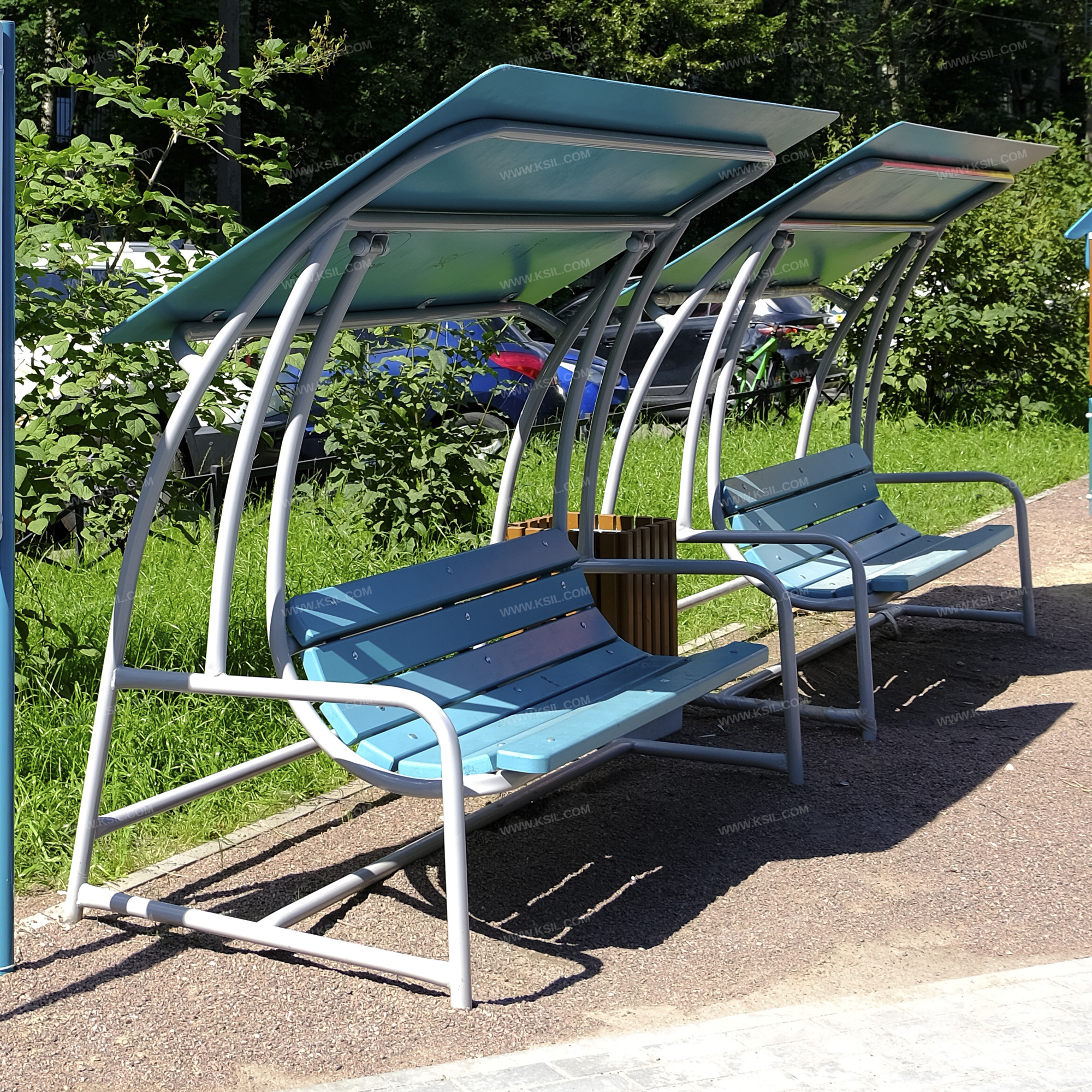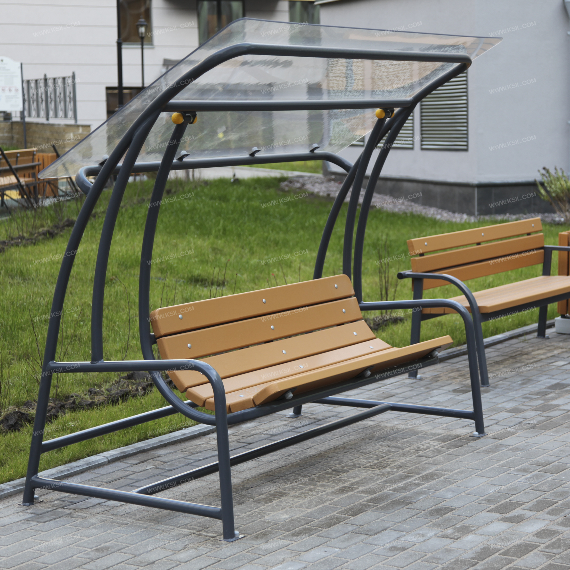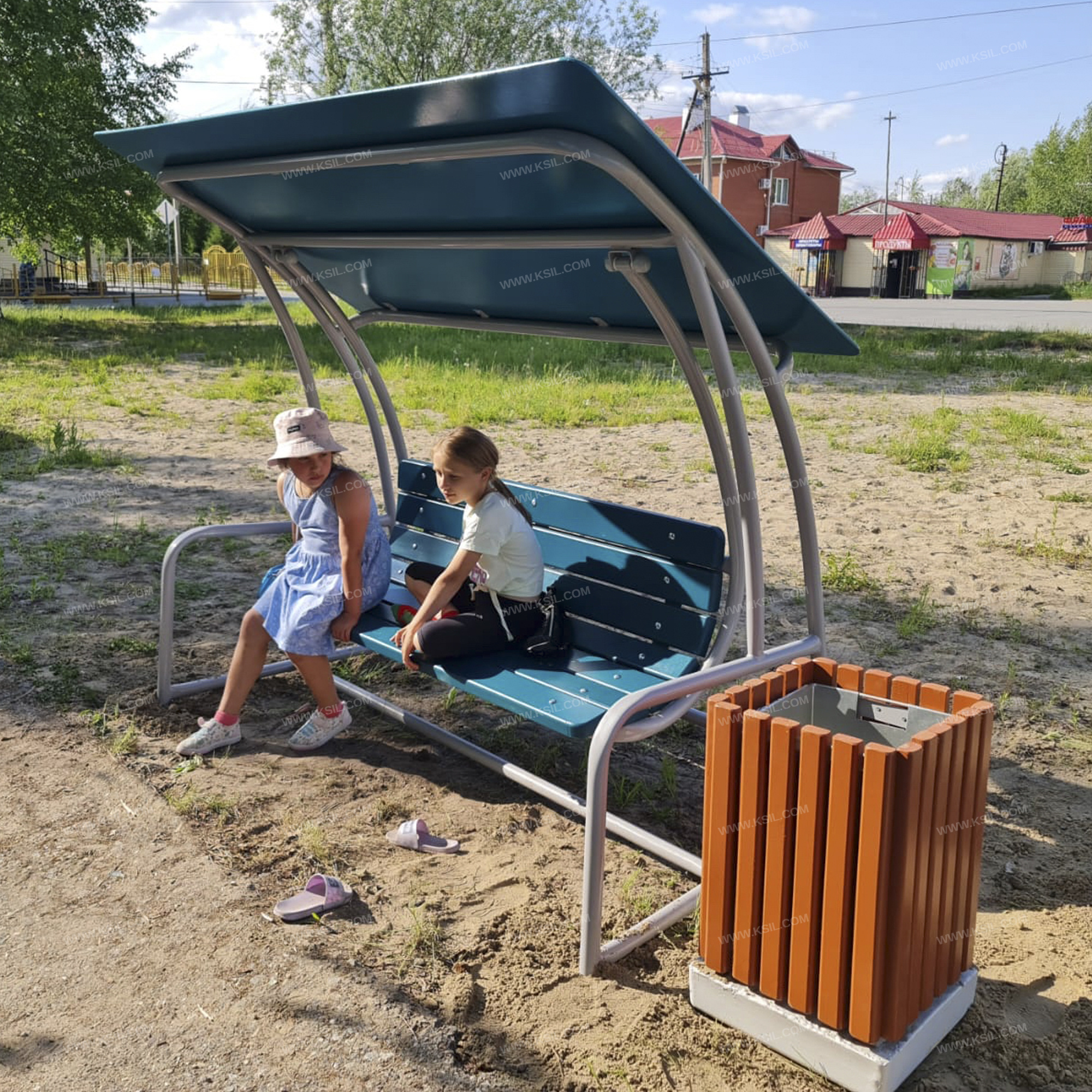 Оборудование должно представлять собой устойчивую конструкцию, предназначенную для отдыха на открытом воздухе и состоять из каркаса, сиденья со спинкой, подвеса и навеса. Каркас и подвес сиденья должны быть выполнены из металлической трубы диаметром не менее 42 мм. Качание подвеса должно быть реализовано на капролоновых элементах скольжения. Сиденье со спинкой должно быть выполнено из деревянных досок сечением не менее 90х40 мм и сечением не менее 110х40 мм. Крыша навеса должна быть выполнена из влагостойкой фанеры толщиной не менее 9 мм.