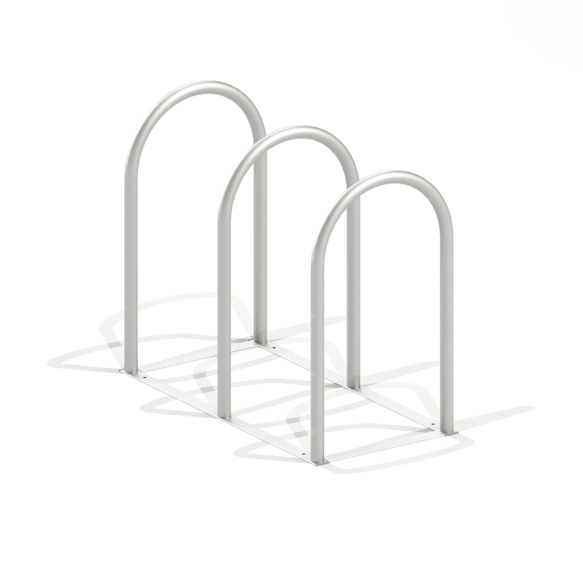 Стойка для парковки велосипеда оцинкованная представляет собой сварной металлический каркас из 3-х дуговых секций, выполненных из металлической трубы диаметром не менее 21 мм и основания из профильной трубы сечением не менее 50х25 мм с отверстиями для крепления к опорной поверхности.