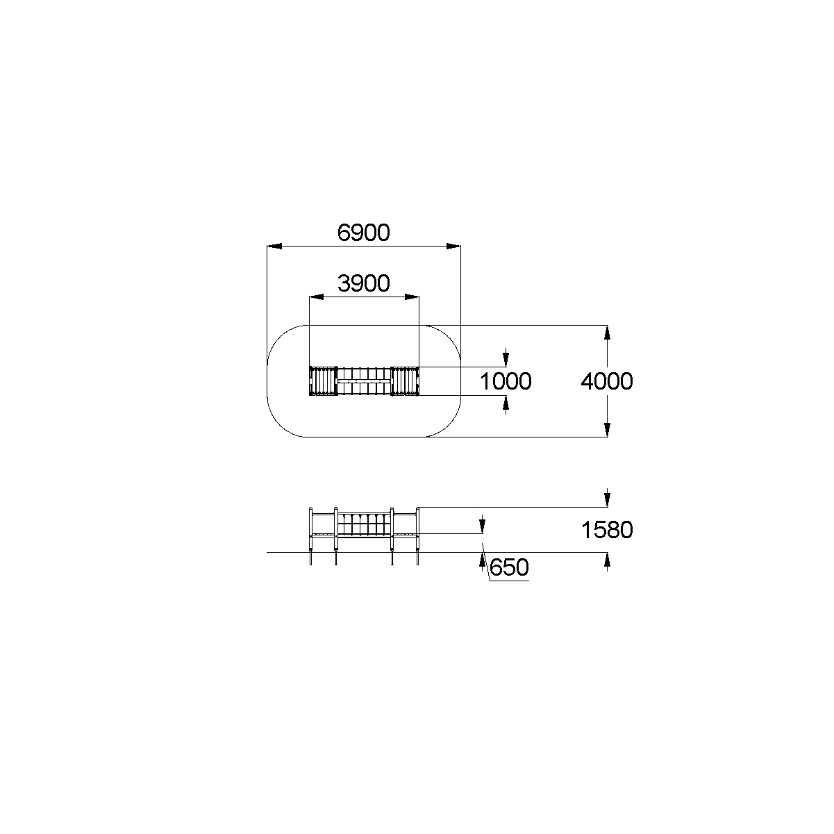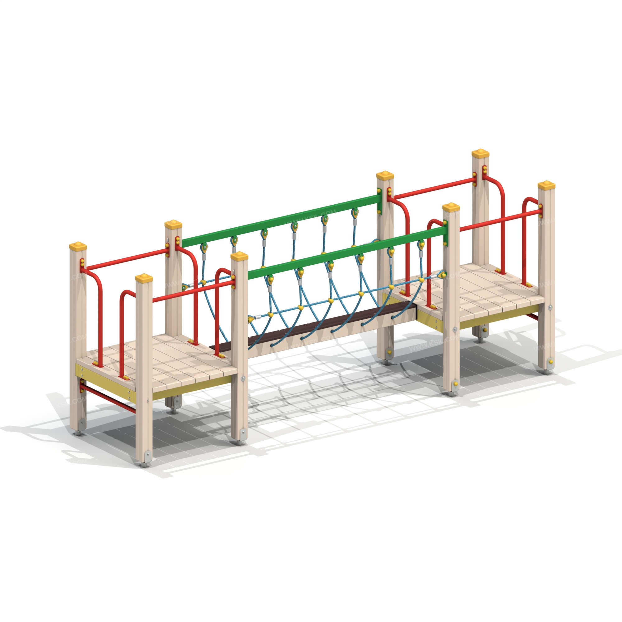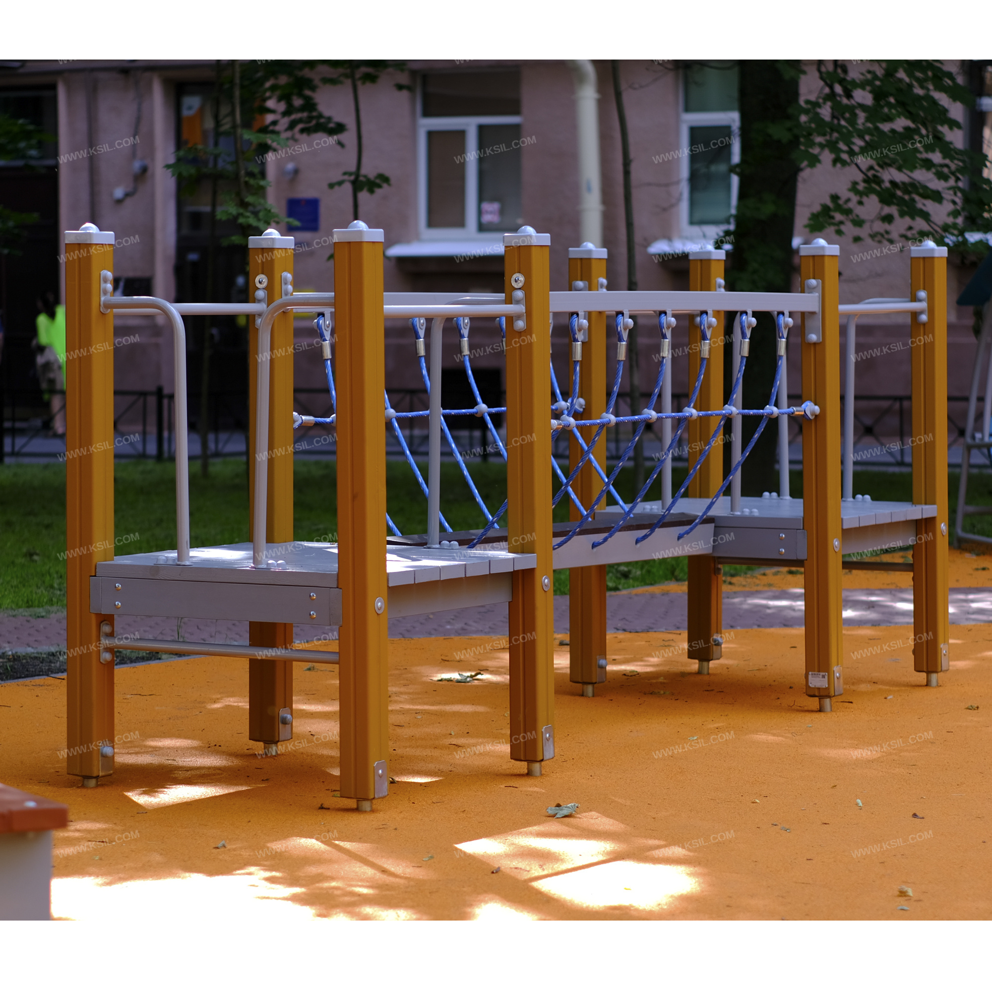 Спортивный комплекс должен представлять собой модульную сборно-разборную конструкцию и состоять из 2-х последовательно расположенных башен, соединенных между собой подвесным мостом с бревном.К башне 1 и к башне 2 должны быть пристроены: перекладины, поручни с двух сторон. Несущие столбы комплекса должны быть выполнены из клееного деревянного бруса сечением не менее 100х100 мм и иметь скругленный профиль с канавкой посередине. Сверху столб должен заканчиваться пластиковой заглушкой, снизу столб должен заканчиваться металлическим оцинкованным подпятником диаметром не менее 42 мм, который бетонируется в землю.Пол башен должен быть выполнен из деревянной доски толщиной не менее 40 мм.Перекладины, поручни должны быть выполнены из металлической трубы диаметром не менее 33 мм. Подвесной мост с бревном должен представлять собой конструкцию из бревна сечением не менее 130х130 мм и перил из металлической трубы сечением не менее 60х30 мм и полипропиленового каната.