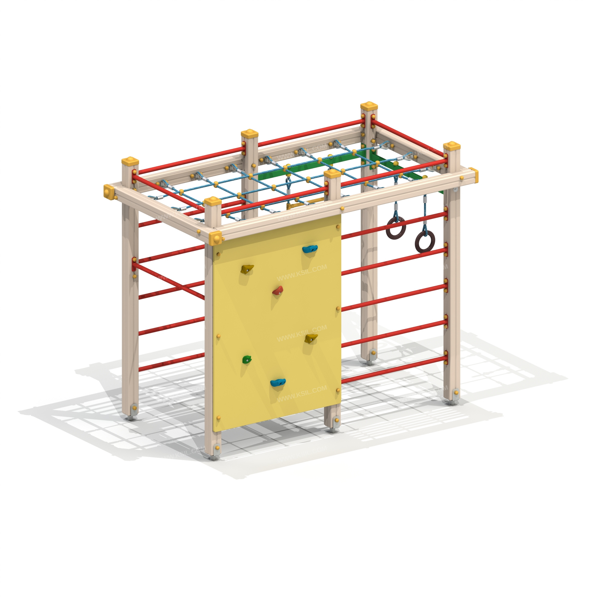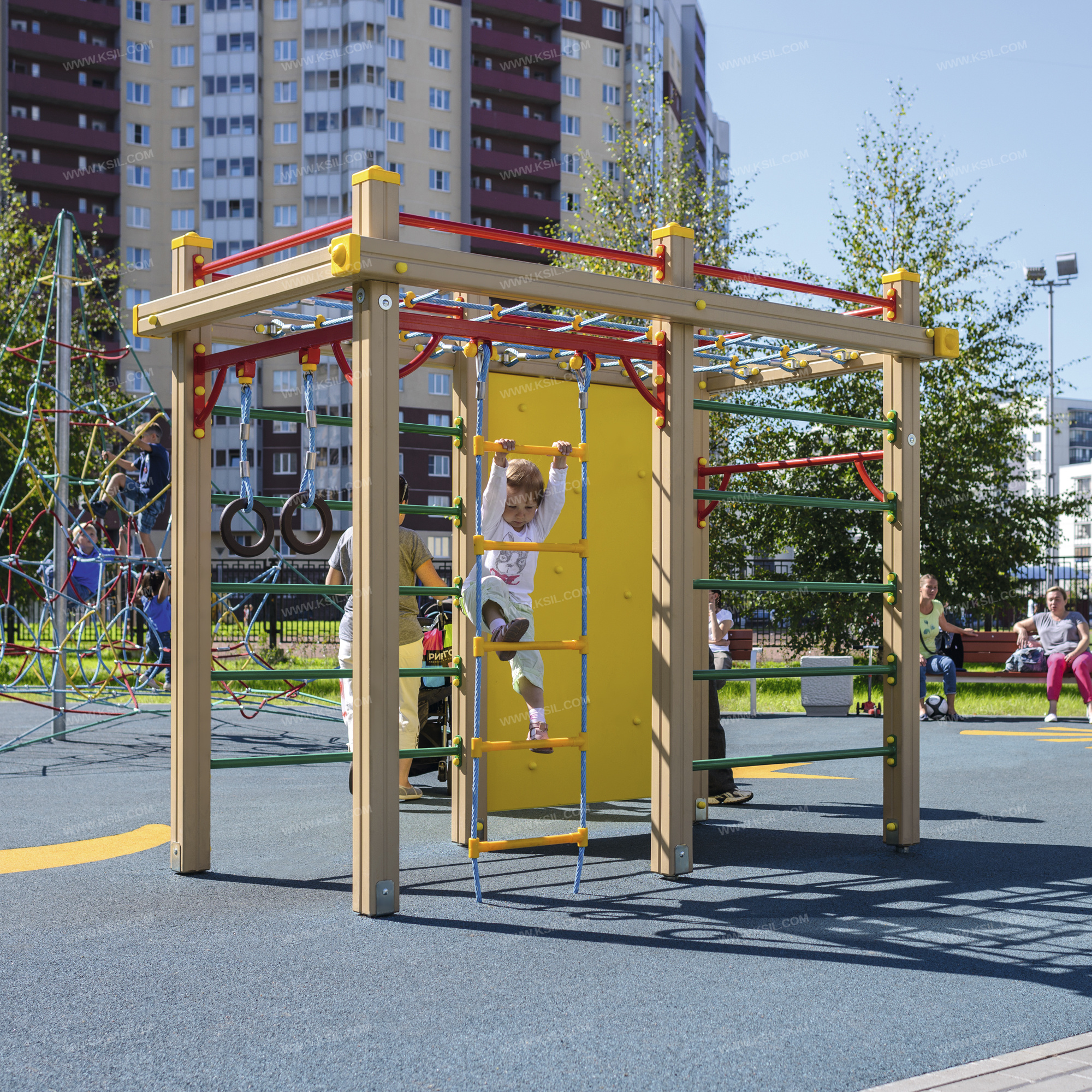 Спортивный комплекс должен представлять собой устойчивую модульную сборно-разборную конструкцию, состоящую из несущих столбов, установленных в два ряда, параллельно друг другу и соединенные в верхней части горизонтальными столбами. В каждом ряду несущие стойки в верхней части должны быть соединены балками. В верхней части должна быть расположена полипропиленовая сетка, проемы спортивного комплекса должны быть оснащены: шведскими стенками, гимнастическими кольцами, гибкой лестницей, альпинисткой стенкой с зацепами, перекладиной с раскосами.Несущие вертикальные и горизонтальные столбы комплекса должны быть выполнены из клееного деревянного бруса сечением не менее 100х100 мм и иметь скругленный профиль с канавкой посередине. Сверху вертикальный столб должен заканчиваться пластиковой заглушкой, снизу столб должен заканчиваться металлическим оцинкованным подпятником диаметром не менее 42 мм, который бетонируется в землю.Гибкая лестница должна состоять из армированного полипропиленового каната и пластиковых ступенек, закрепленных на металлической профильной трубе диаметром не менее 50х25 мм с раскосами.Перекладина с гимнастическими кольцами должна быть выполнена из металлической профильной трубы сечением не менее 50х25 мм, гибкой подвески и колец из влагостойкой фанеры или пластика. Балки, перекладины, раскосы, перекладины шведской стенки должны быть выполнены из металлической трубы диаметром не менее 33 мм. Альпинистская стенка с зацепами должна быть выполнена из влагостойкой фанеры толщиной не менее 21 мм.