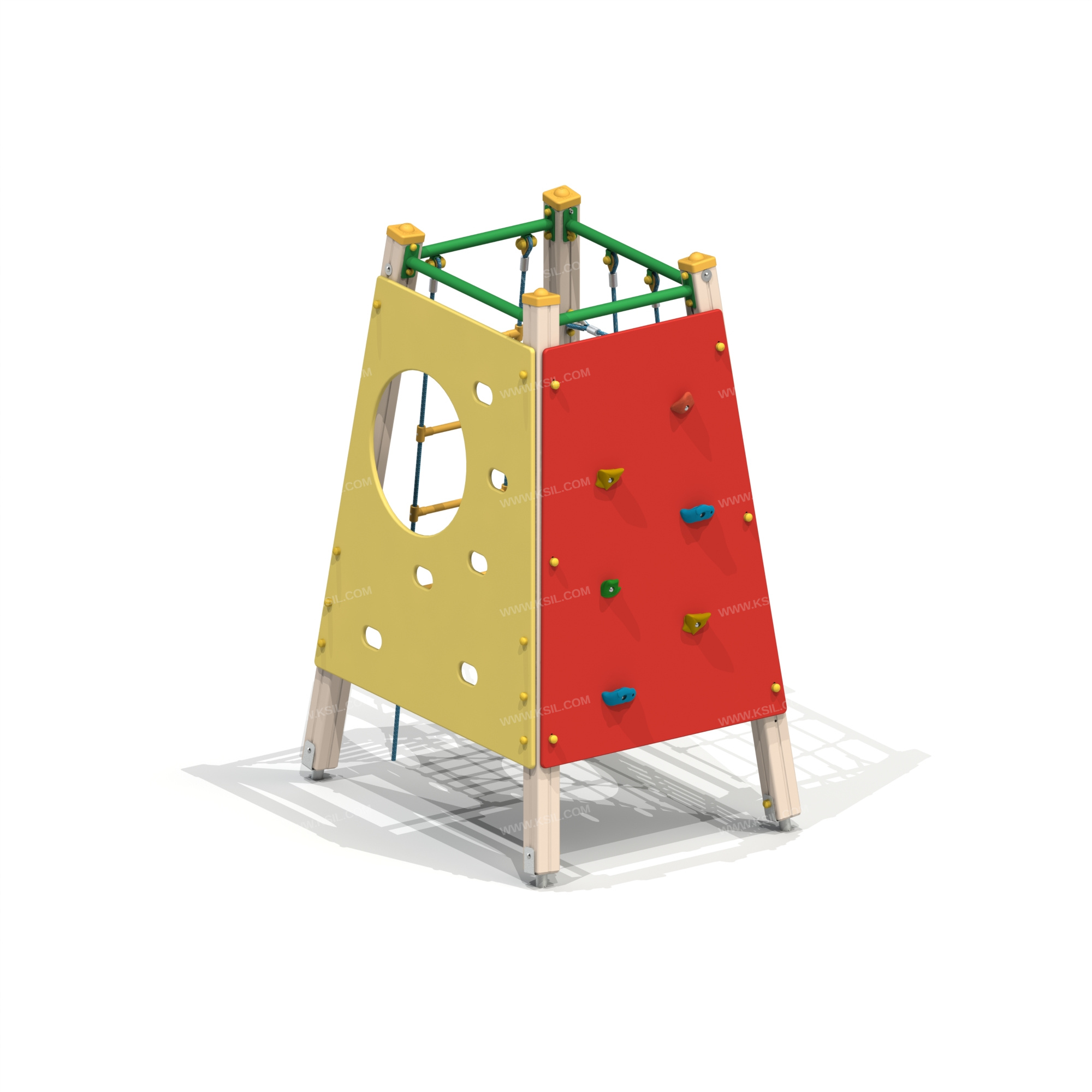 Спортивный комплекс должен быть представлен в виде усеченной пирамиды и состоять из полипропиленовой сетки трапеции, гибкой лестницы и 2-х альпинистских стенок.Несущие столбы комплекса должны быть выполнены из клееного деревянного бруса сечением не менее 100х100 мм и иметь скругленный профиль с канавкой посередине. Сверху вертикальный столб должен заканчиваться пластиковой заглушкой, снизу столб должен заканчиваться металлическим оцинкованным подпятником диаметром не менее 42 мм, который бетонируется в землю. Несущие столбы в верхней части должны быть соединены балками.Альпинистские стенки, одна из которых с круглым вырезом и с отверстиями для рук и ног, другая с зацепами должны быть выполнены из влагостойкой фанеры толщиной не менее 21 мм.Гибкая лестница должна состоять из армированного полипропиленового каната Ø 16мм с пластиковыми ступеньками и крепиться к балке. Балки должны быть выполнены из металлической трубы диаметром не менее 42 мм.