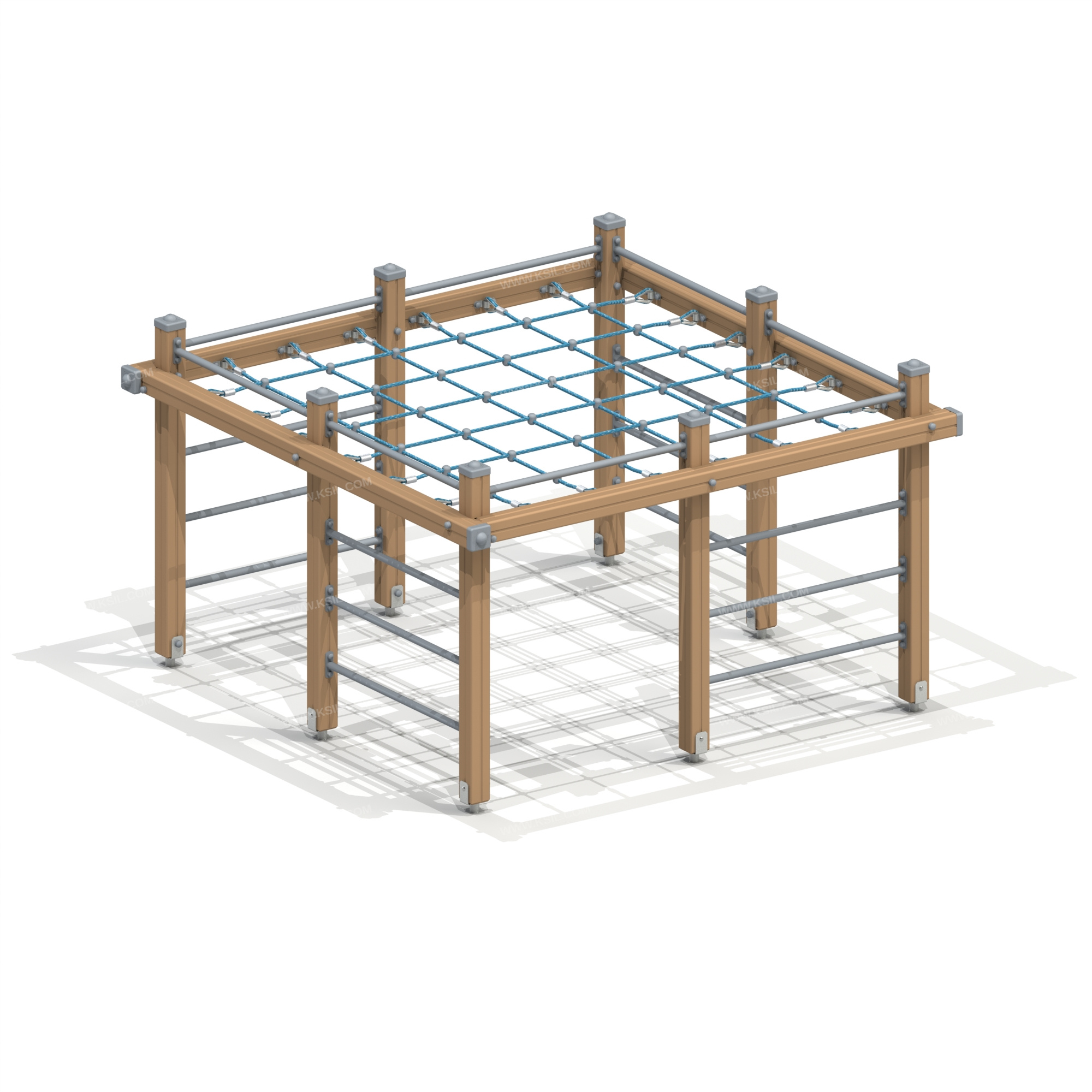 Спортивный комплекс должен представлять собой конструкцию, состоящую из несущих столбов, установленных в три ряда, параллельно друг другу. В крайних рядах должно быть по три несущих столба, расположенных на равном расстоянии друг от друга, в среднем ряду по два столба. В каждом ряду несущие столбы в верхней части должны быть соединены балками и горизонтальными столбами. В верхней части должна быть расположена полипропиленовая сетка, проемы гимнастического комплекса должны быть оснащены: шведскими стенками.Несущие вертикальные и горизонтальные столбы комплекса должны быть выполнены из клееного деревянного бруса сечением не менее 100х100 мм и иметь скругленный профиль с канавкой посередине. Сверху столб должен заканчиваться пластиковой заглушкой, снизу столб должен заканчиваться металлическим оцинкованным подпятником диаметром не менее 42 мм, который бетонируется в землю.Балки, перекладины шведской стенки должны быть выполнены из металлической трубы диаметром не менее 33 мм. Натяжная сетка должна быть выполнена из полипропиленового 6-прядного армированного металлом каната тросовой свивки с резиновым сердечником, канат сетки должен быть диаметром не менее 16 мм и соединен между собой пластиковыми креплениями овальной формы.