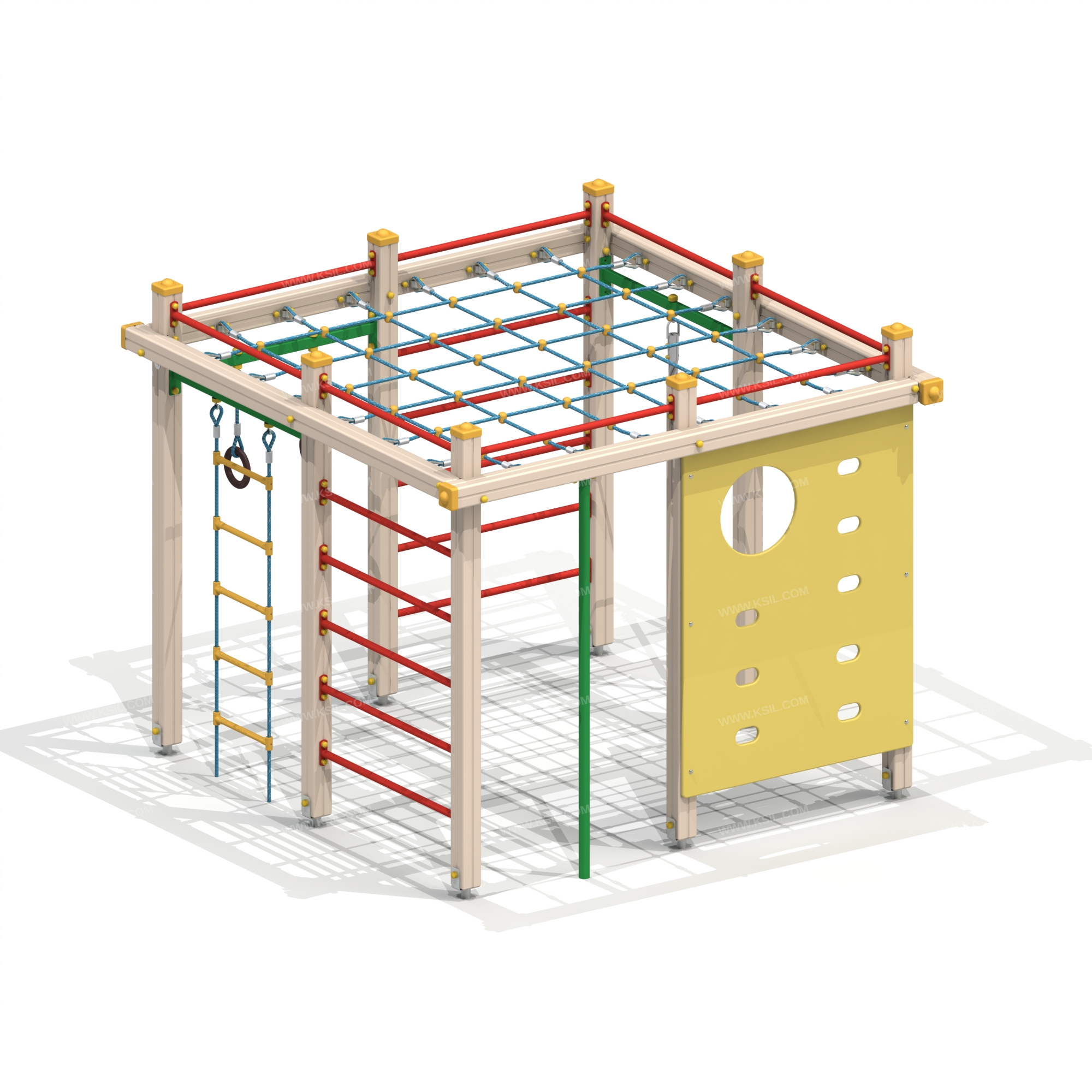 Спортивный комплекс должен представлять собой конструкцию, состоящую из несущих столбов, установленных в три ряда, параллельно друг другу. В крайних рядах должно быть по три несущих столба, расположенных на равном расстоянии друг от друга, в среднем ряду по два столба. В каждом ряду несущие столбы в верхней части должны быть соединены балками и горизонтальными столбами. В верхней части должна быть расположена полипропиленовая сетка, проемы гимнастического комплекса должны быть оснащены: шведскими стенками, гимнастическими кольцами, гибкой лестницей, вертикальным шестом, канатом, перекладиной с раскосами и альпинистской стенкой для лазания с отверстиями для рук и ног и круглым вырезам.Несущие вертикальные и горизонтальные столбы комплекса должны быть выполнены из клееного деревянного бруса сечением не менее 100х100 мм и иметь скругленный профиль с канавкой посередине. Сверху столб должен заканчиваться пластиковой заглушкой, снизу столб должен заканчиваться металлическим оцинкованным подпятником диаметром не менее 42 мм, который бетонируется в землю.Альпинистская стенка должна быть выполнена из влагостойкой фанеры толщиной не менее 21 мм.Канат должен быть полиамидный или полипропиленовый диаметром не менее 40 мм и подвешен на перекладине, выполненной из профильной трубы сечением не менее 50х25 мм с раскосами.Перекладина с гимнастическими кольцами должна быть выполнена из металлической профильной трубы сечением не менее 50х25 мм, гибкой подвески и колец из влагостойкой фанеры или пластика. Вертикальный шест должен быть выполнен из металлической трубы диаметром не менее 42 мм. Нижняя часть шеста бетонируется в землю. Гибкая лестница должна состоять из армированного полипропиленового каната и пластиковых ступенек, закрепленных на металлической профильной трубе диаметром не менее 50х25 мм.Балки, перекладины, раскосы, перекладины шведской стенки должны быть выполнены из металлической трубы диаметром не менее 33 мм. Натяжная сетка должна быть выполнена из полипропиленового 6-прядного армированного металлом каната тросовой свивки с резиновым сердечником, канат сетки должен быть диаметром не менее 16 мм и соединен между собой пластиковыми креплениями овальной формы.