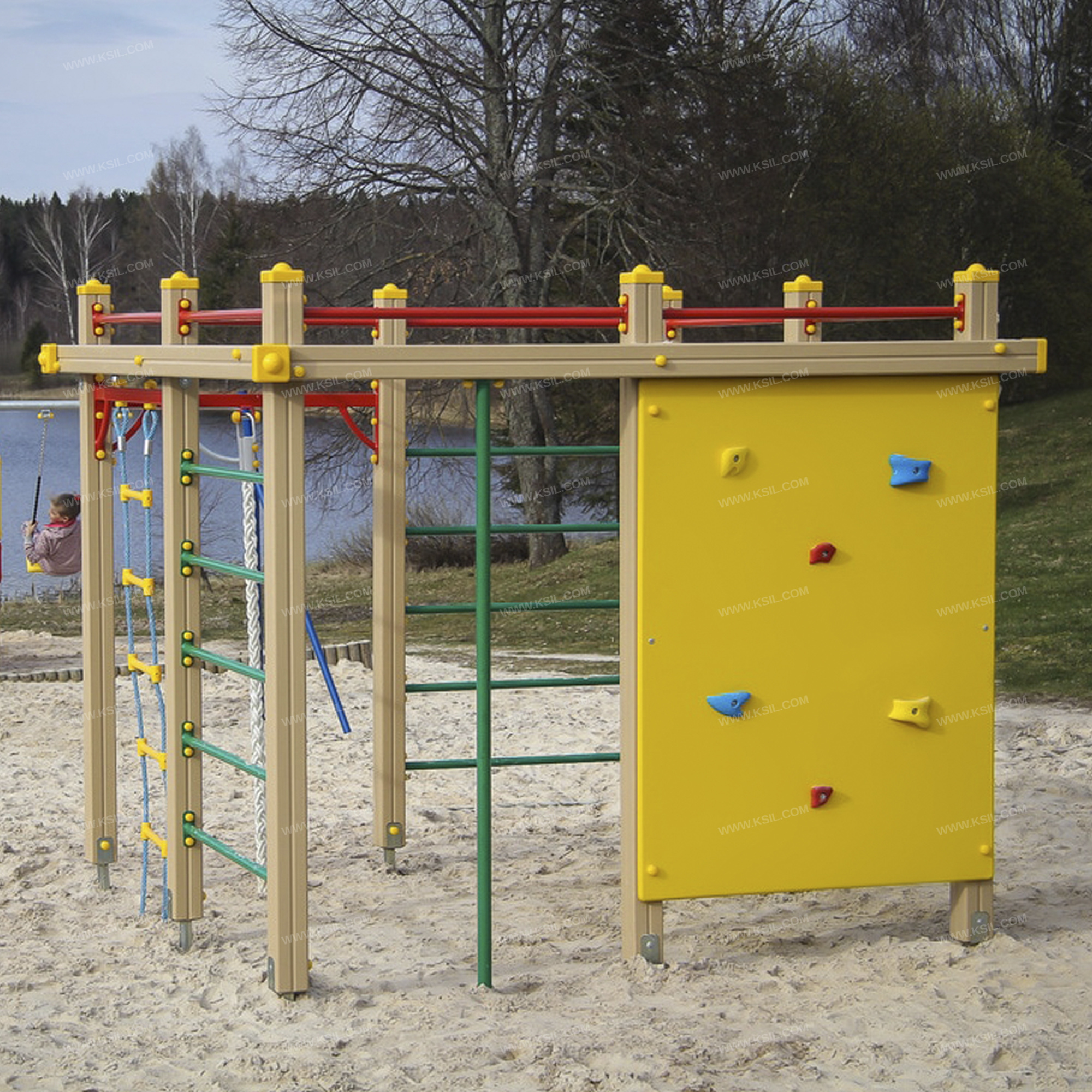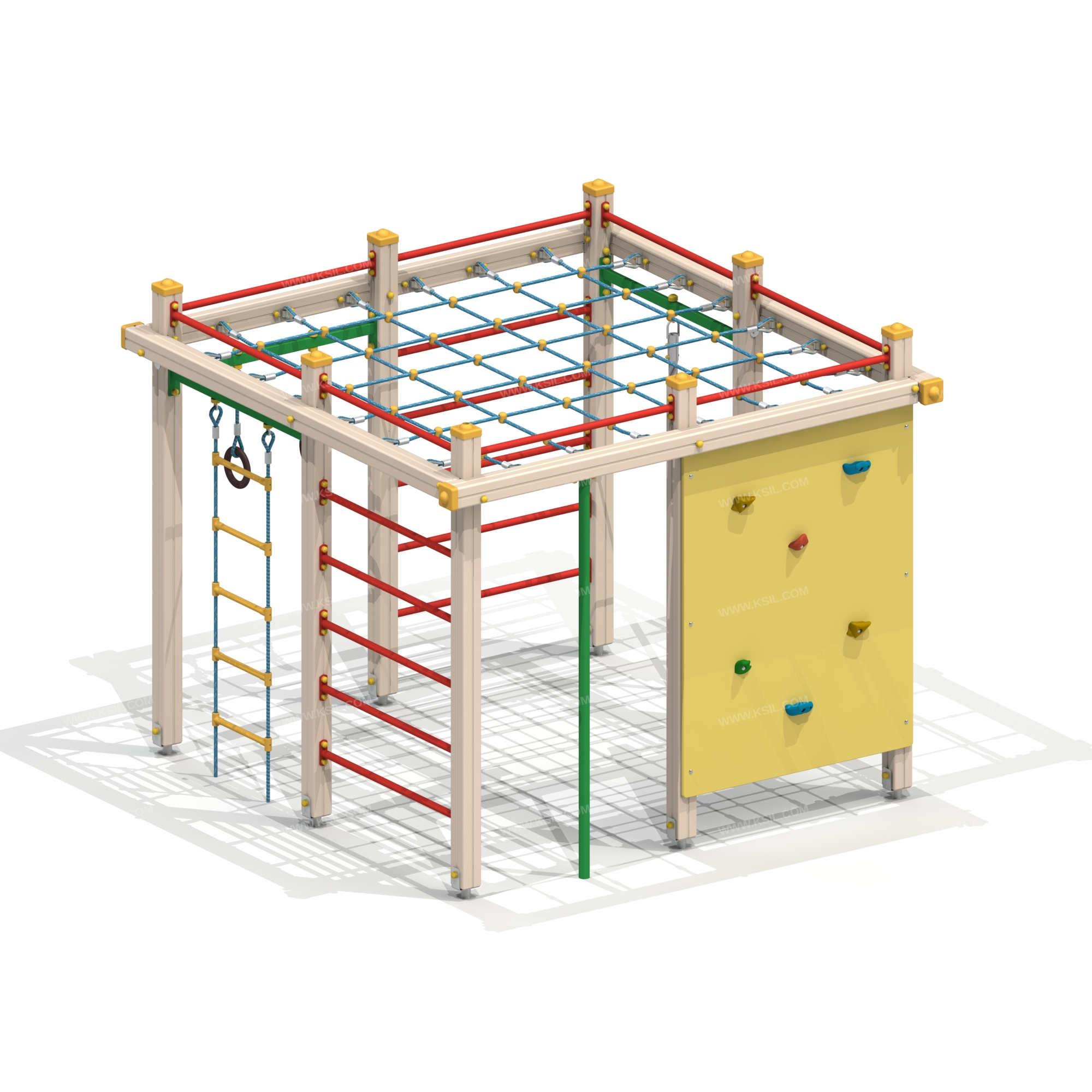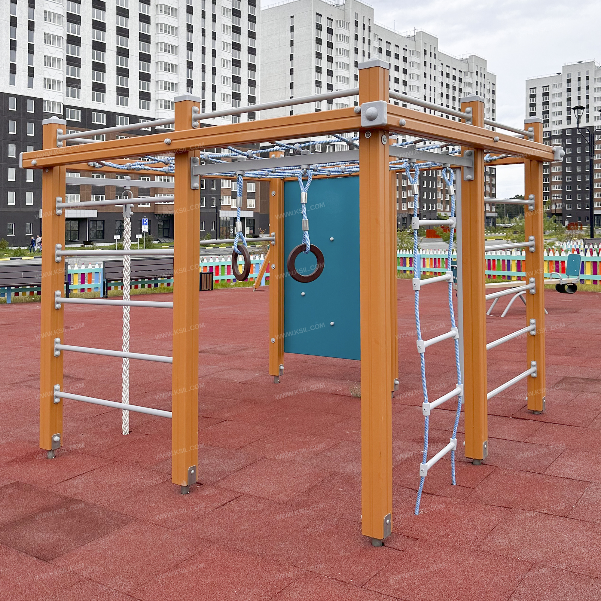 В крайних рядах должно быть по три несущих столба, расположенных на равном расстоянии друг от друга, в среднем ряду по два столба. В каждом ряду несущие столбы в верхней части должны быть соединены балками и горизонтальными столбами. В верхней части должна быть расположена полипропиленовая сетка, проемы гимнастического комплекса должны быть оснащены: шведскими стенками, гимнастическими кольцами, гибкой лестницей, вертикальным шестом, канатом, перекладиной с раскосами и альпинистской стенкой для лазания с зацепами.